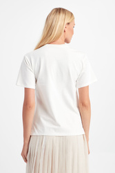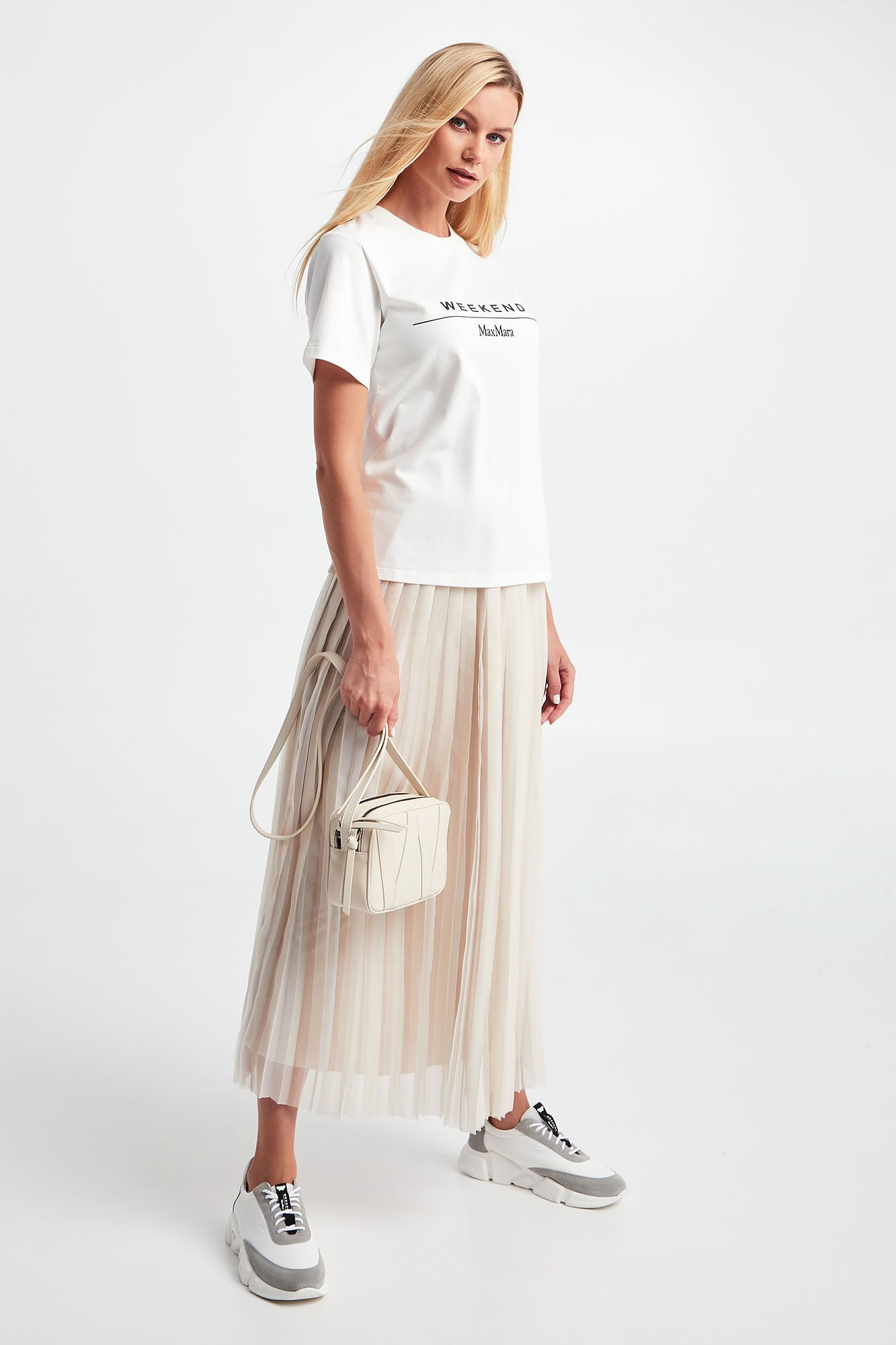 T-shirt marki Weekend Max Mara. Wykonany z czystej bawełna w białym kolorze. Fason typu regular fit. Z przodu zdobiony gumowym nadrukiem w postaci logo marki. Dekolt typu o-neck zakończony elastycznym ściągaczem. Krótkie, proste rękawki oraz dół wykończone lamówką. Z tyłu, na linii karku czarny monogram marki.