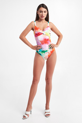 Strój kąpielowy marki Roidal w kolorze białym. Na całości wielokolorowy, nieregularny motyw. Jednoczęściowy model. Miękkie miseczki osłonięte kopertowymi zakładkami. Wycięcie na plecach. Regulowane ramiączka.