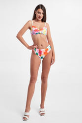 Dwuczęściowy strój kąpielowy marki Roidal. Na całości wielokolorowy wzór. Dół typu figi, wykończony elastycznym ściągaczem u góry. Góra miękka, wykończona ozdobnym marszczeniem. Regulowane ramiączka. Zapinana z tyłu za pomocą metalowego zapięcia.