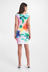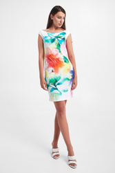 Sukienka plażowa marki Roidal w kolorze białym. Fason typu regualr fit, bez rękawów. Na całości wielokolorowy, nieregularny motyw. Na lewym ramiączku ściągacz z ozdobnymi troczkami. Idealne uzupełnienie plażowej stylizacji.