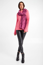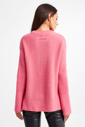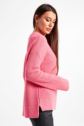 Sweter w kolorze różowym marki JOOP! Dekolt typu o-neck. Dekolt rękawy i dół swetra wykończony ściągaczem. Fason typu oversize z asymetrycznym krojem. Lekka metalowa, złota, sygnowana nazwą marki aplikacja na dole po lewej stronie.