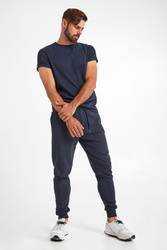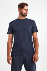 T-shirt marki Joop! w granatowym kolorze. Fason typu regular. Z przodu niewielki haft z nazwą marki w granatowym kolorze. Dekolt typu o-neck wykończony ściągaczem. Krótkie rękawy i dół wykończone przeszyciem. Wykonany z czystej, miękkiej, merceryzowanej bawełny .