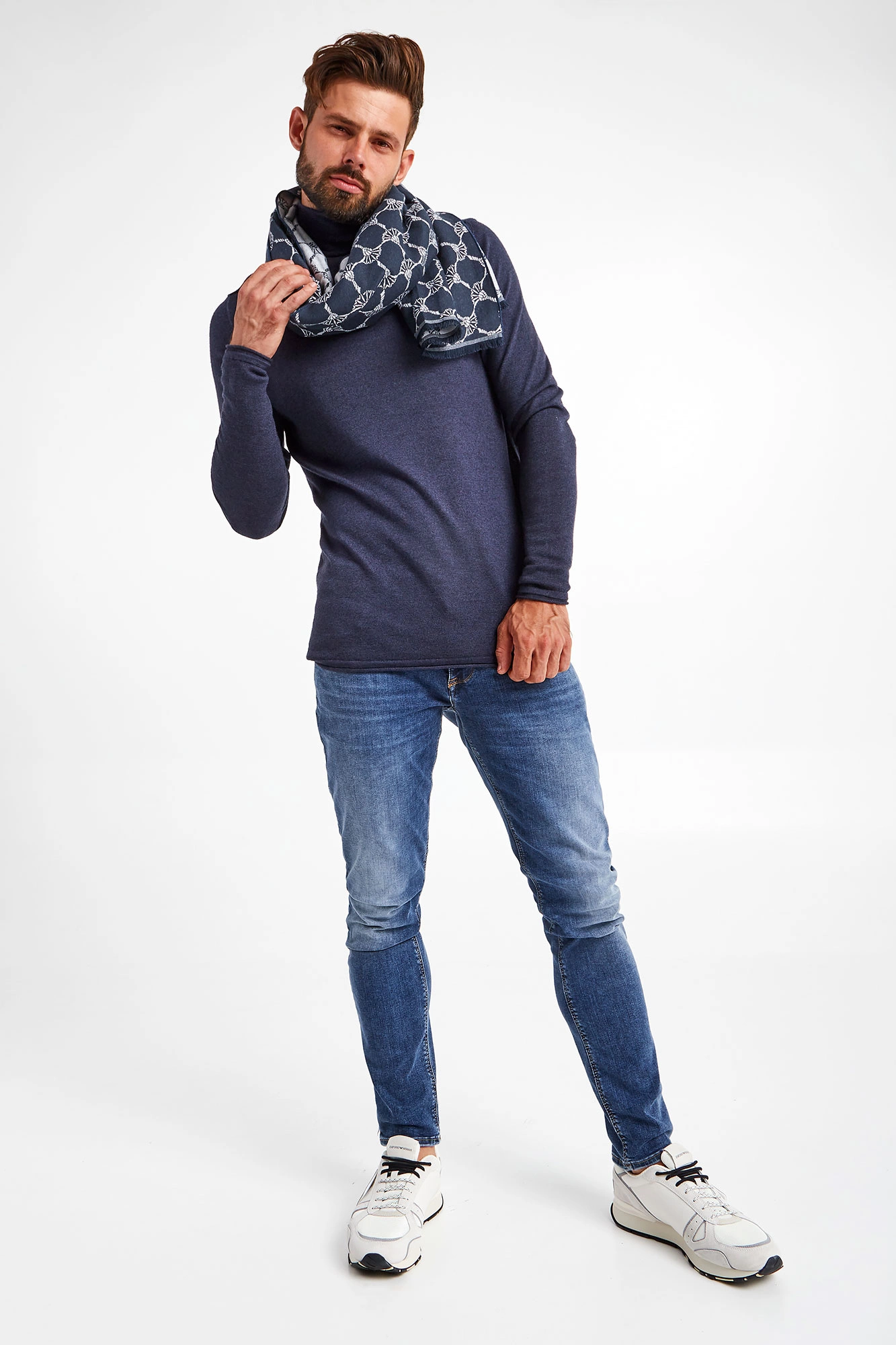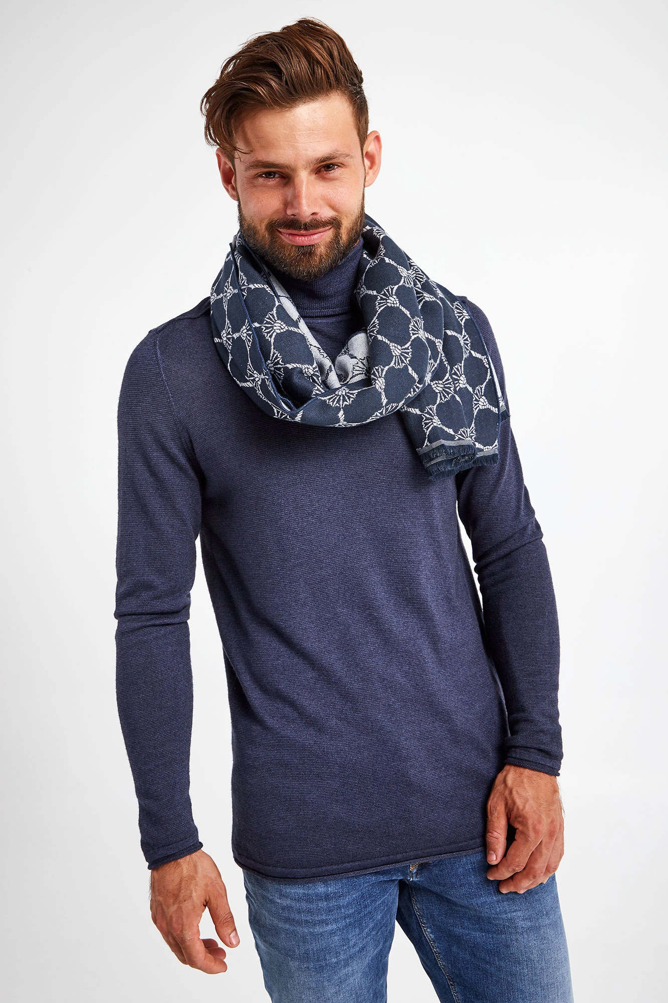 Klasyczny męski szal marki Joop! w granatowo-białym kolorze. Dwustronny. Na całości biały i granatowy wzór z logo marki. Krawędzie wykończone strzępieniami.