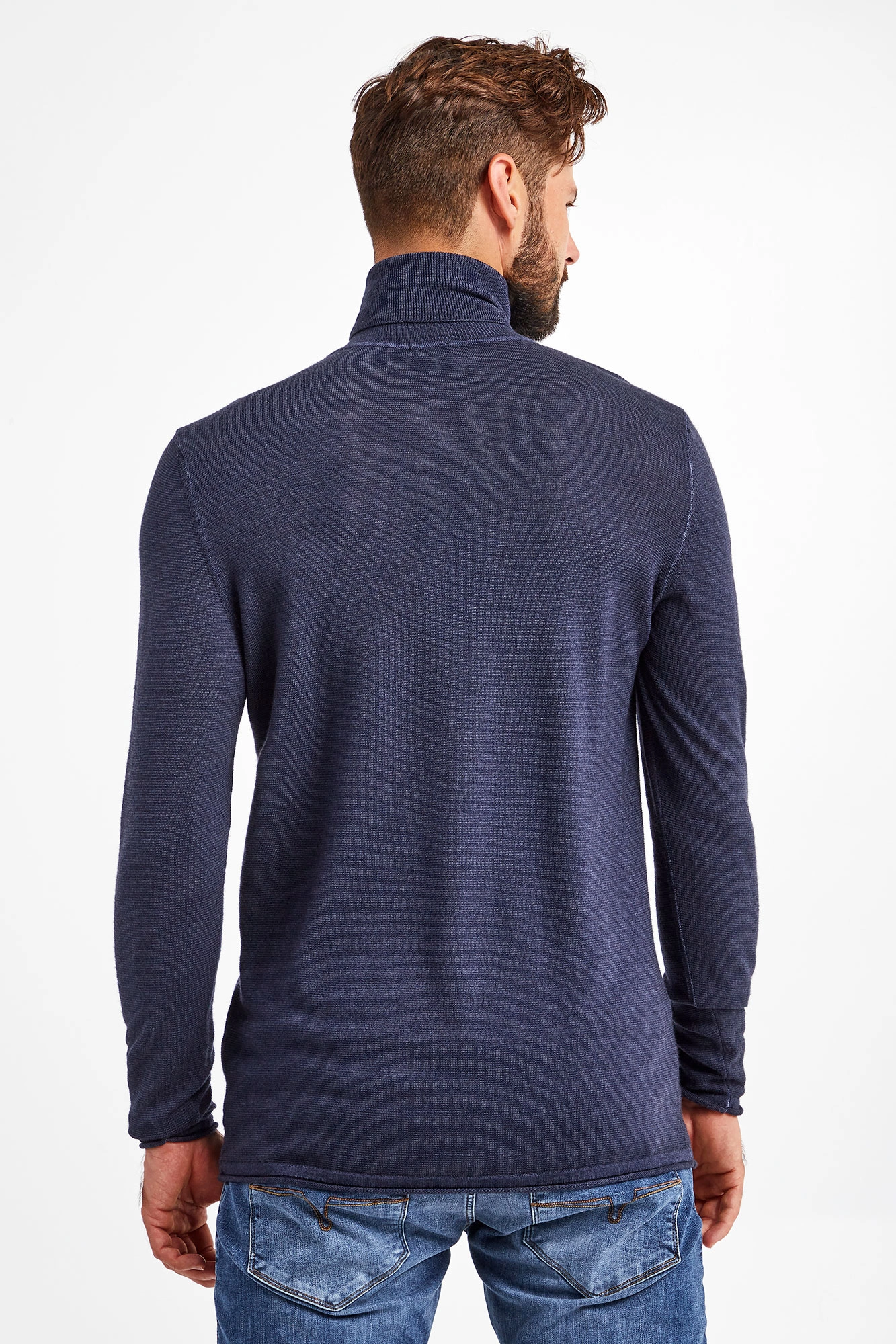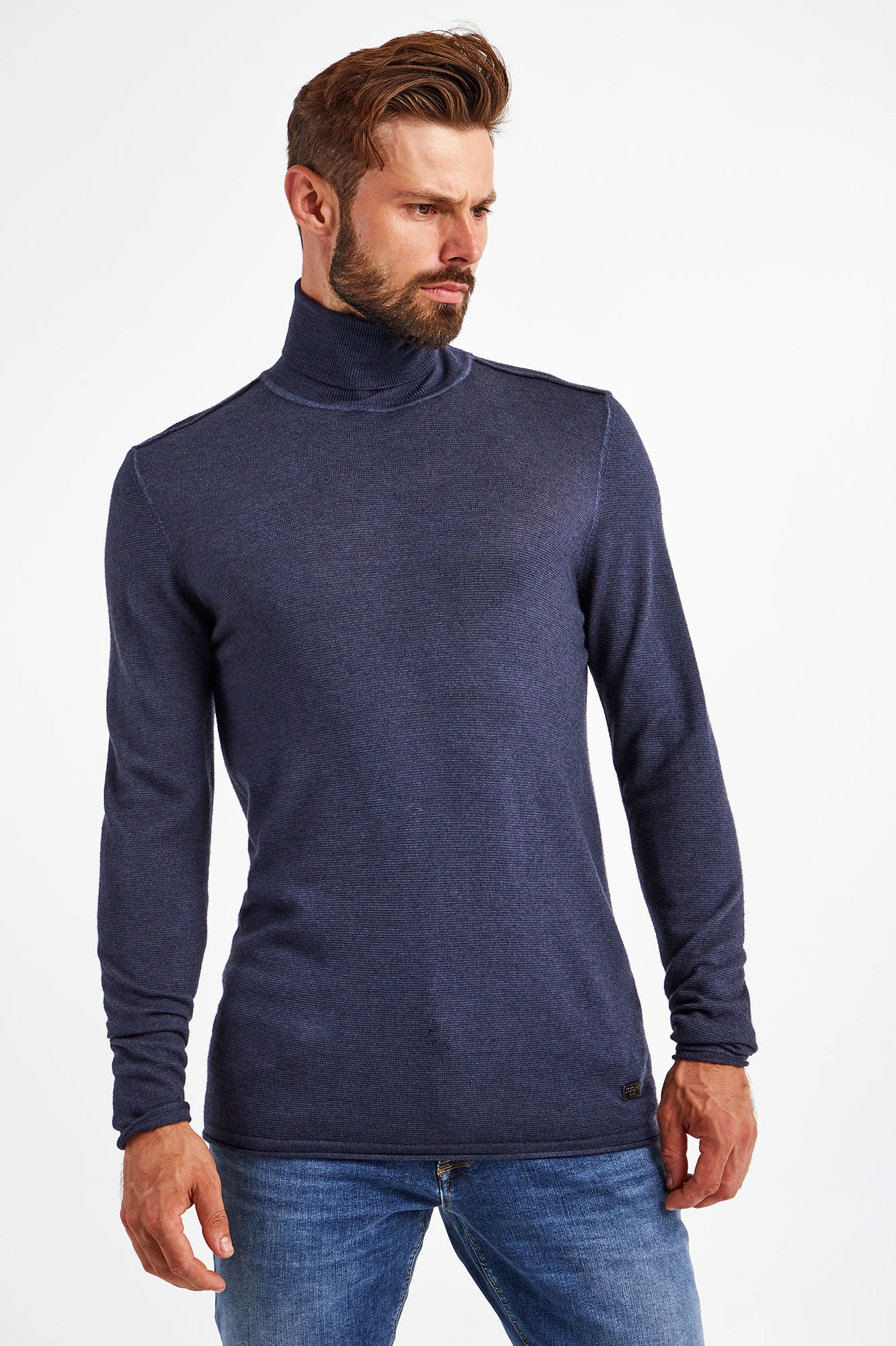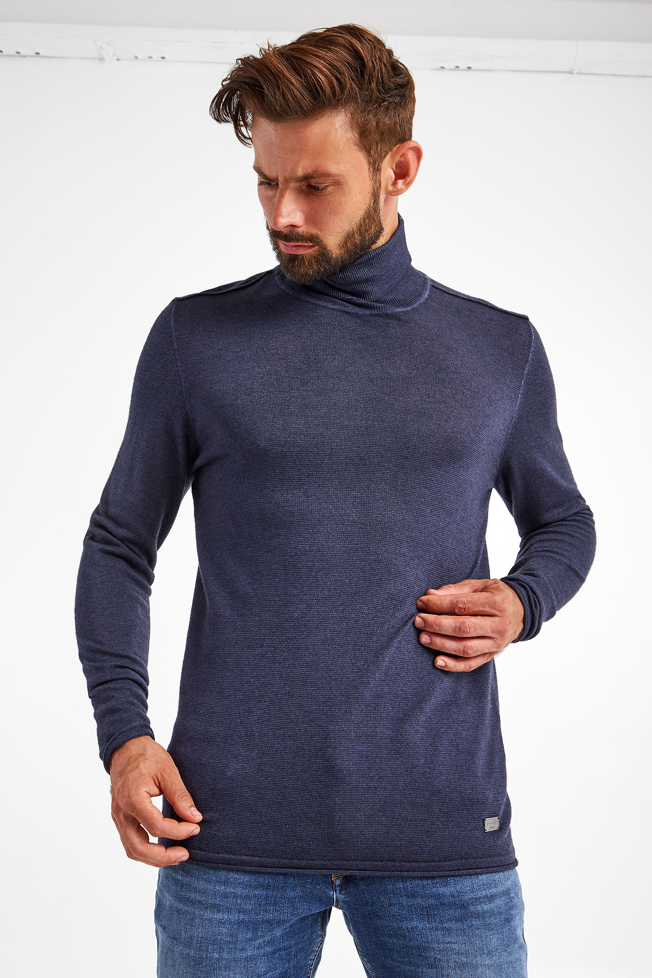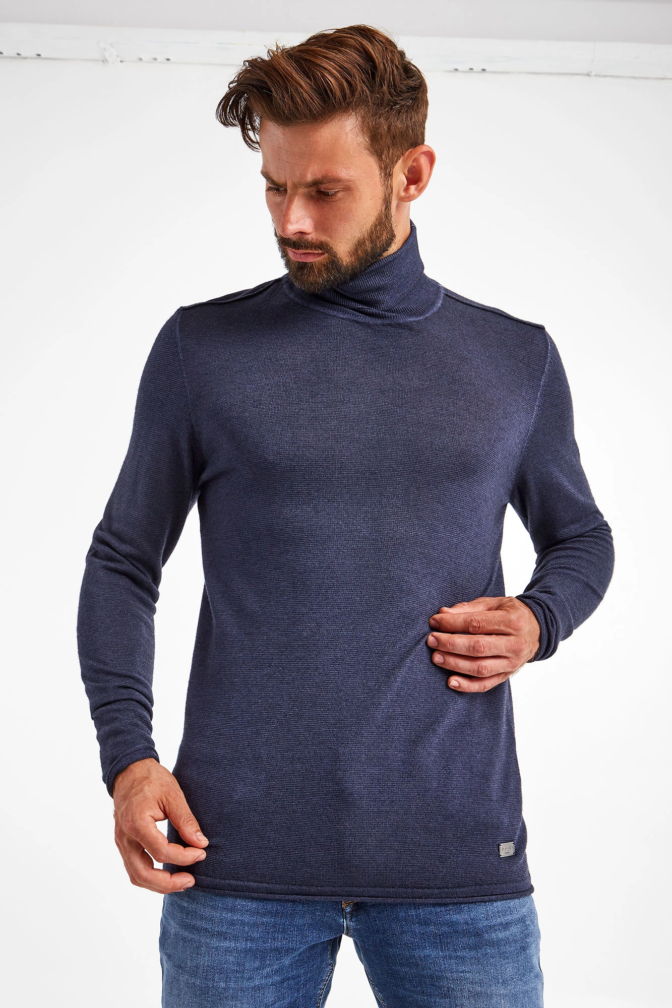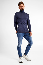 Klasyczny golf w kolorze granatowym marki Joop! Jeans. Z przodu metalowa aplikacja z nazwą marki. Kołnierz wywijany. Długie, przylegające rękawy i dół wykończone na surowo. Wykonany z czystej, stuprocentowej wełny dziewiczej. Uniwersalna propozycja w każdej męskiej garderobie.