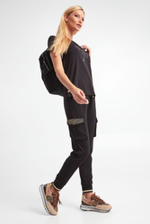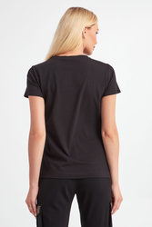 T-shirt marki Liu Jo Sport w czarnym kolorze. Dłuższy, prosty fason typu regular. Z przodu połyskujący nadruk z nazwą marki. Dekolt typu o-neck wykończony ściągaczem. Krótki rękaw i dół zakończony przeszyciem. Na dole po bokach ozdobne, sygnowane guziki. Wykonana z miękkiej, elastycznej bawełny.
