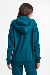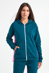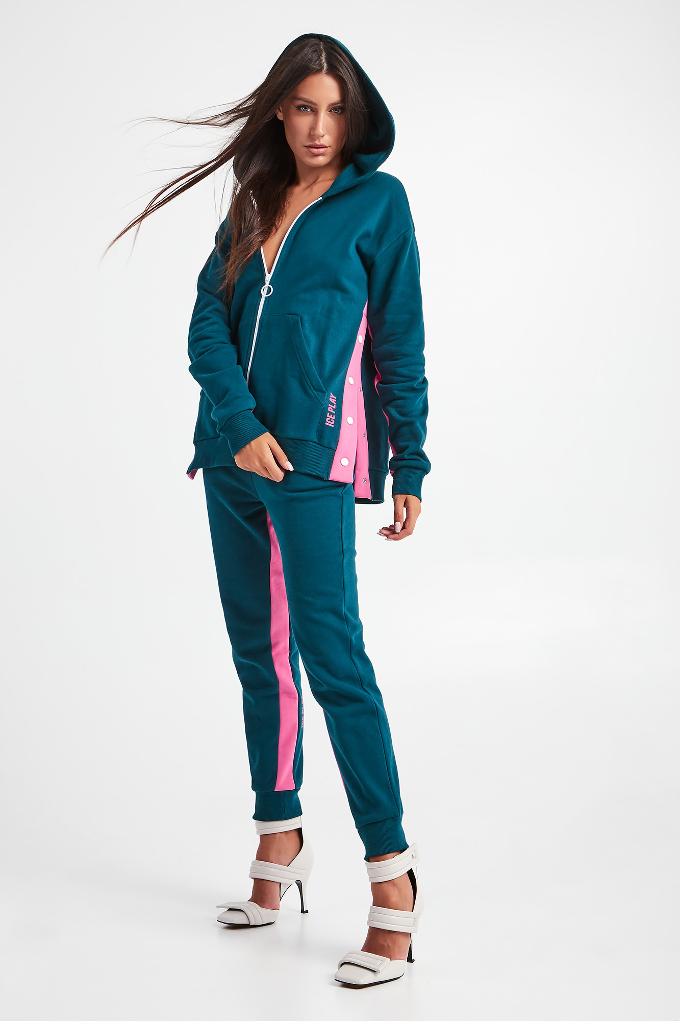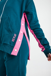 Bluza z kapturem marki Ice Play w kolorze butelkowej zieleni. Fason regular fit. Zapinana za pomocą białego zamka błyskawicznego. Dwie boczne, niezapinane kieszenie. Po bokach zapinane na napy, różowe rozcięcia. U dołu różowe logo. Rękawy i dół zakończone ściągaczami. Wykonana z czystej bawełny.