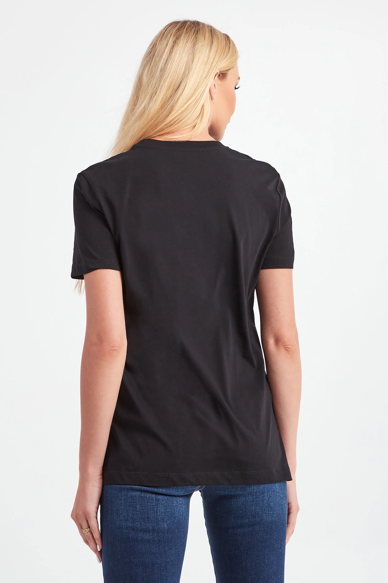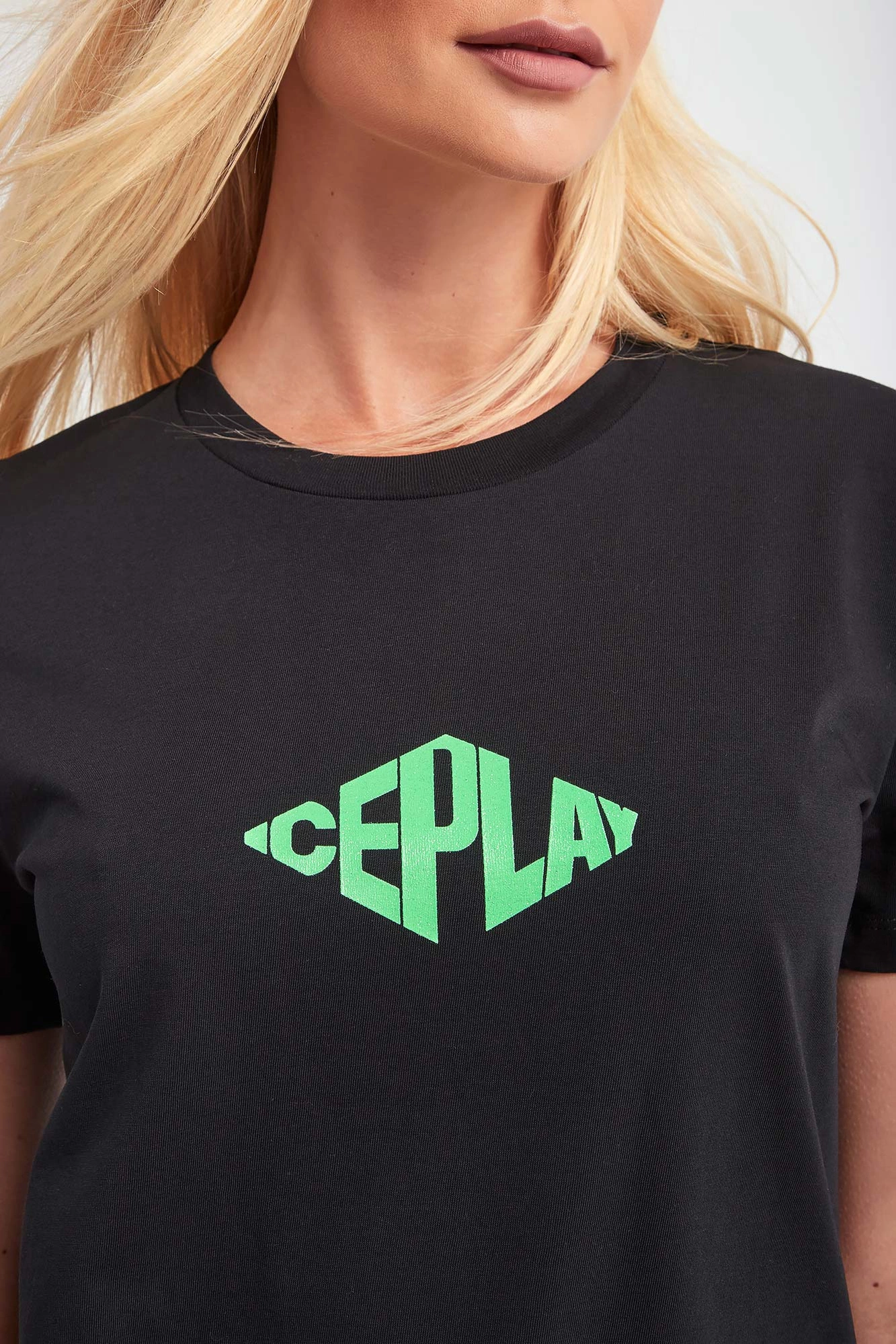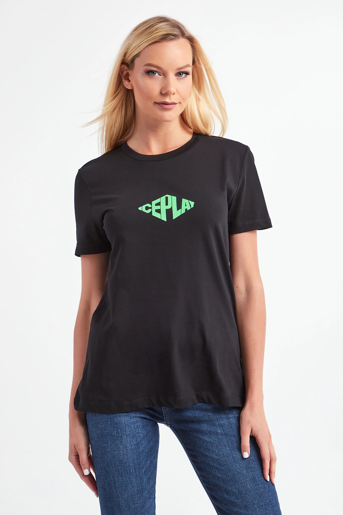 T-shirt marki Ice Play w czarnym kolorze. Fason regular fit. Z przodu zielony, kontrastujący nadruk w postaci nazwy marki. Dekolt typu o-neck zakończony ściągaczem. Krótkie rękawki oraz dół wykończone lamówką. Wykonany z czystej bawełny. Idealny jako baza każdej casualowej stylizacji.