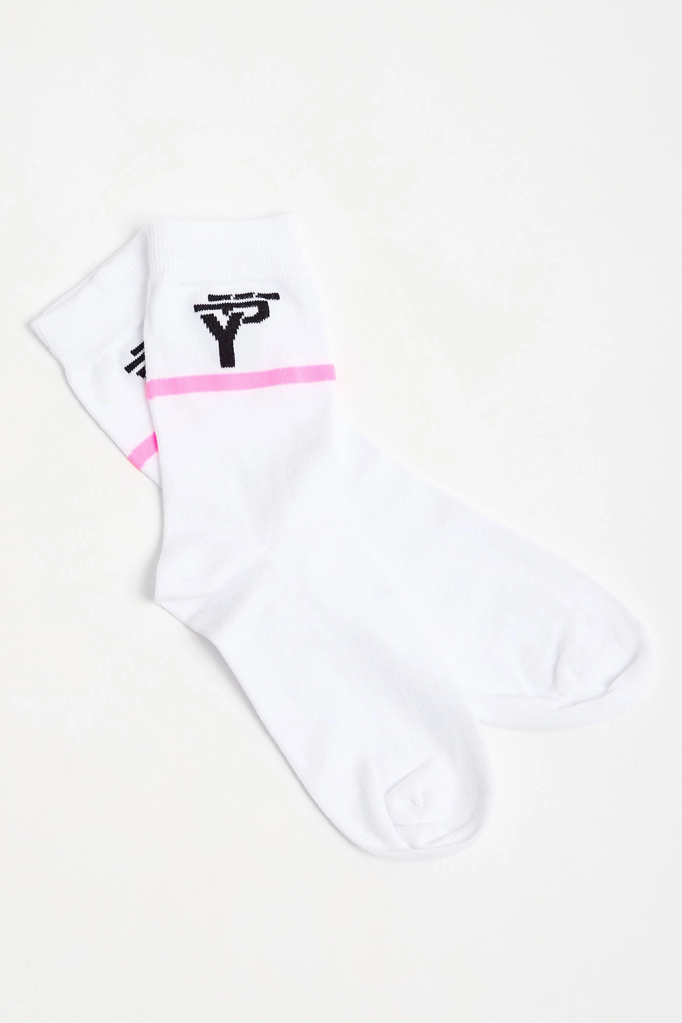Skarpetki marki Ice Play w białym kolorze. Po bokach czarne logo oraz pasek w intensywnym, różowym kolorze. U góry szerokie, elastyczne ściągacze. Wykonane z bawełnianej tkaniny z domieszką elastanu.