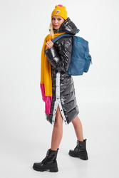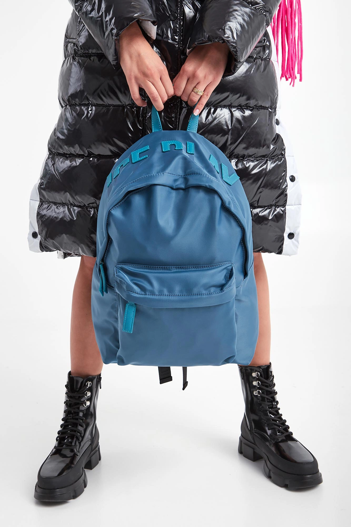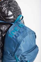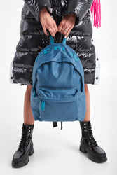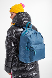 Klasyczny plecak w odcieniach niebieskiego. Na głównej klapie duży napis w postaci nazwy marki. Z przodu dwie kieszenie zapinane na zamek z zawieszką w kontrastowym kolorze. Zamek ukryty pod klapką. Podszewka w czarnym kolorze. Wewnątrz dwie kieszenie. Jedna zapinana na zamek. Regulowane szelki. W komplecie worek przeciwkurzowy.