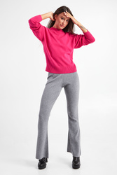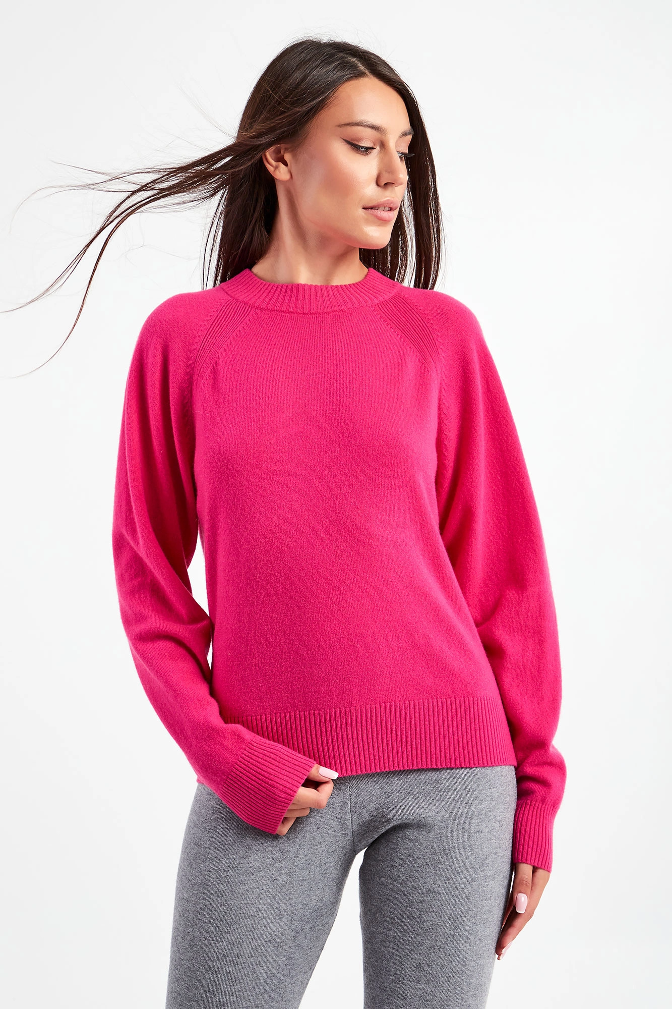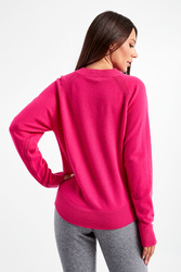 Sweter w kolorze różowym marki Marella. Fason regular fit o asymetrycznym kroju. Rękawy reglanowe. Dekolt O-neck i rękawy wykończone prążkowanym ściągaczem. Wykonany z miękkiej wełny z dodatkiem kaszmiru.