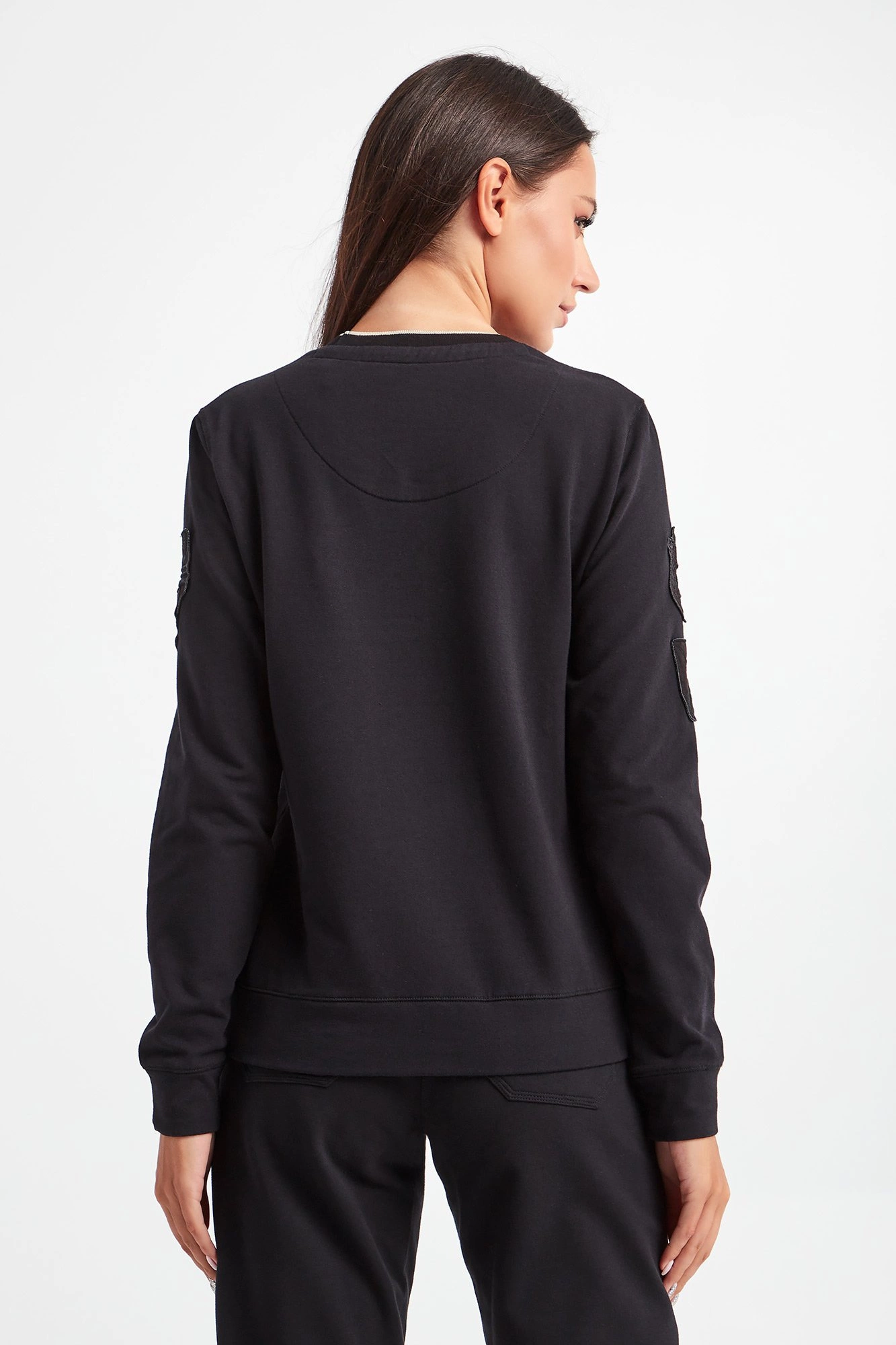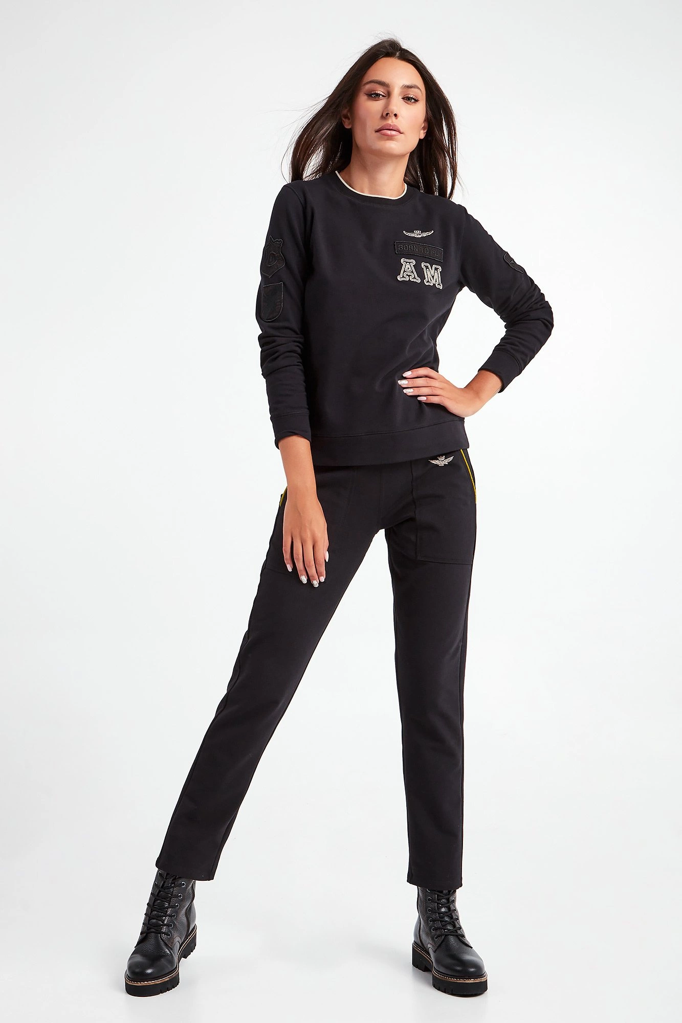 Bluza marki Aeronautica Militare w czarnym kolorze. Fason regular fit. Z przodu i na rękawach ozdobne naszywki. Dekolt typu o-neck z kremowym wykończeniem. Dekolt, długie proste rękawy oraz dół zakończone elastycznymi ściągaczami. Na plecach ozdobne przeszycie. Wykonana z miękkiej bawełny z domieszką elastanu.