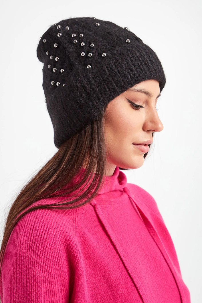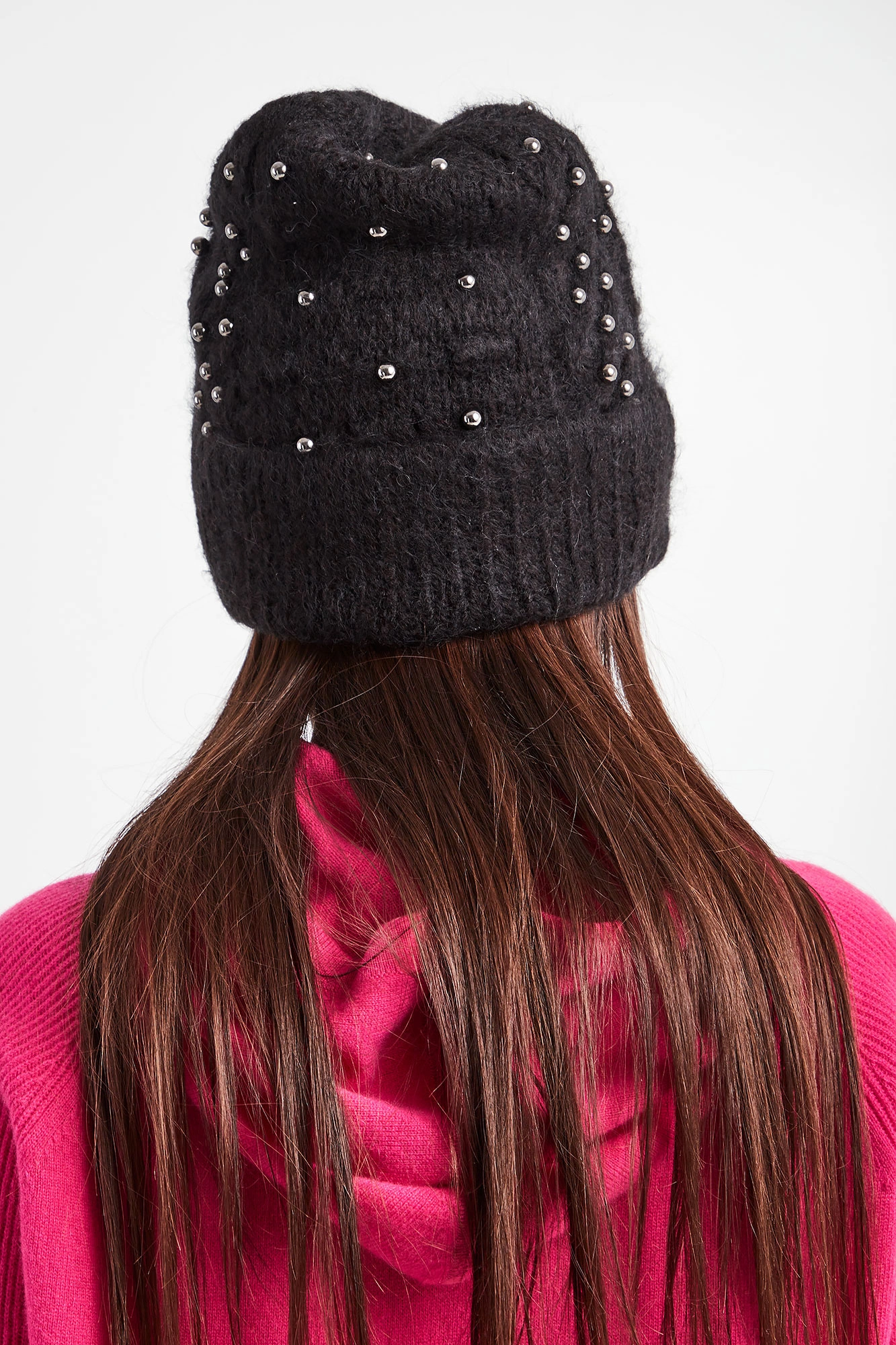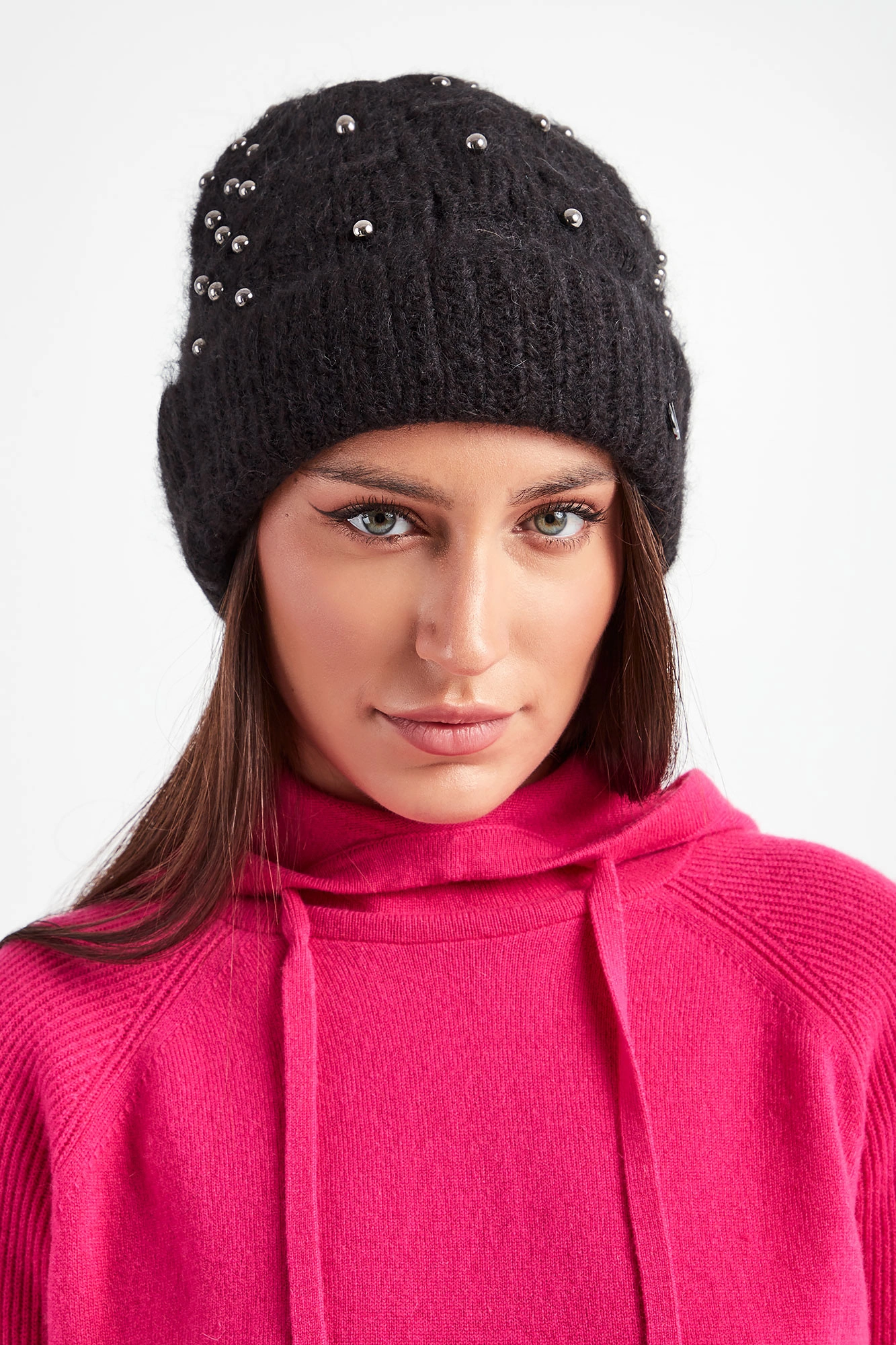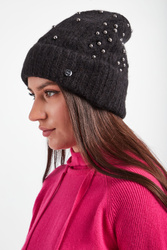 Czapka marki Liu Jo w czarnym kolorze. Na całości ozdobne perły w srebrnym kolorze. Zakończona wywinięciem. Z przodu metalowa aplikacja z nazwą marki. Wykonana z przyjemnej w dotyku, miękkiej tkaniny.