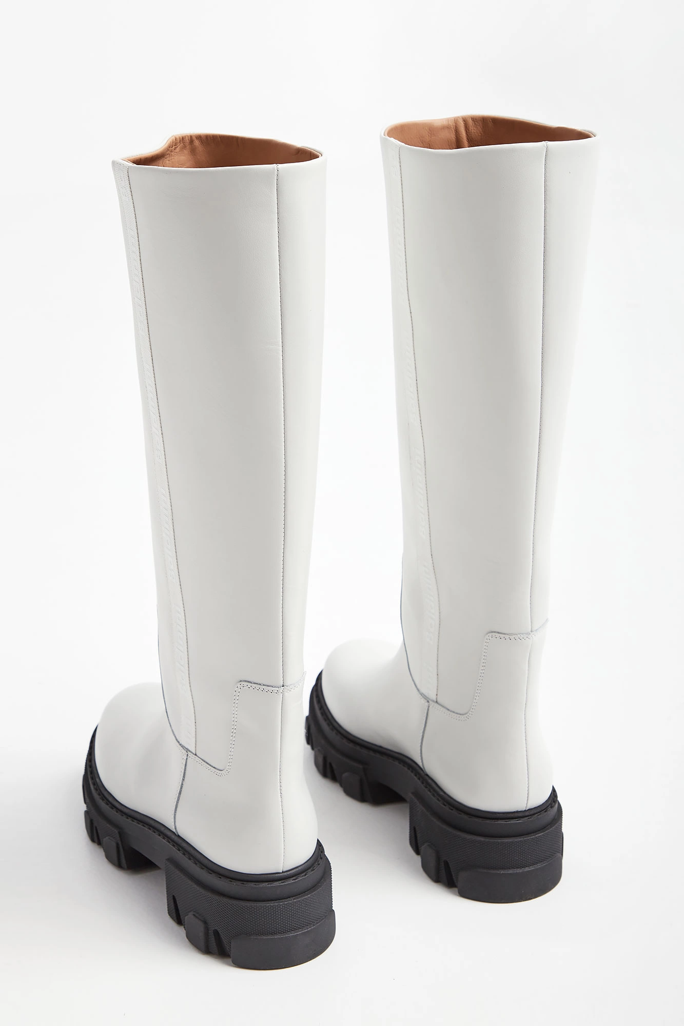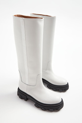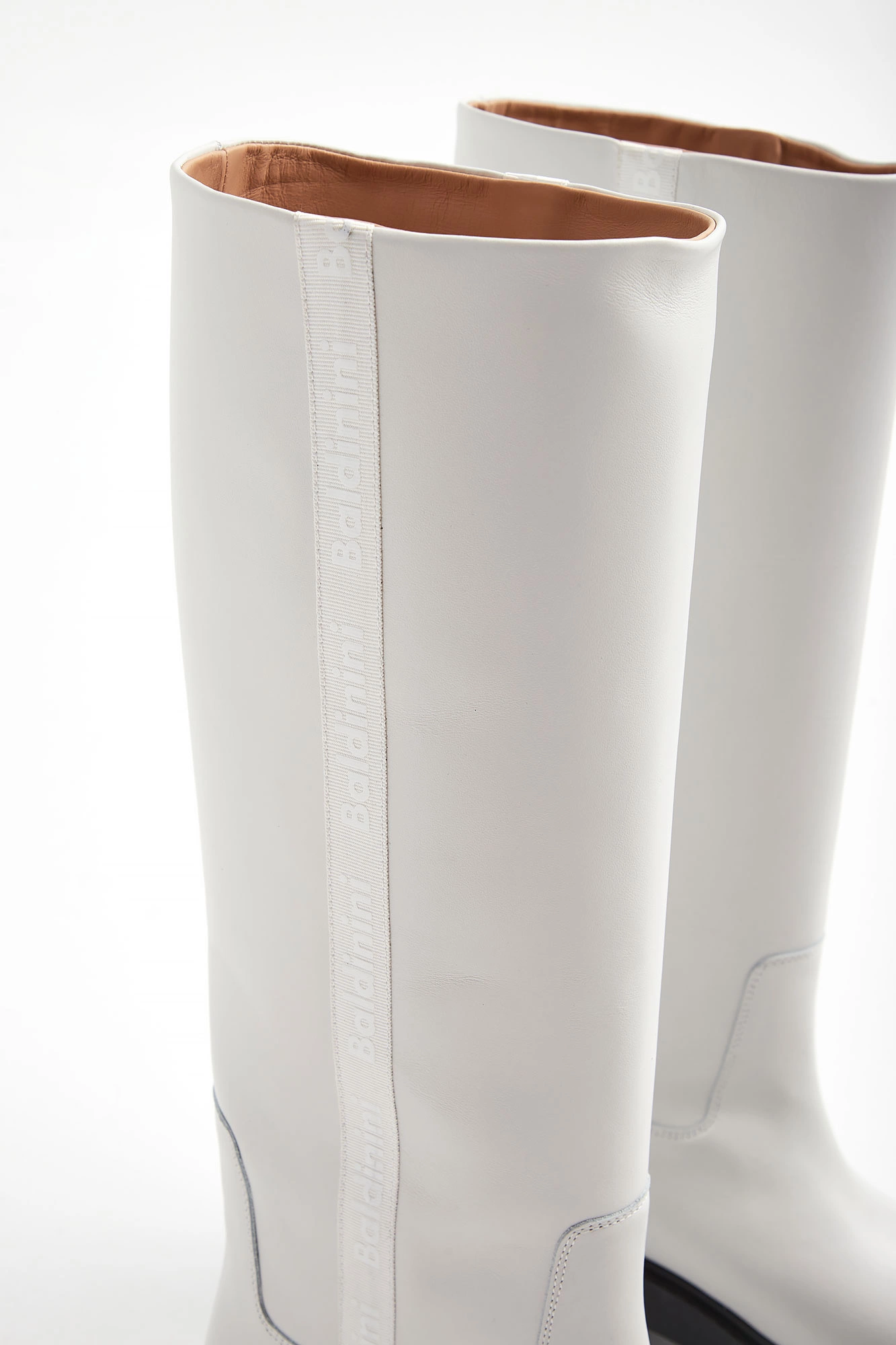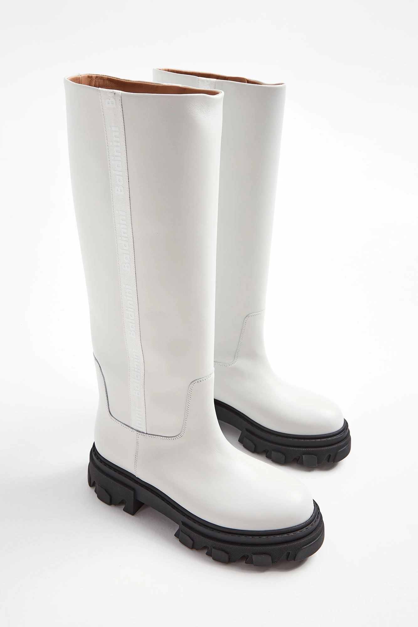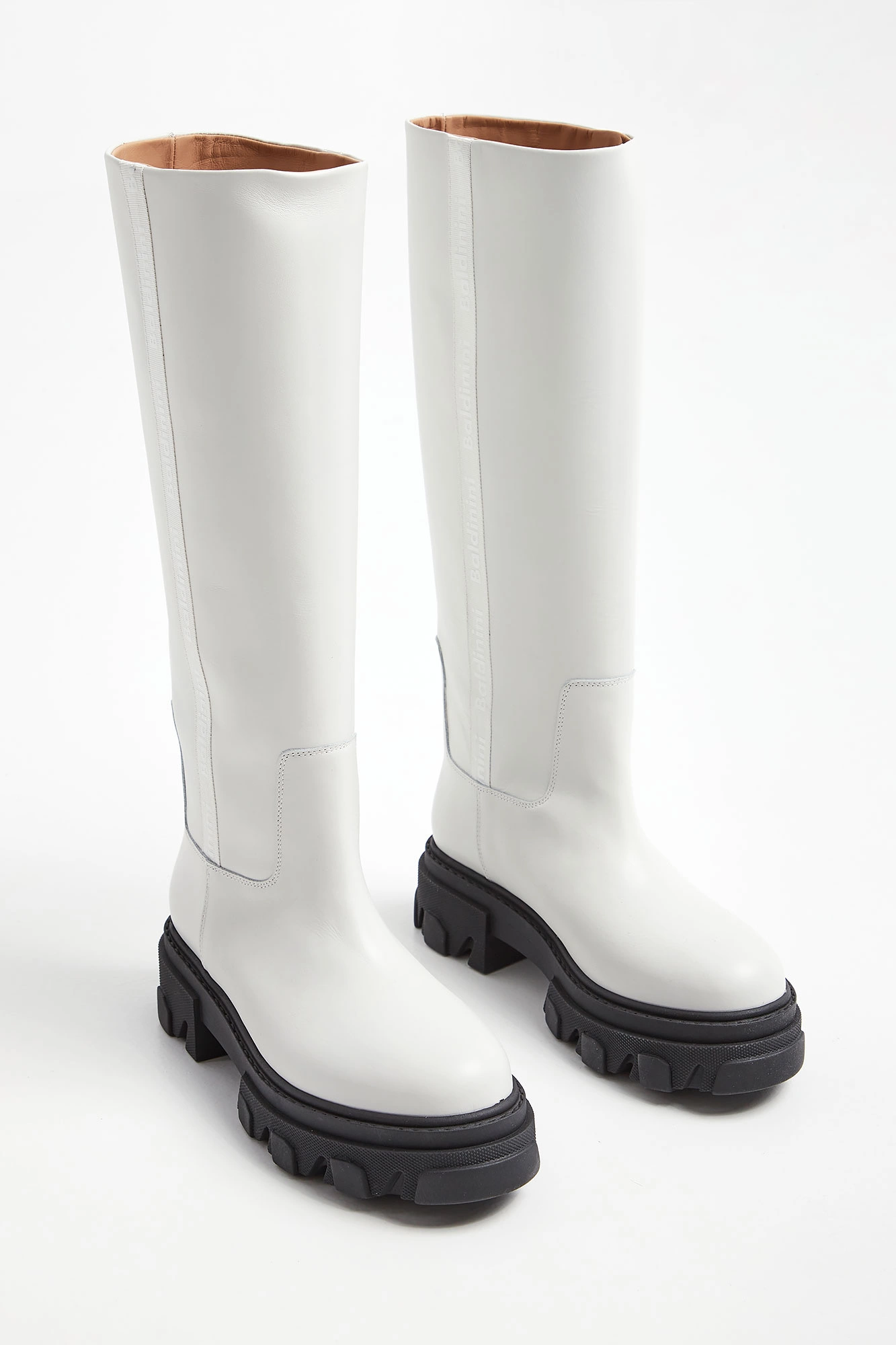 Kozaki marki Baldinini w białym kolorze. Długa cholewka. Wkładane. Po bokach ozdobny lampas w kolorze butów z tłoczną nazwa marki w białym kolorze. Skórzana wyściółka w naturalnym kolorze. Na całości przeszycia. Czarna, tłoczona podeszwa. Wykonane z gładkiej, naturalnej skóry. W zestawie worek przeciwkurzowy.