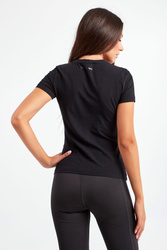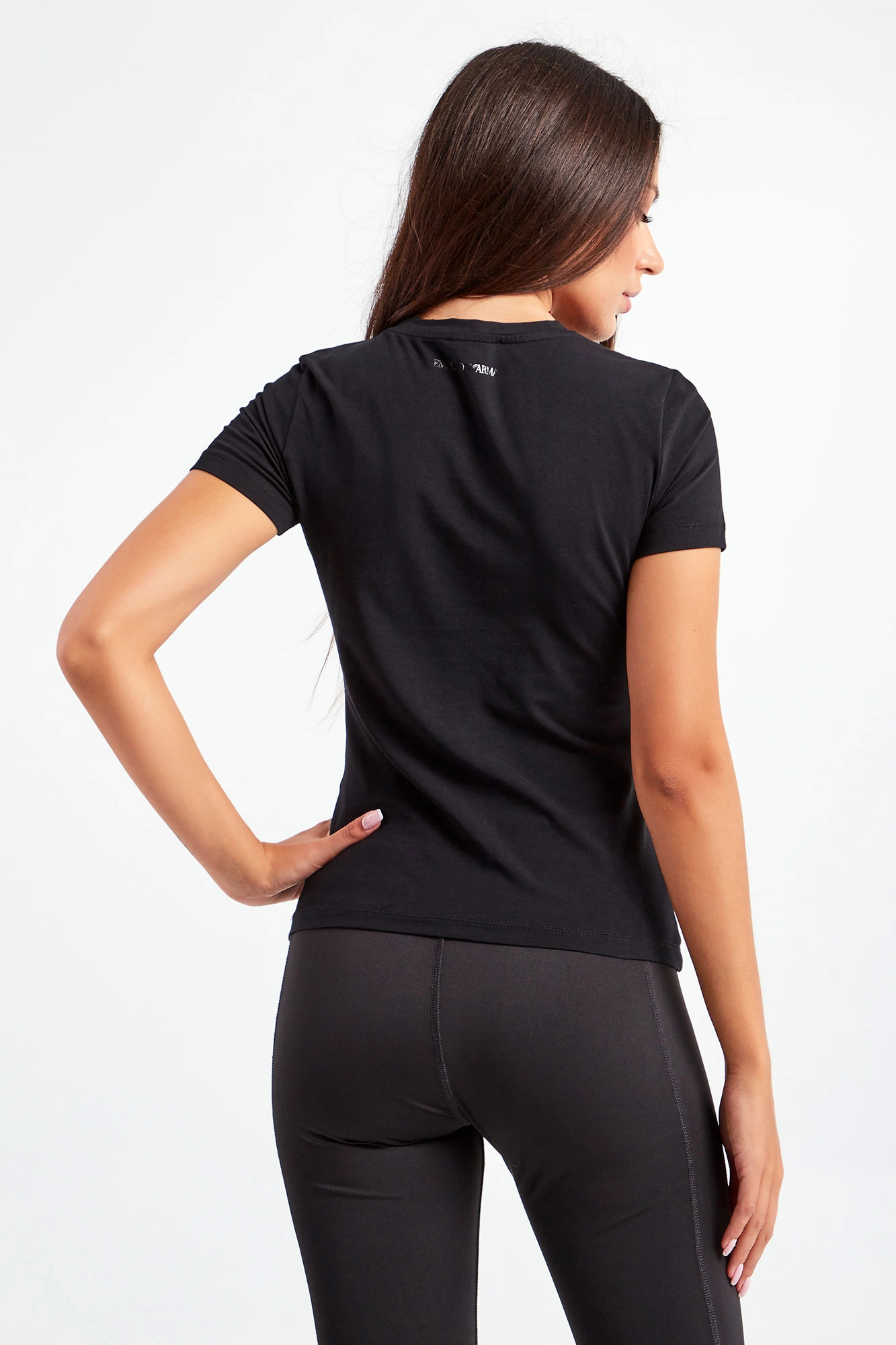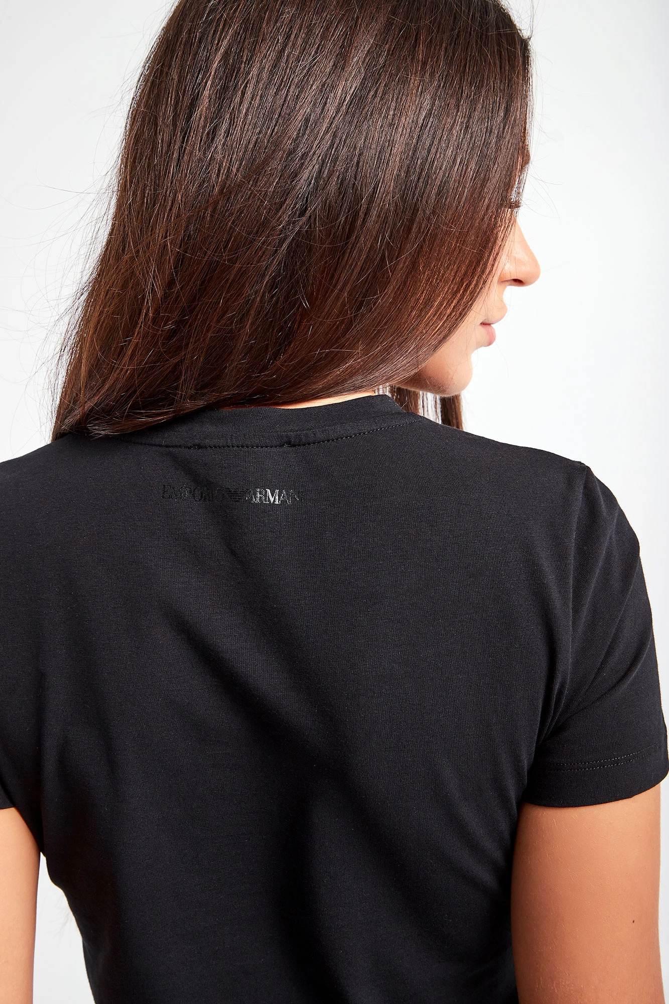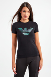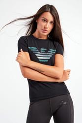 Czarny t-shirt marki Emporio Armani. Fason slim fit. Z przodu duży nadruk z logiem marki w kolorze zielonym. Dekolt typu o-neck zakończony ściągaczem. Krótkie rękawy oraz dół wykończone podwinięciem. Wykonany z czystej, przyjemnej w dotyku bawełny.