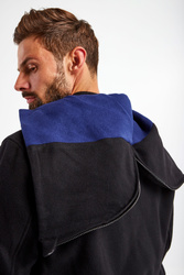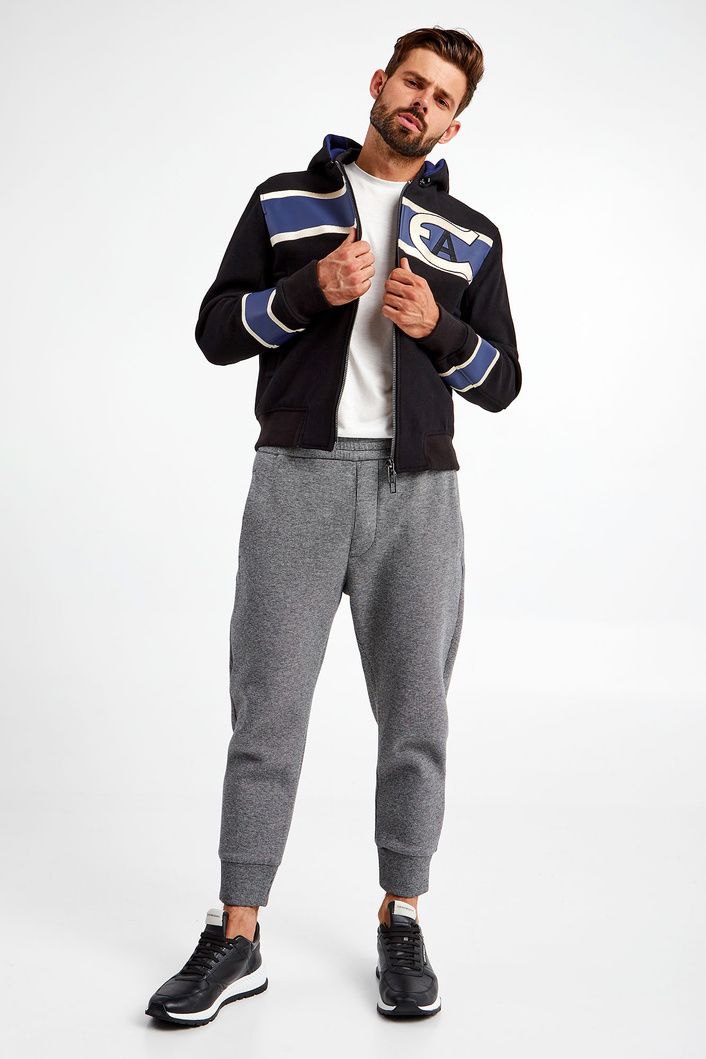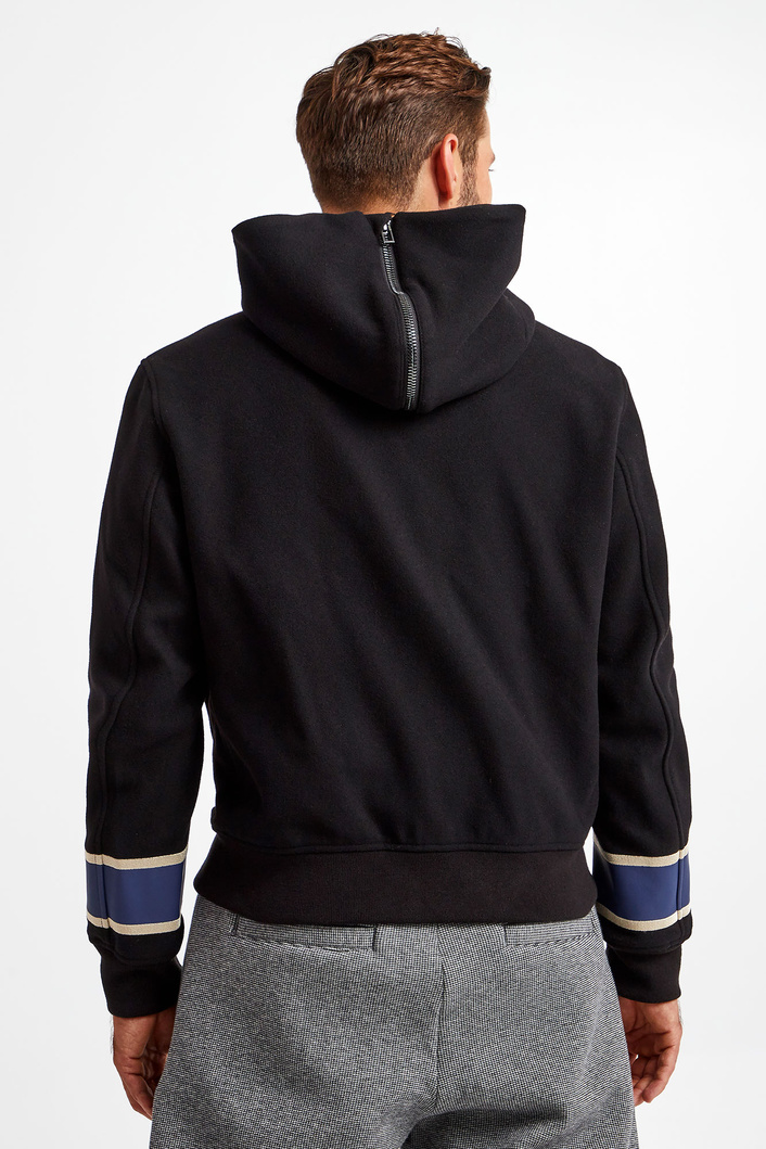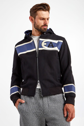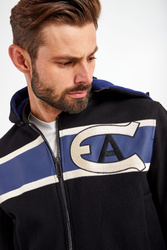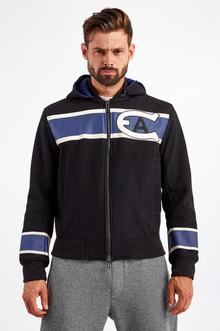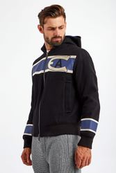Wełniana kurtka z kapturem marki Emporio Armani w czarnym kolorze. Fason regular fit. Zapinana za pomocą dwustronnego zamka. Z przodu i na rękawach beżowo-niebieskie paski oraz haftowany monogram marki. Dwie boczne, zapinane na napy kieszenie. Rękawy oraz dół wykończone elastycznymi ściągaczami. Kaptur odpinany i rozpinany.