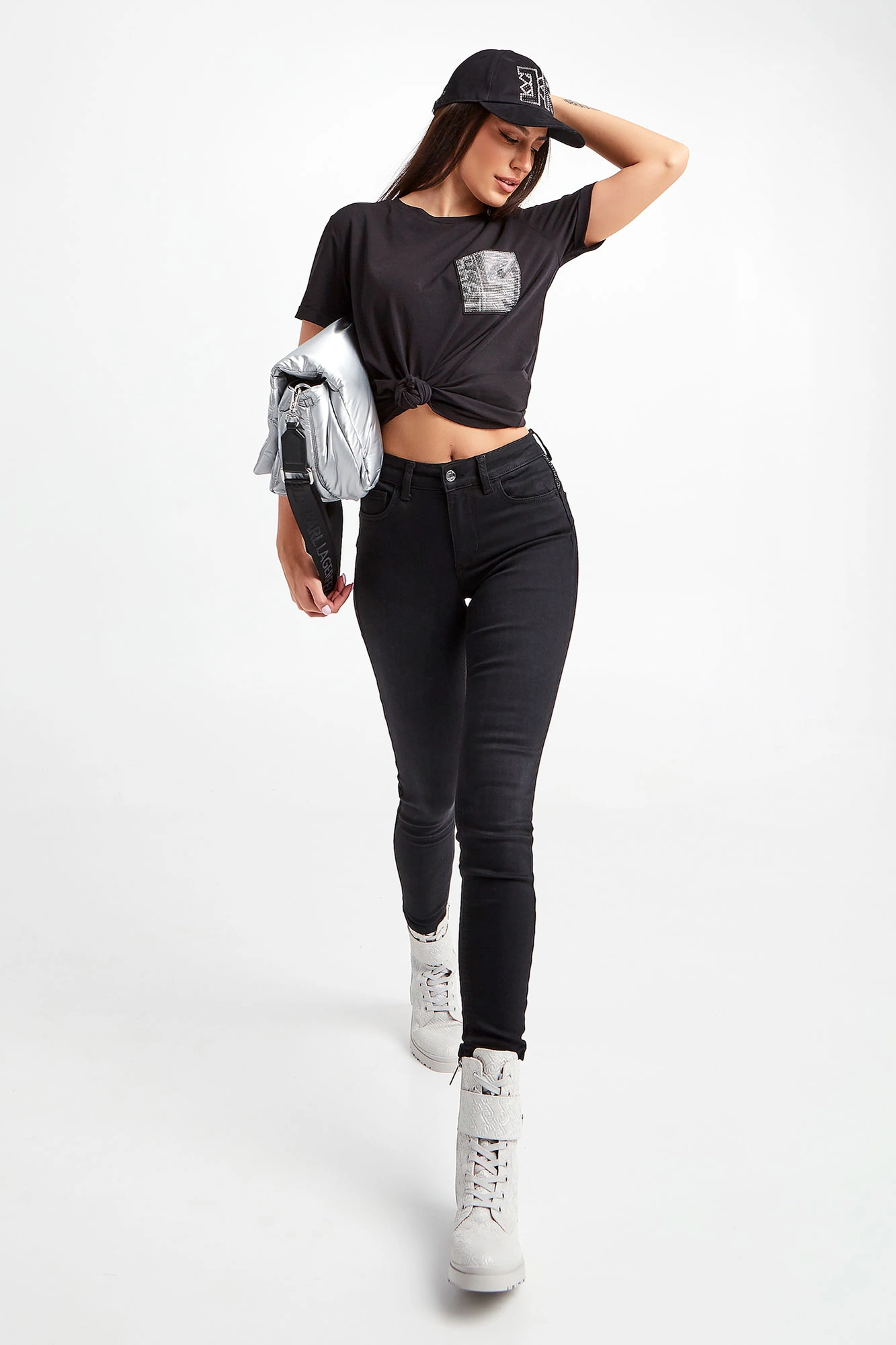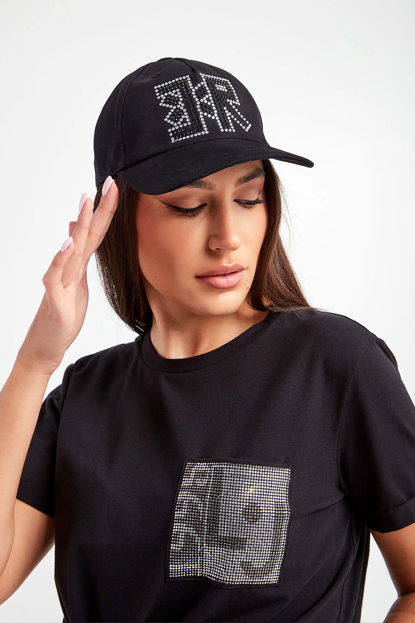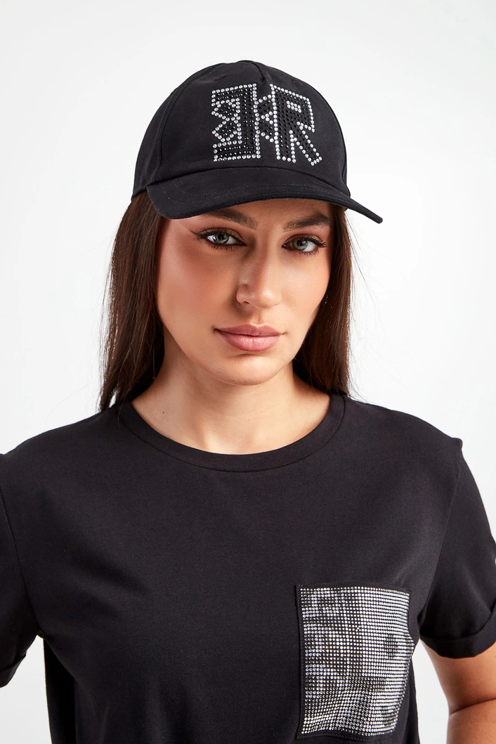 Czapka z daszkiem w czarnym kolorze marki John Richmond. Z przodu aplikacja z czarnych i srebrnych kryształków. Regulowana z tyłu za pomocą paska ze srebrnym, metalowym regulatorem. Obok zapięcia nadruk w postaci nazwy marki. Czapka w całości wykonana z bawełny. Interesujący dodatek do codziennych stylizacji.