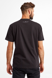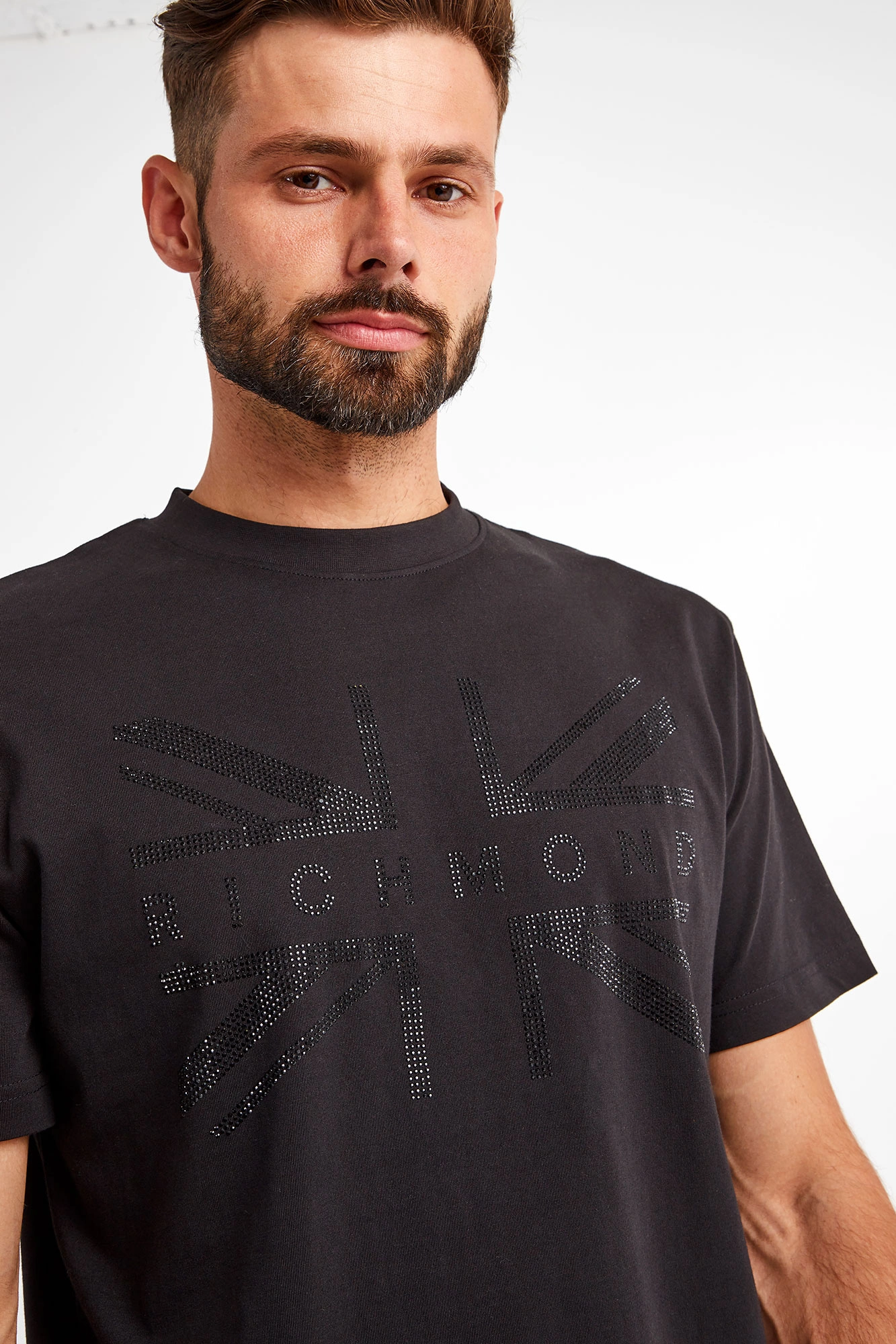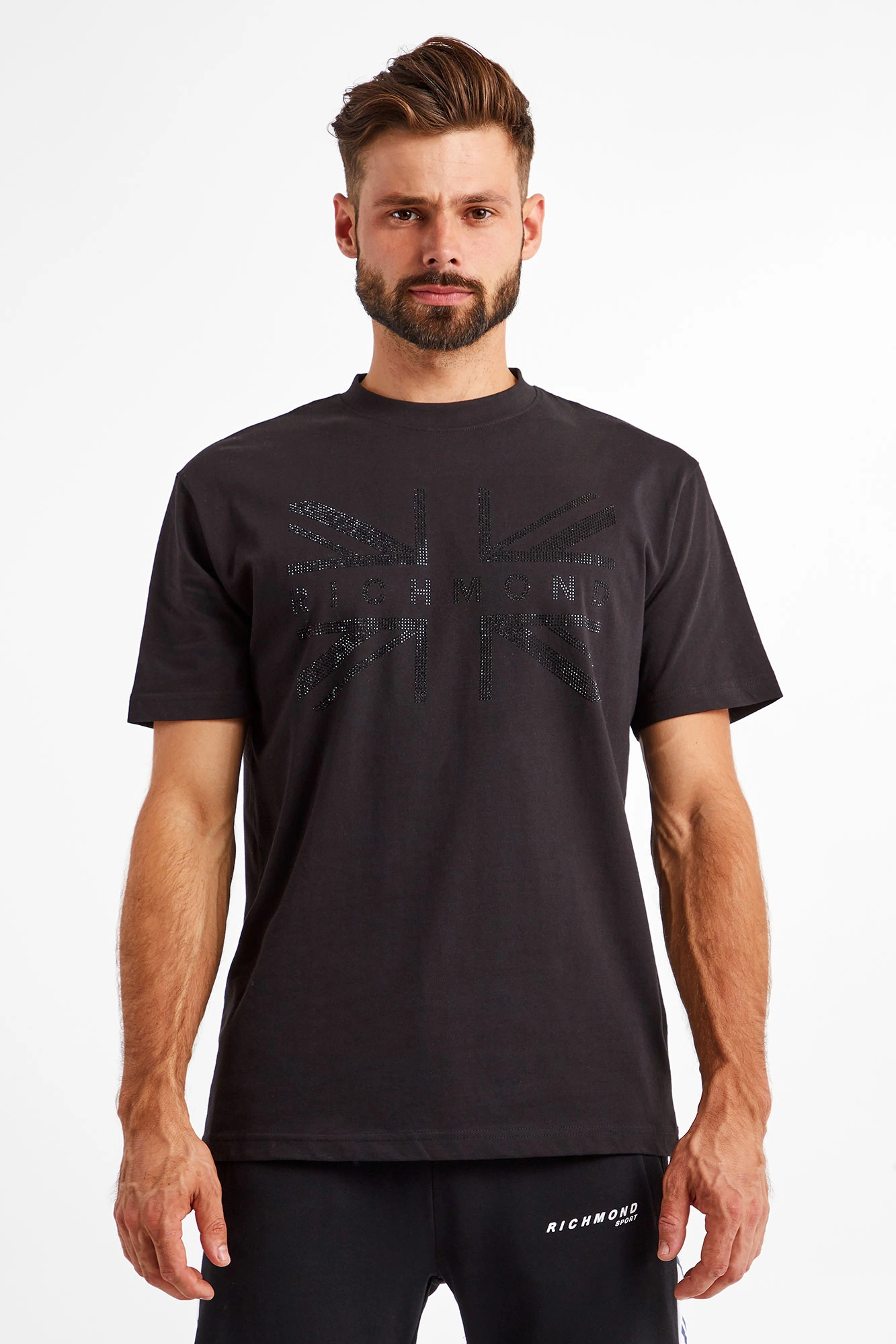 T-shirt w czarnym kolorze marki John Richmond. Fason prosty typu regular. Dekolt typu o-neck wykończony ściągaczem. Z przodu duży, błyszczący nadruk w postaci czarnych kryształków. Z tyłu niewielki biały napis z nazwą marki. Wykonany z czystej bawełny. Miękki i przyjemny w dotyku. Idealna baza casualowych stylizacji.
