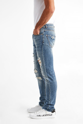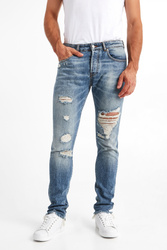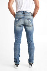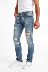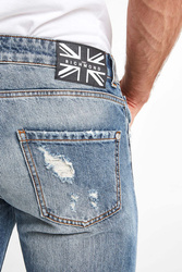 Jeansy marki John Richmond. W klasycznym, niebieskim kolorze, fason regular fit. Zapinane za pomocą logowanych guzików. W pasie szlufki. Model z pięcioma kieszeniami. Jedna ozdobiona czerwoną naszywką. Z tyłu na pasie czarna naszywka z białymi napisami. Z przodu i z tyłu jaśniejsze przebarwienia oraz mniejsze i większe przetarcia oraz dziury. Nogawki zwężające się ku dołowi, zakończone strzępieniem. Wykonane z przyjemnego w dotyku materiału. Klasyczne i wygodne. Idealnie sprawdzą się w każdym looku, nadając mu stylu i ponadczasowości.