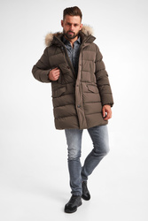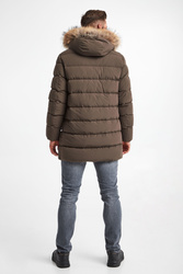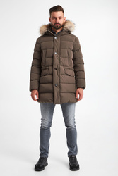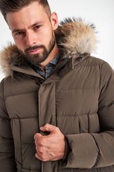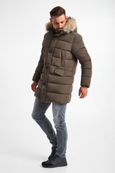 Pikowana kurtka marki Hetrego w kolorze khaki. Dłuższy fason typu regular. Z kapturem wykończonym brązowym futerkiem regulowanym za pomocą elastycznych troczków ze stoperami. Zapinana za pomocą dwukierunkowego zamka błyskawicznego i dużych, sygnowanych guzików. Model z czterema zewnętrznymi, zapinanymi kieszeniami. Na jednej z nich niewielka naszywka z nazwa marki w kontrastowym żółtym kolorze. Wewnątrz cztery dodatkowe kieszenie. Naturalne wypełnienie. Ciepła i stylowa propozycja na zimowe dni.