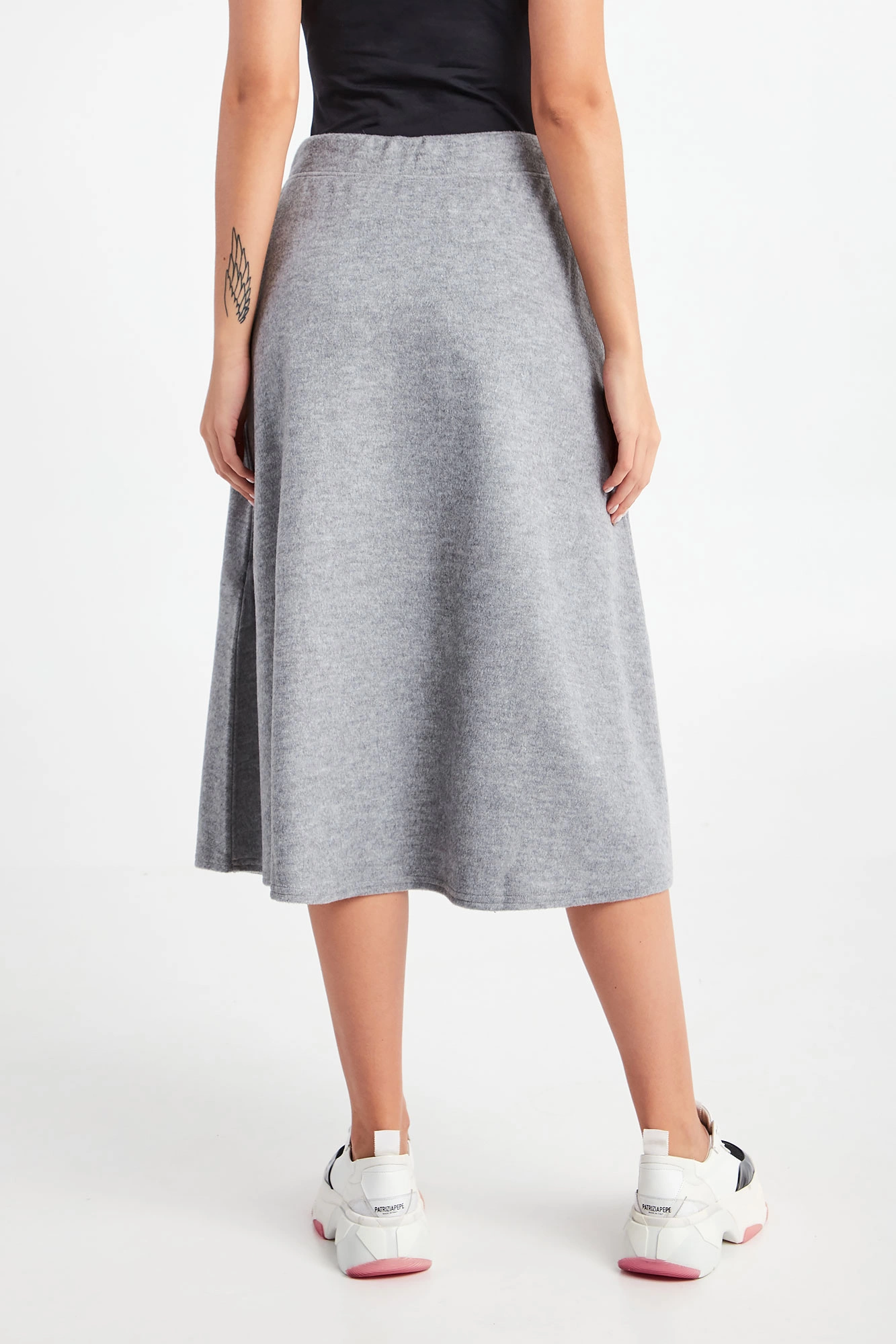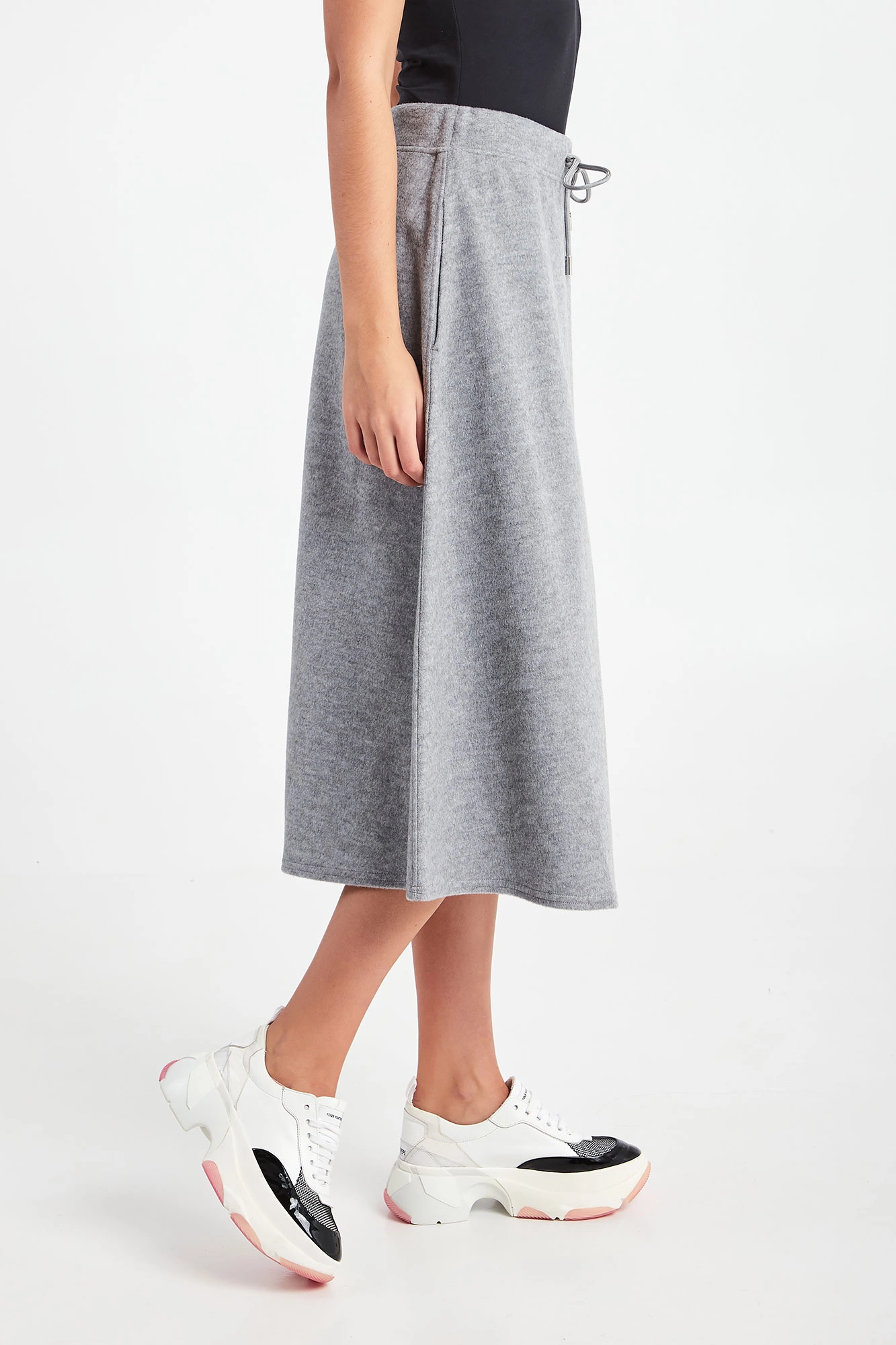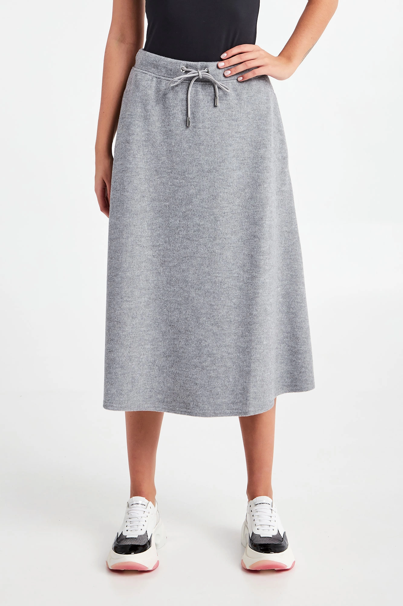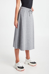 Spódnica marki Weekend Max Mara w kolorze szarego melanżu. Fason typu trapez, w kształcie litery A. Długosć midi. W pasie ściągacz regulowany za pomocą troczków. Po bokach wszyte dwie kieszenie. Wykonana z przyjemnego w dotyku materiału.