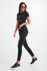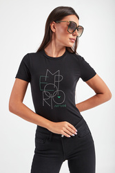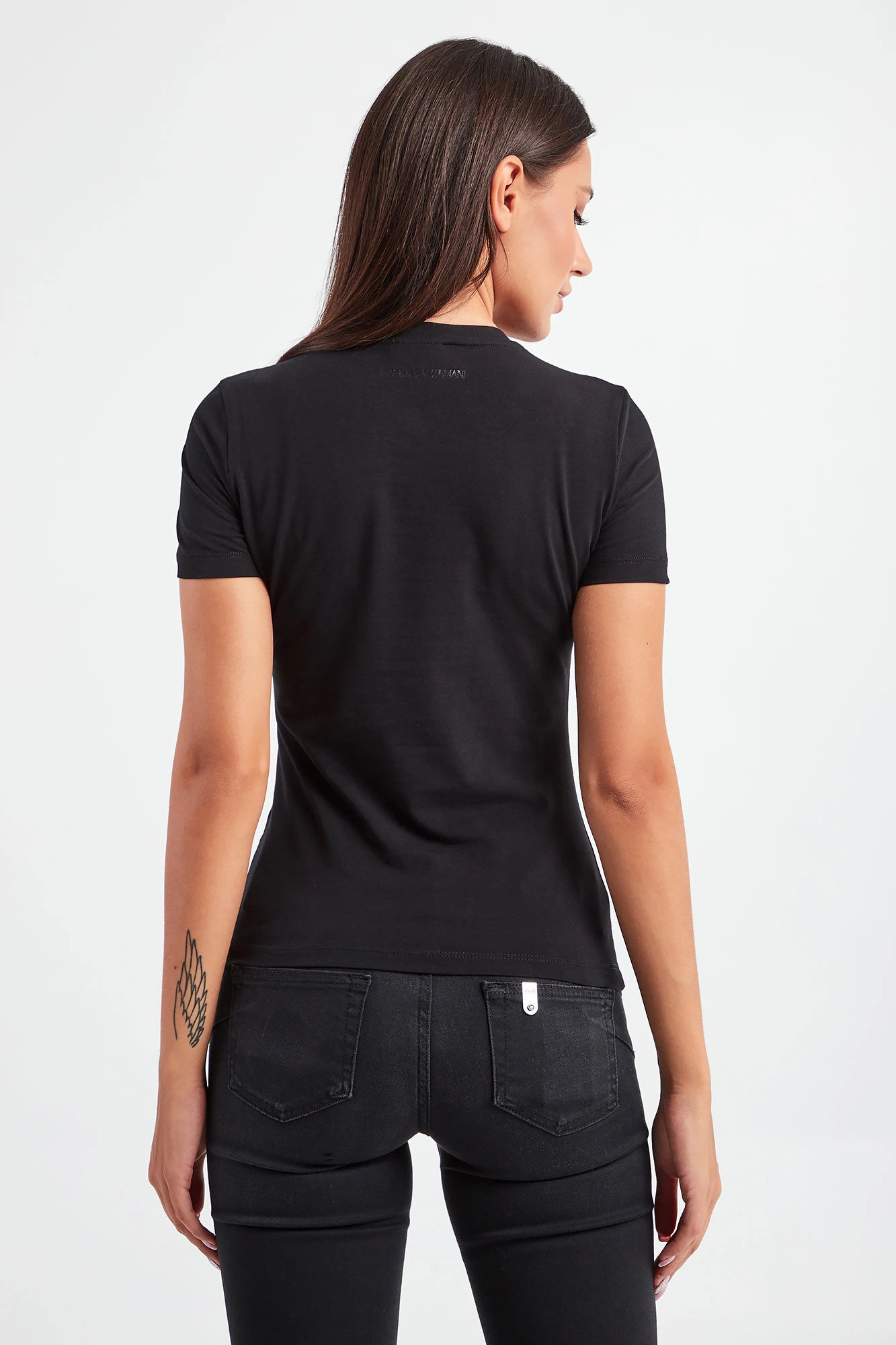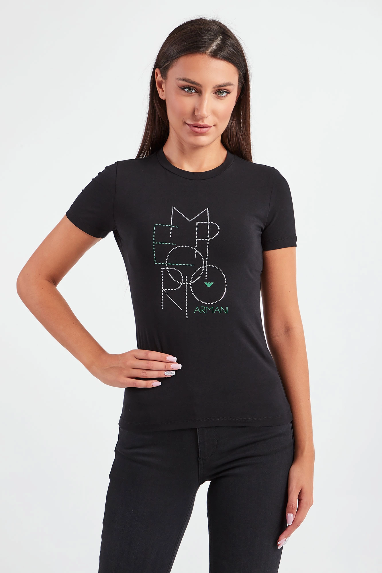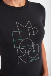 Czarny t-shirt marki Emporio Armani. Dopasowany krój slim fit. Z przodu nazwa marki ułożona ze srebrno-zielonych, połyskujących kryształków. Dekolt typu o-neck wykończony ściągaczem. Krótkie rękawki oraz dół zakończone lamówką z podwójnym ściegiem. Z tyłu, na linii karku czarny napis w postaci nazwy marki. Wykonany z bawełny z domieszką elastanu.