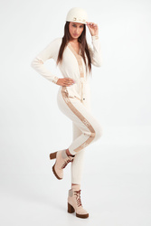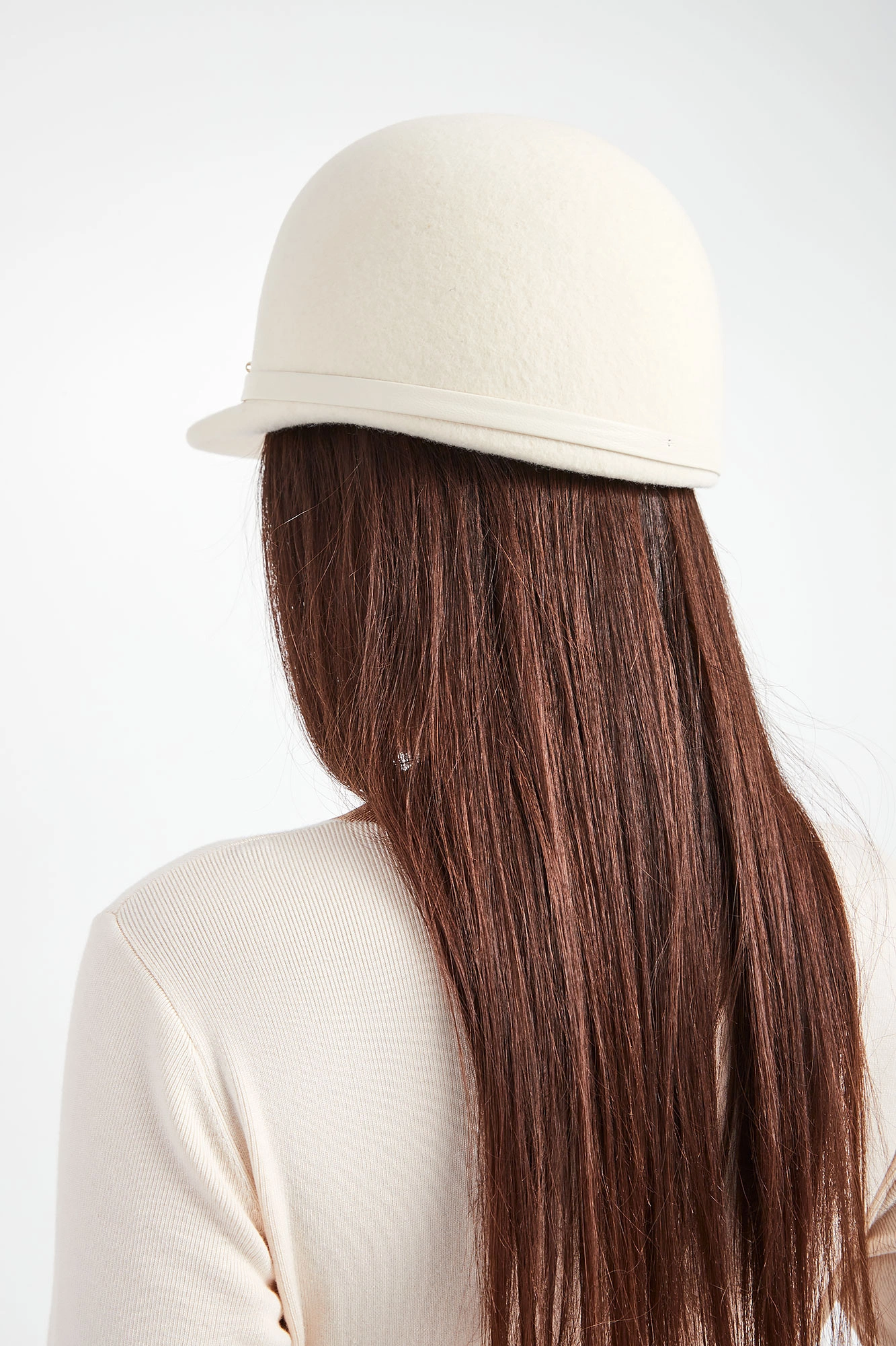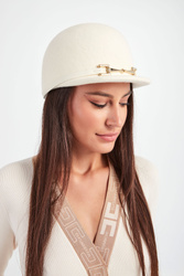 Czapka marki Elisabetta Franchi w kolorze ecru. Z niewielkim daszkiem. Z przodu z ozdobną, metalową aplikacją. W kształcie toczka. Czapka wykonana z wełny.