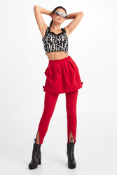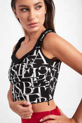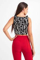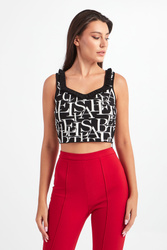 Top marki Elisabetta Franchi w czarnym kolorze. Dopasowany krój slim fit. Na całości biały, kontrastujący wzór z nazwa marki. Kwadratowy dekolt wykończony delikatną, czarną falbanką. Zapiany za pomocą bocznego, krytego zamka. Wykonany z miękkiej, elastycznej, wiskozowej dzianiny.