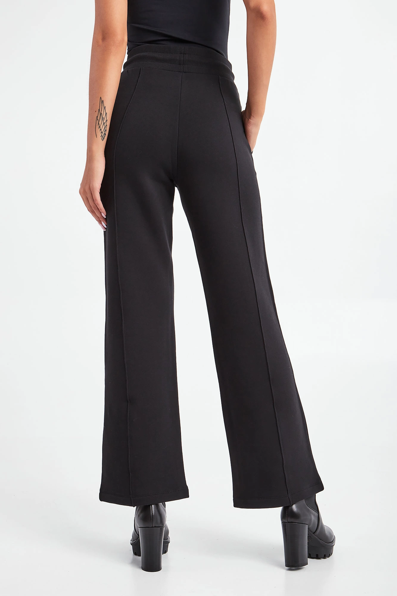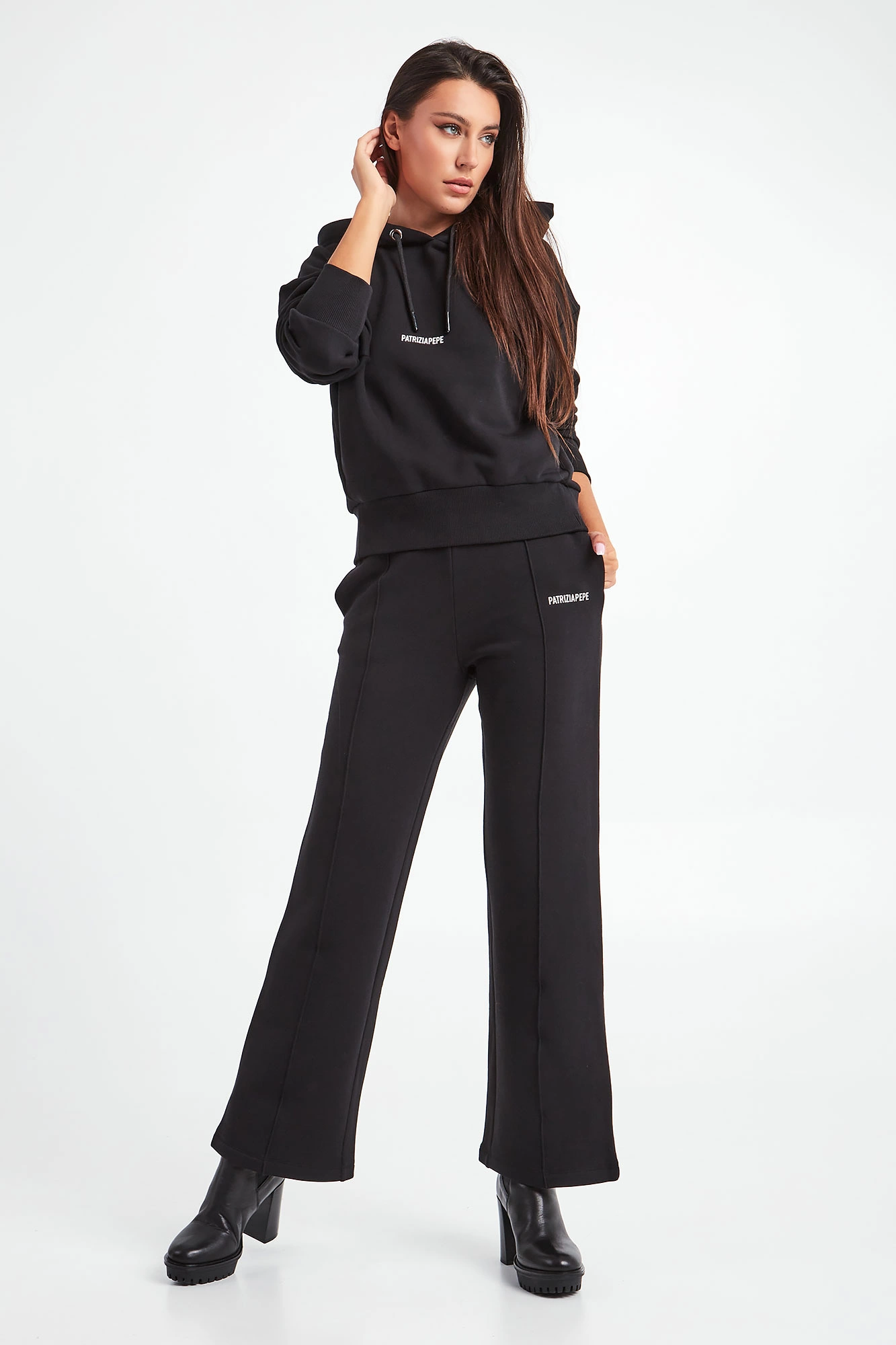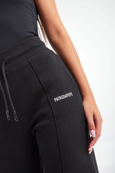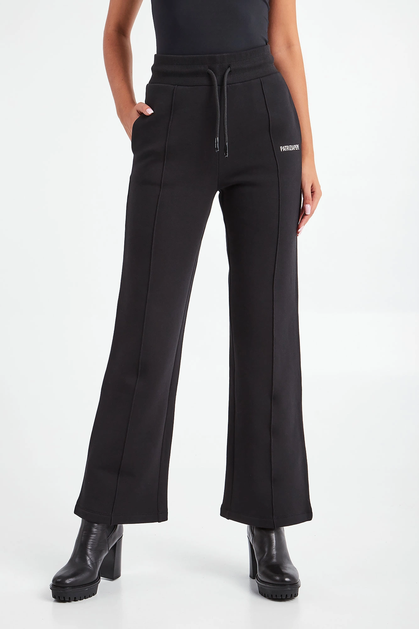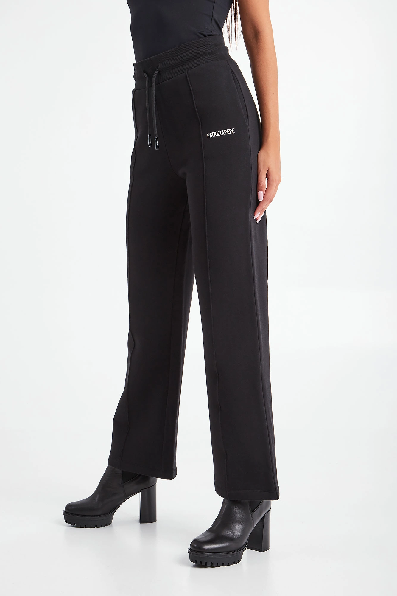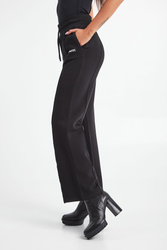 Spodnie dresowe marki Patrizia Pepe w czarnym kolorze. Fason typu wide z prostymi nogawkami. W pasie ściągacz regulowany za pomocą troczków. Na lewej nogawce gumowy, biały napis w postaci nazwy marki. Na nogawkach pionowe przeszycie. Dwie boczne, wpuszczane kieszenie. Wykonane z organicznej, bawełnianej tkaniny z dodatkiem elastycznych włókien.