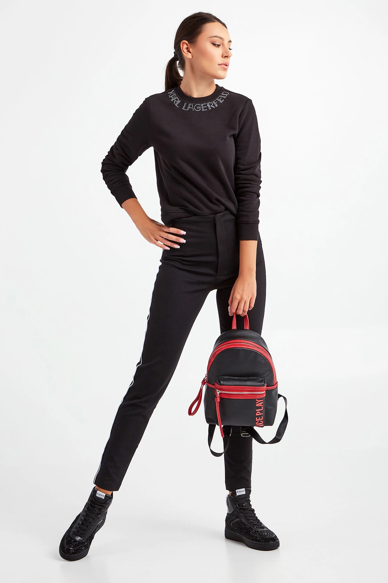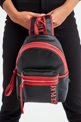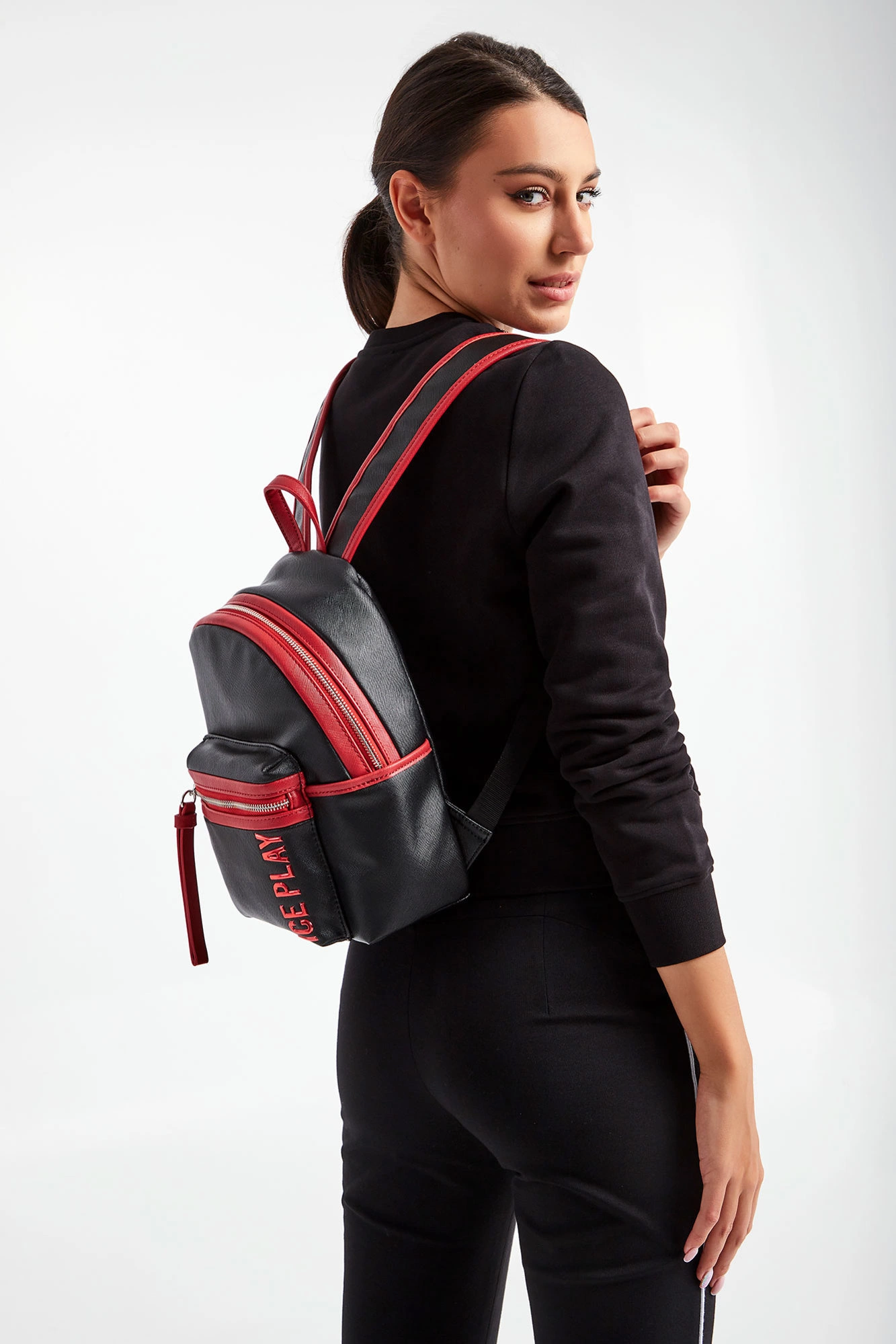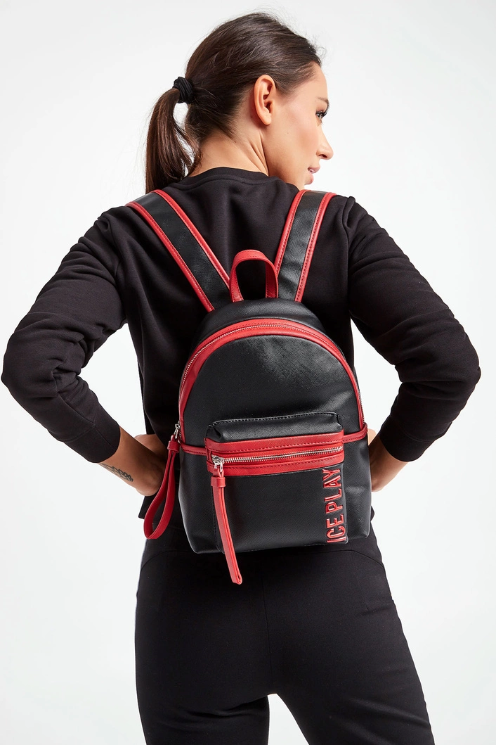 Plecak marki Ice Play w czarnym kolorze. Jednokomorowy z dodatkową kieszenią z przodu. Zapinany na zamek błyskawiczny w srebrnym kolorze. Z przodu gumowana naszywka w kształcie nazwy marki w czerwonym kolorze. Na całości wstawki czerwonej ekoskóry. Do noszenia na regulowanych paskach. W zestawie worek przeciwkurzowy.