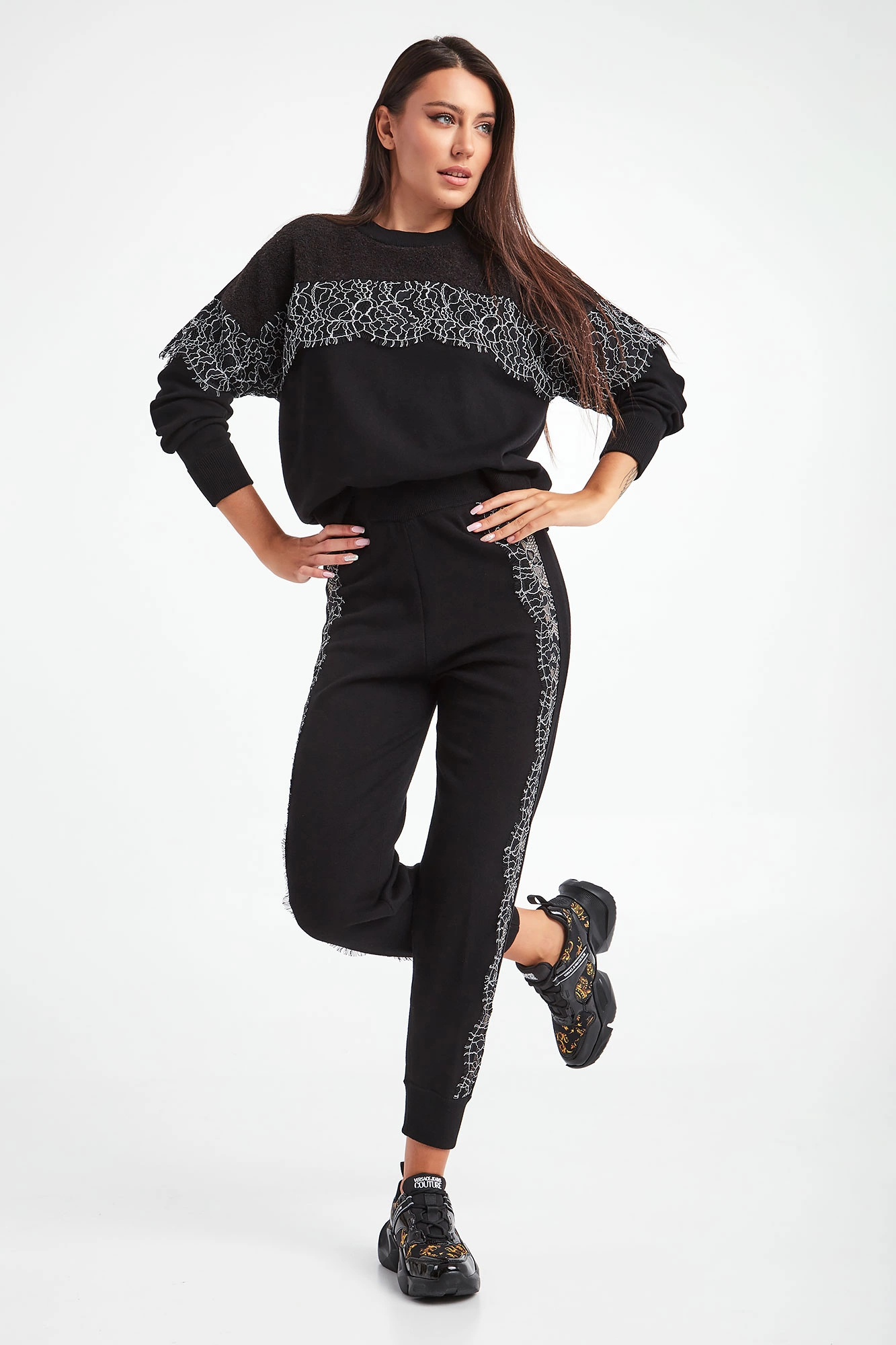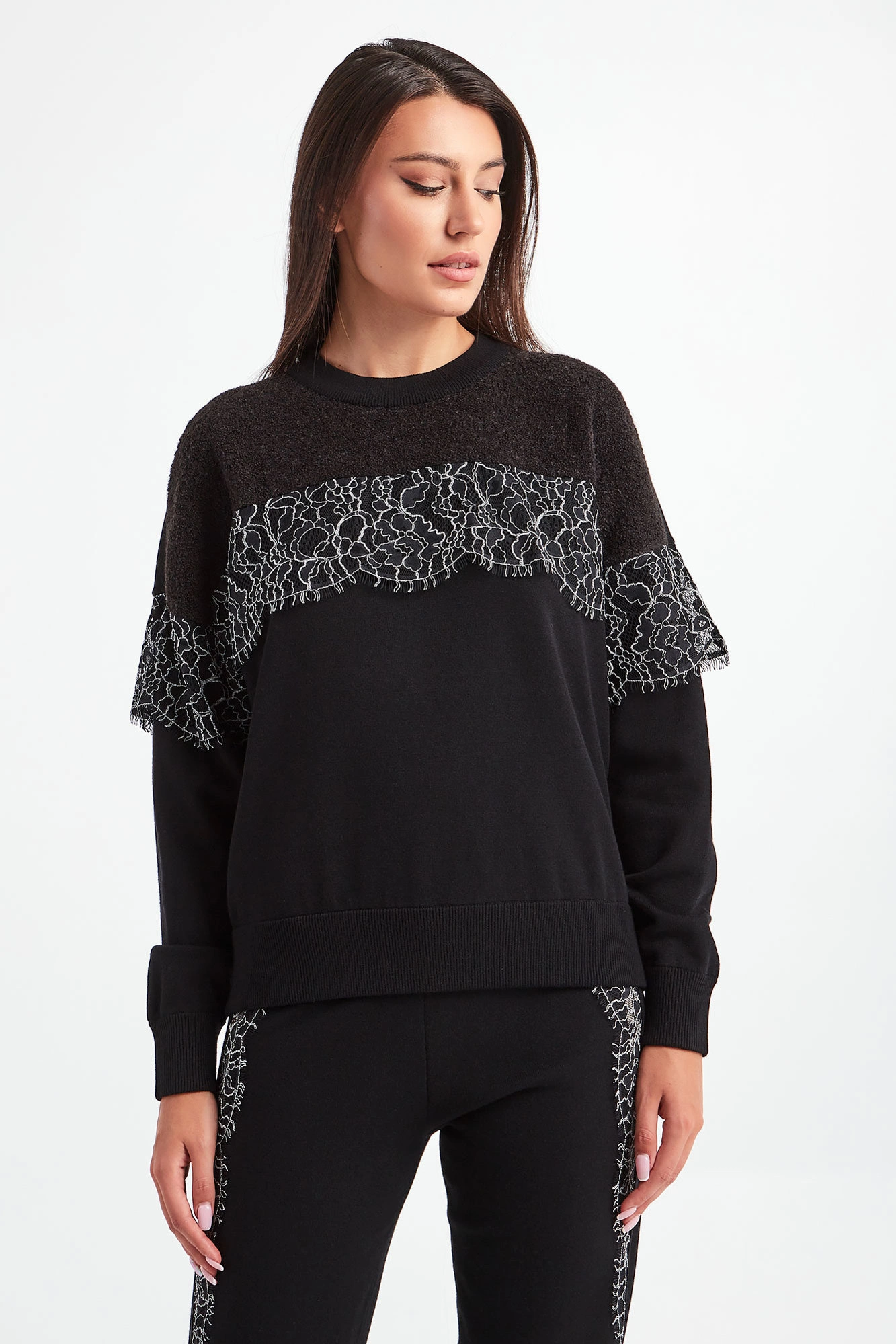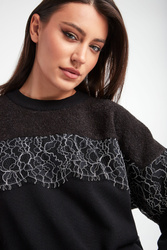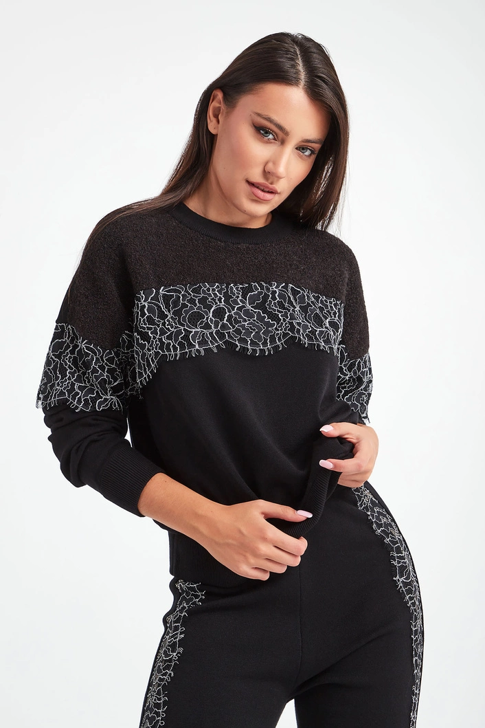 Sweter marki Twinset U&B w czarnym kolorze. Prosty fason typu regular. Okrągły dekolt typu o-neck. Na części wstawka czarno--białej koronki. U góry wstawka futerkowej dzianiny. Na linii karku metalowa aplikacja z nazwą i logo marki. Reglanowe, długie rękawy, dekolt i dół zakończone elastycznym ściągaczem. Wykonany z miękkiego, elastycznego materiału.