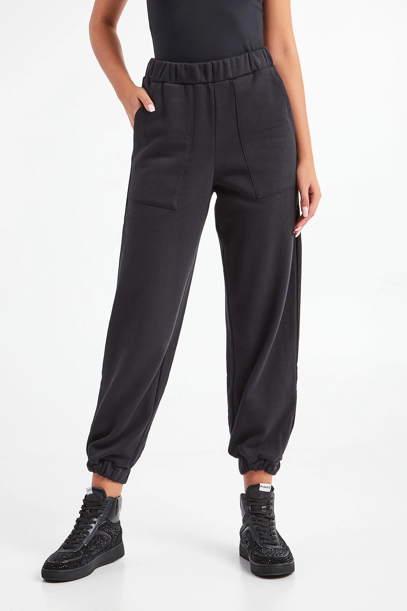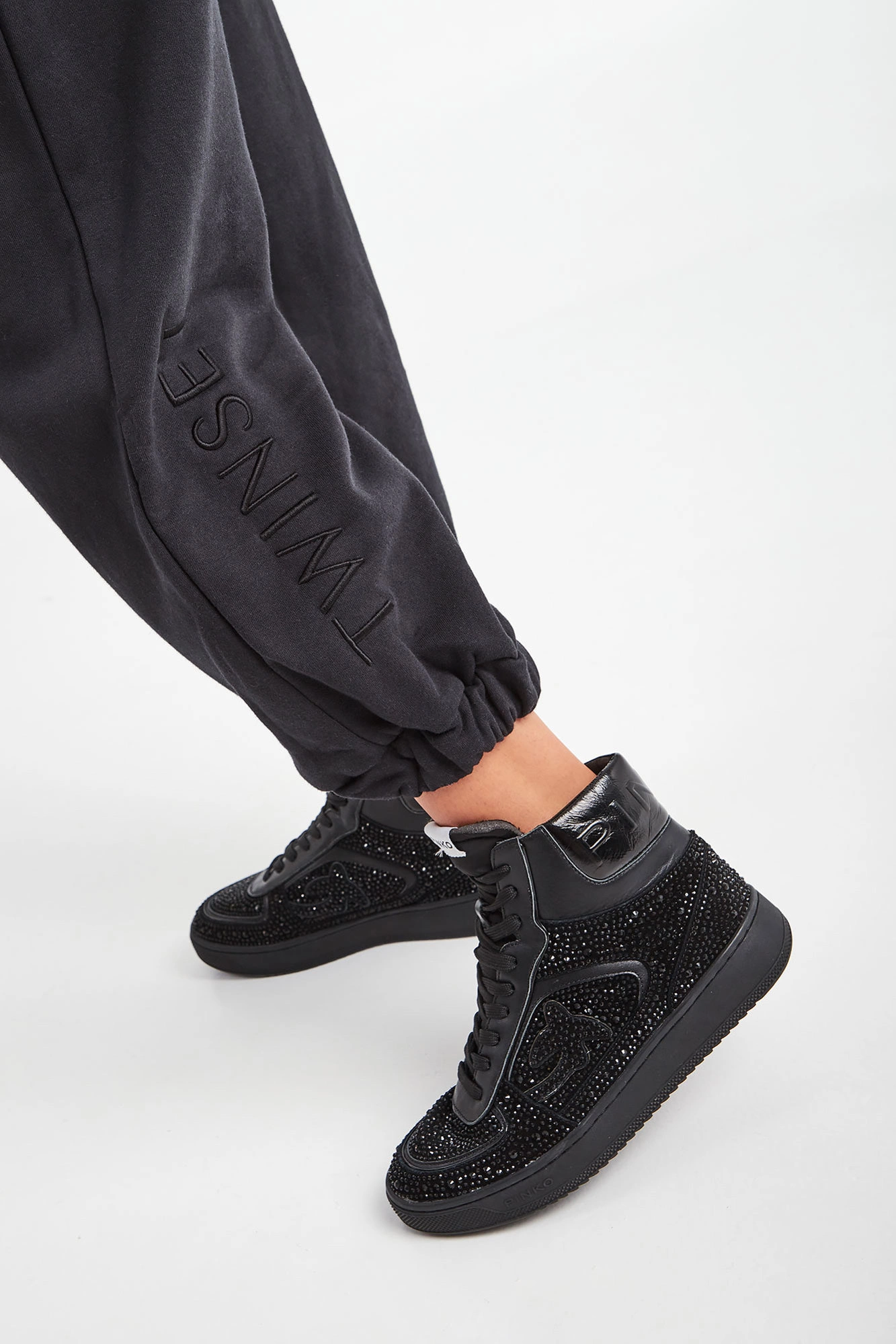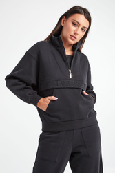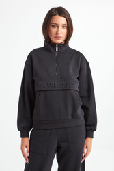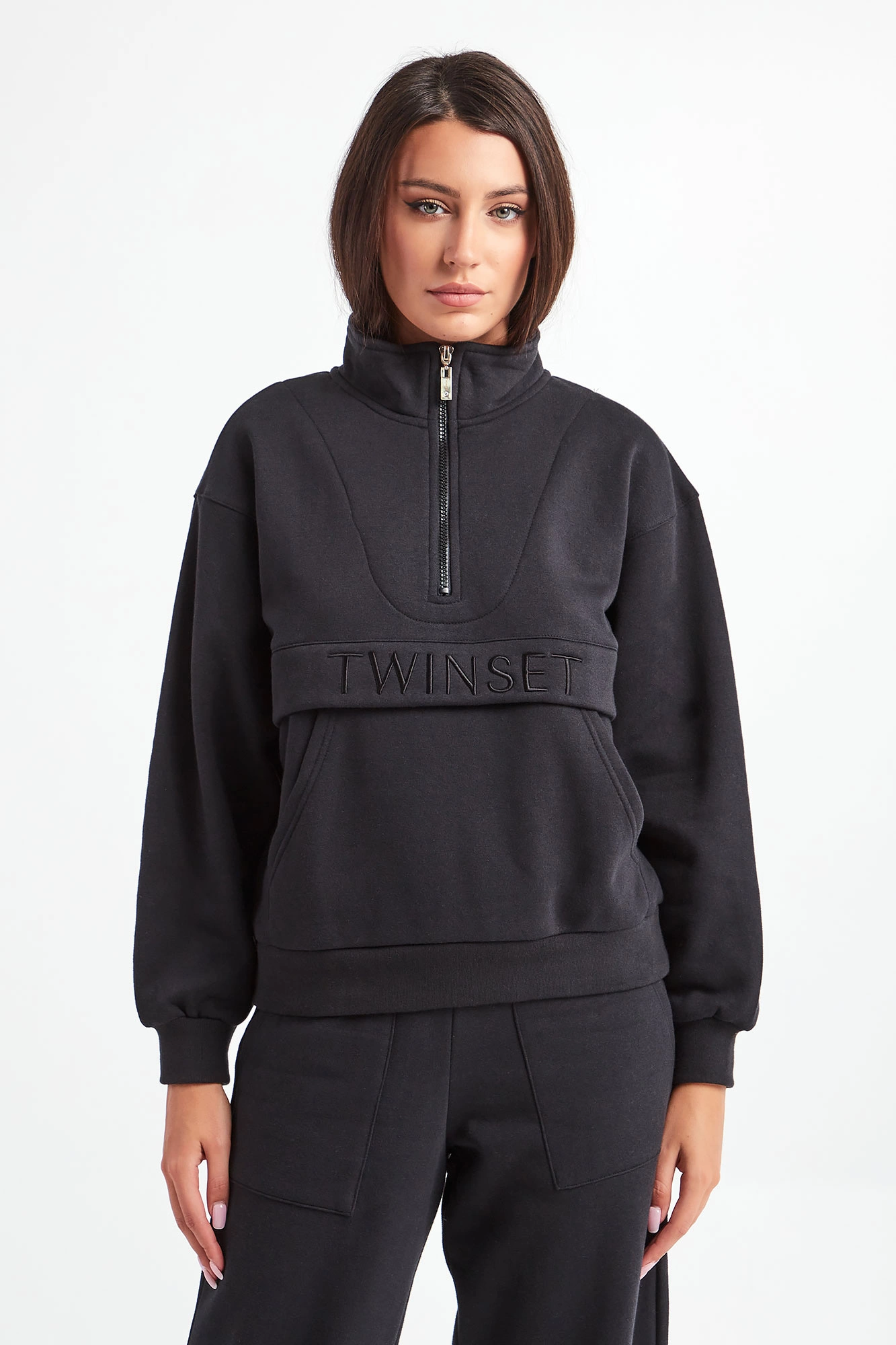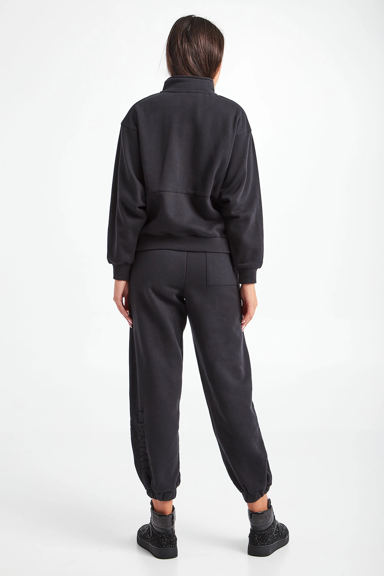 Dres marki Twinset U&B w czarnym kolorze. Fason typu relaxed. Bluza ze stójką, zapinana na zamek ekspresowy z sygnowanym suwakiem. Reglanowe, długie rękawy. Z przodu dekoracyjna patka z haftowaną nazwą marki i kangurkowa kieszeń. Rękawy i dół wykończone elastycznym ściągaczem. Na całości liczne przeszycia. Spodnie z wysokim stanem. Model z trzema kieszeniami. Na lewej nogawce haft z nazwą marki. Nogawki i góra wykończone elastycznym ściągaczem. Wykonane z czystej bawełny o grubym splocie.