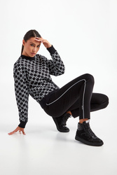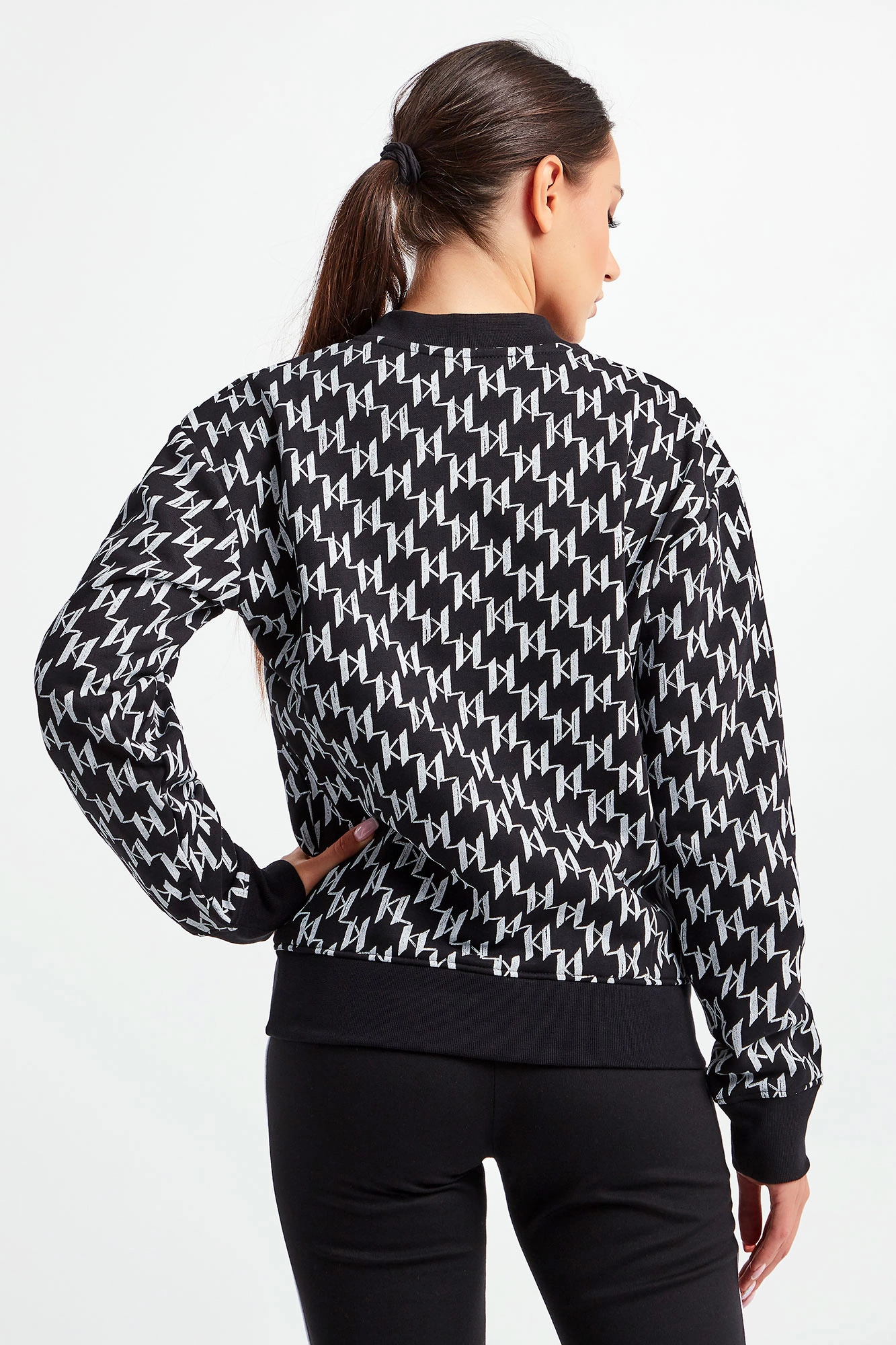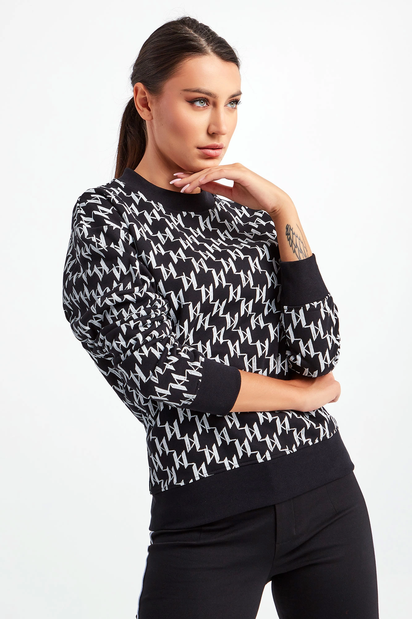 Bluza marki Karl Lagerfeld w czarnym kolorze. Fason regular fit. Na całości biały, kontrastujący wzór z monogramami marki. Okrągły dekolt, długie rękawy oraz dół wykończone ściągaczami. Wykonana z miękkiej, ciepłej, bawełnianej tkaniny.