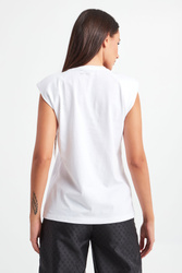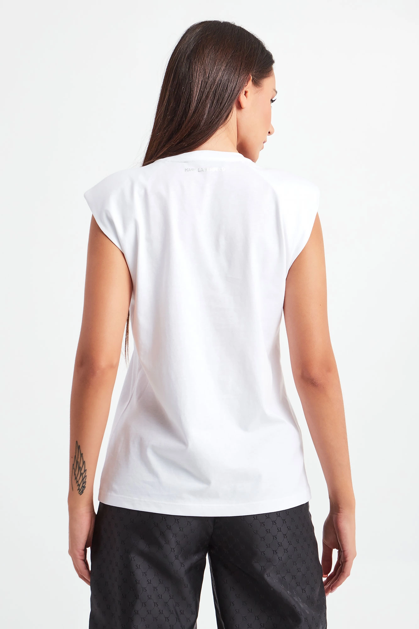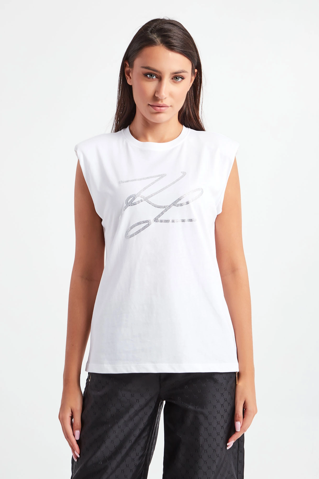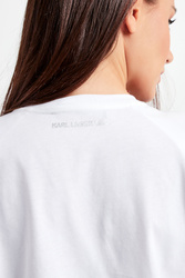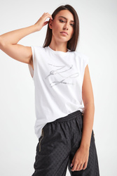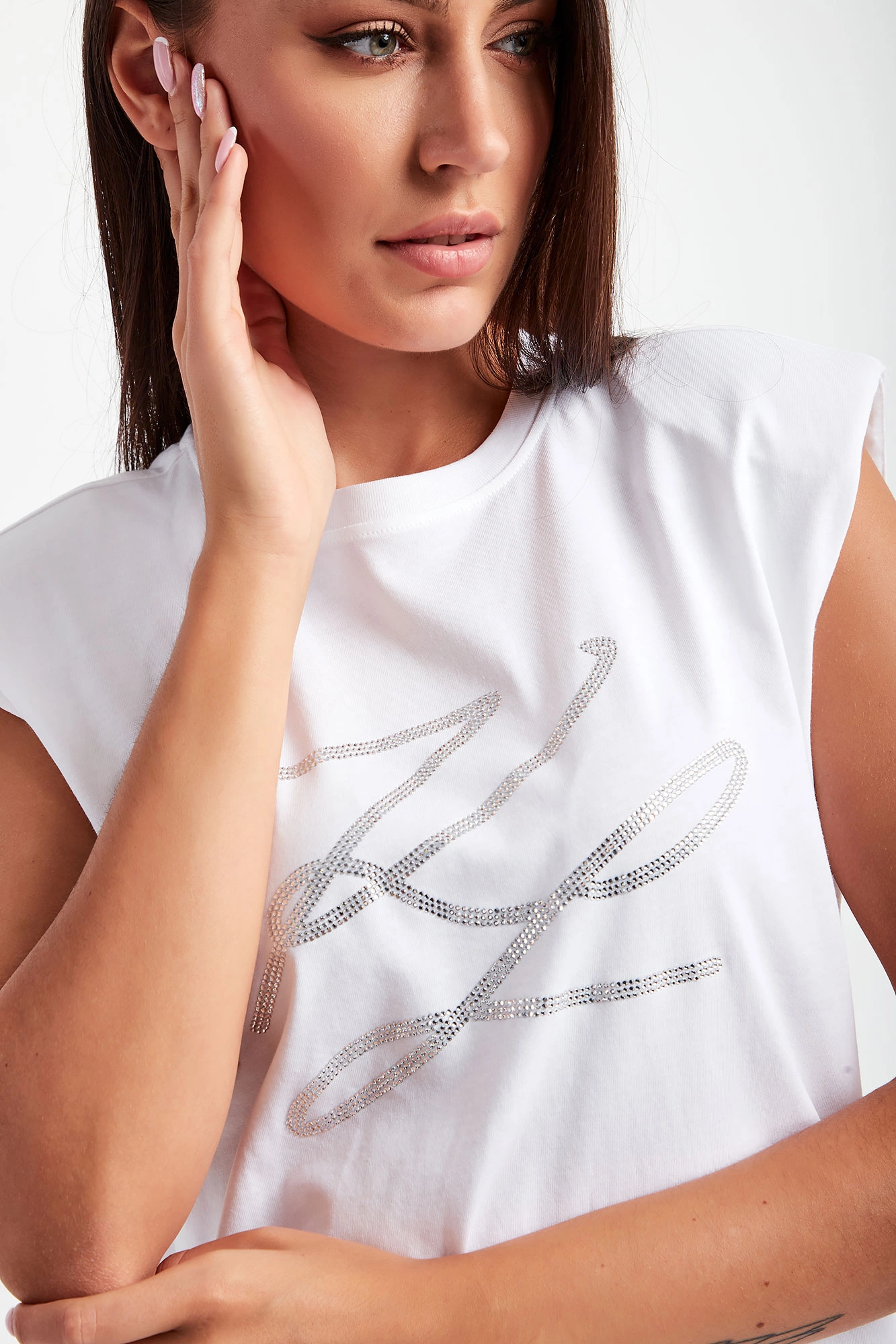 Top marki Karl Lagerfeld w białym kolorze, pochodzący z linii "Karl Cares", która wykorzystuje organiczne tkaniny, by wspierać zrównoważoną modę. Krój regular fit. Z przodu monogram marki wykonany ze srebrnych, połyskujących kryształków. Okrągły dekolt zakończony ściągaczem. Na ramionach wszyte poduszki. Dół wykończony lamówką. Wykonany z czystej bawełny organicznej.
