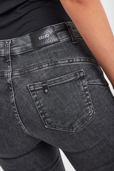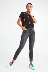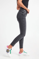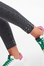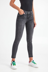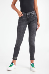 Jeansy marki Liu Jo w czarnym kolorze. Fason typu skinny fit z wycięciem bottom up. Wąska nogawka do kostek, wykończona na surowo z grafitowymi, metalowymi dżetami. Model z pięcioma kieszeniami. Zapinane na zamek błyskawiczny i sygnowany guzik w srebrnym kolorze. W pasie szlufki. Z tyłu skórzana wstawka z nazwą marki i metalowa aplikacja.