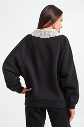 Bluza marki Ermanno Firenze w czarnym kolorze. Fason regular fit. Z przodu czarno-biały nadruk z nazwą marki. Przy okrągłym dekolcie odpinany, biały kołnierzyk z koronki, ozdobiony srebrnymi, połyskującymi kryształkami. Długie rękawy oraz dół wykończone ściągaczami. Wykonana z czystej bawełny.