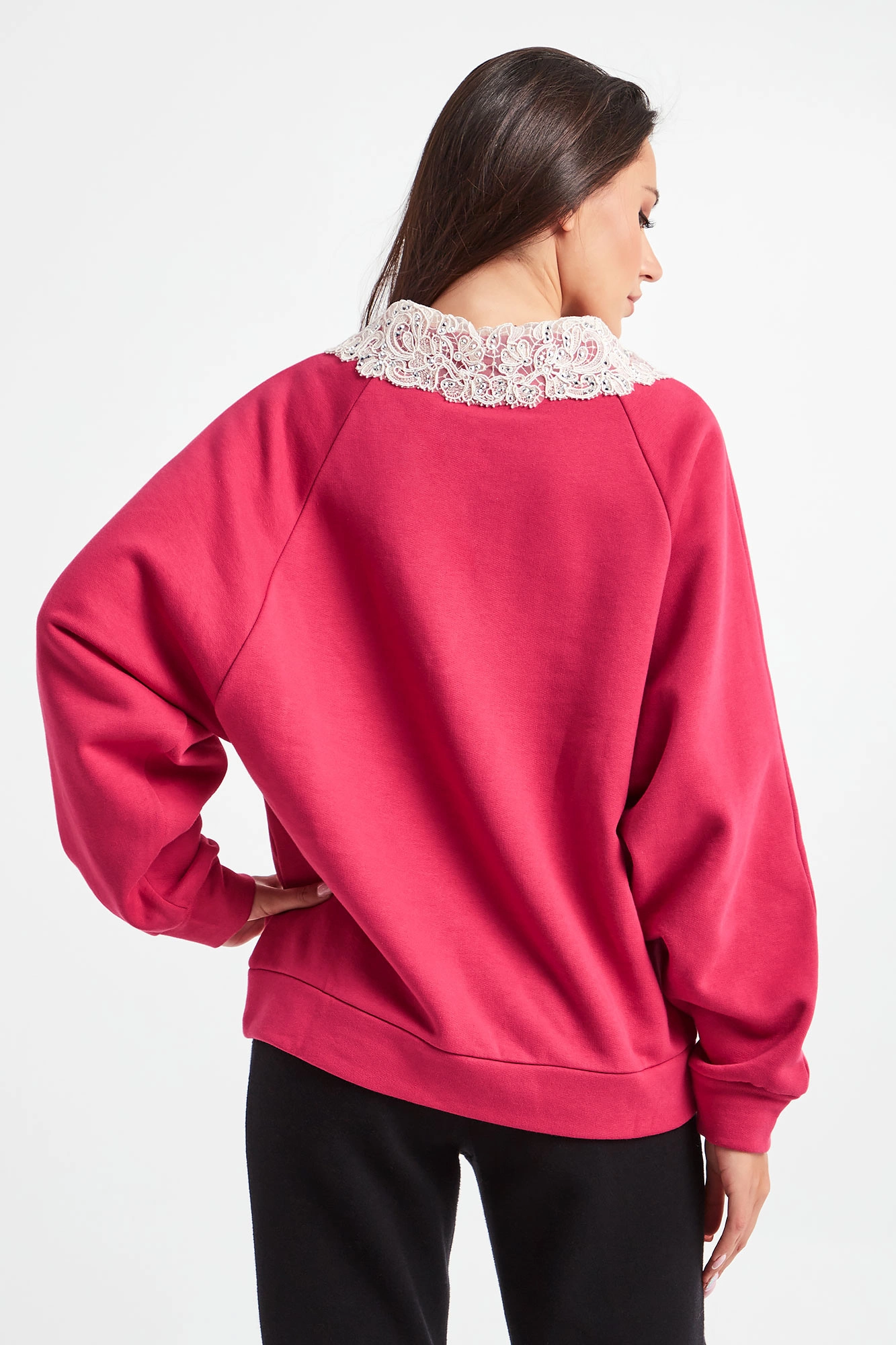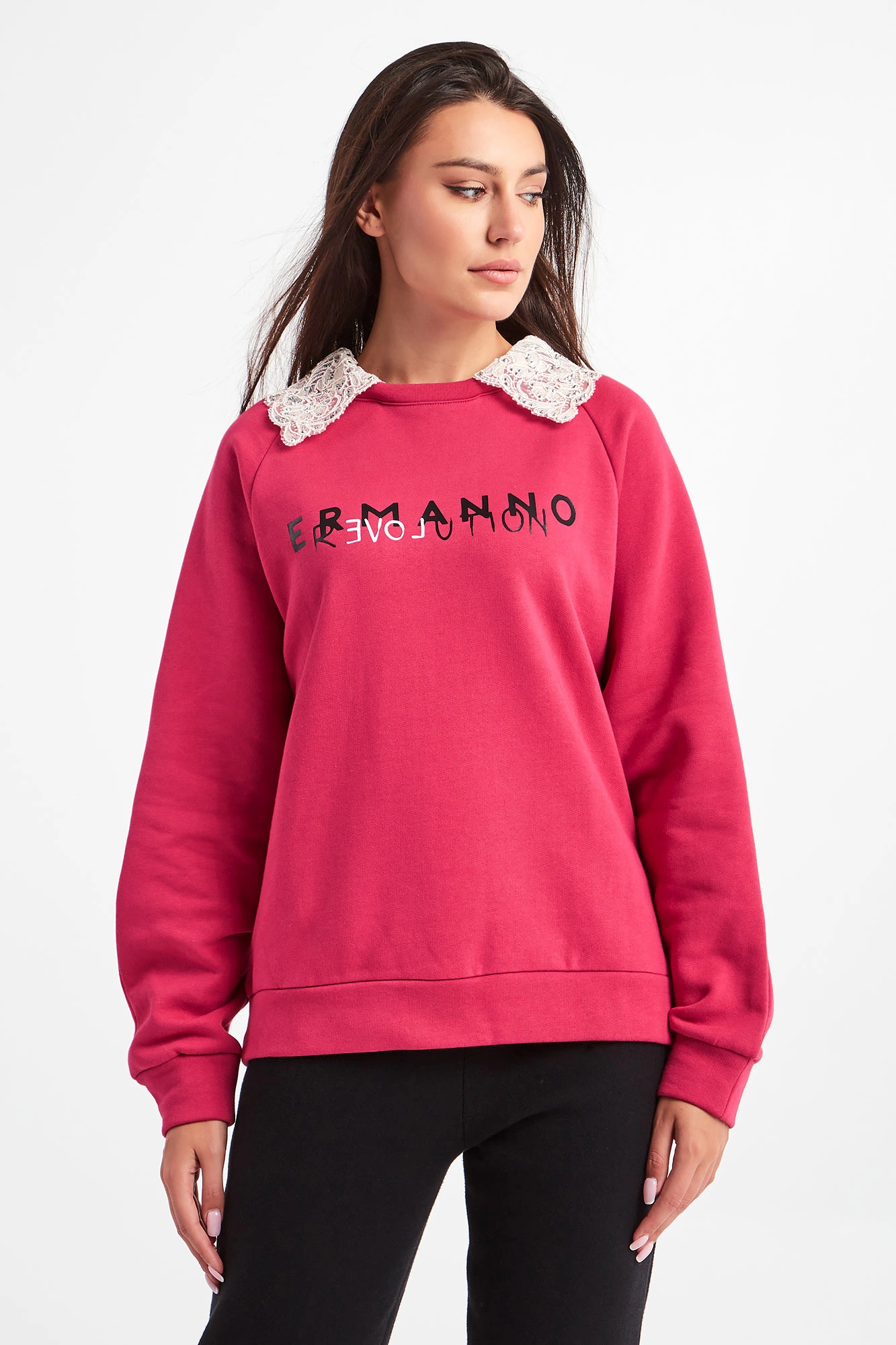 Bluza marki Ermanno Firenze w różowym, fuksjowym kolorze. Fason regular fit. Z przodu czarno-biały nadruk z nazwą marki. Przy okrągłym dekolcie odpinany, biały kołnierzyk z koronki, ozdobiony srebrnymi, połyskującymi kryształkami. Długie rękawy oraz dół wykończone ściągaczami. Wykonana z czystej bawełny.