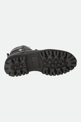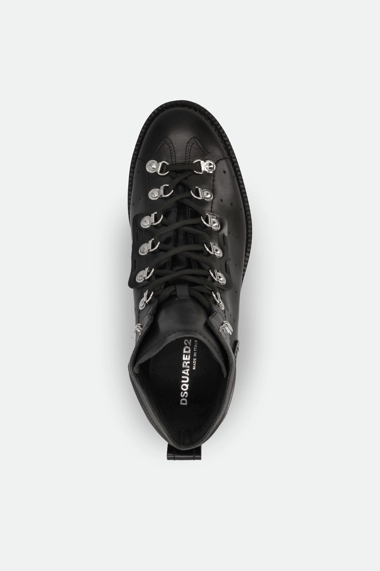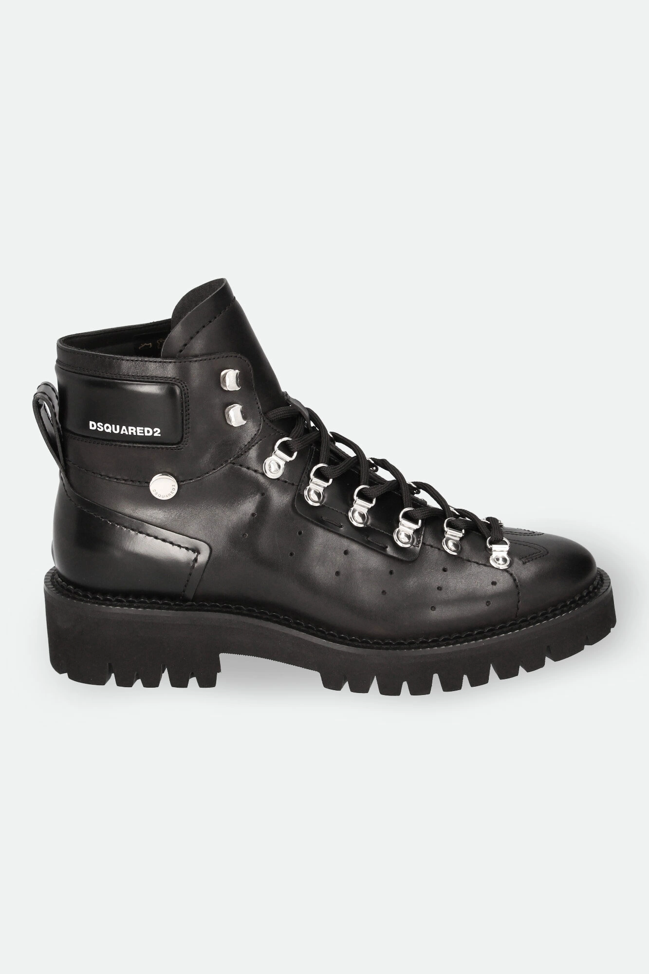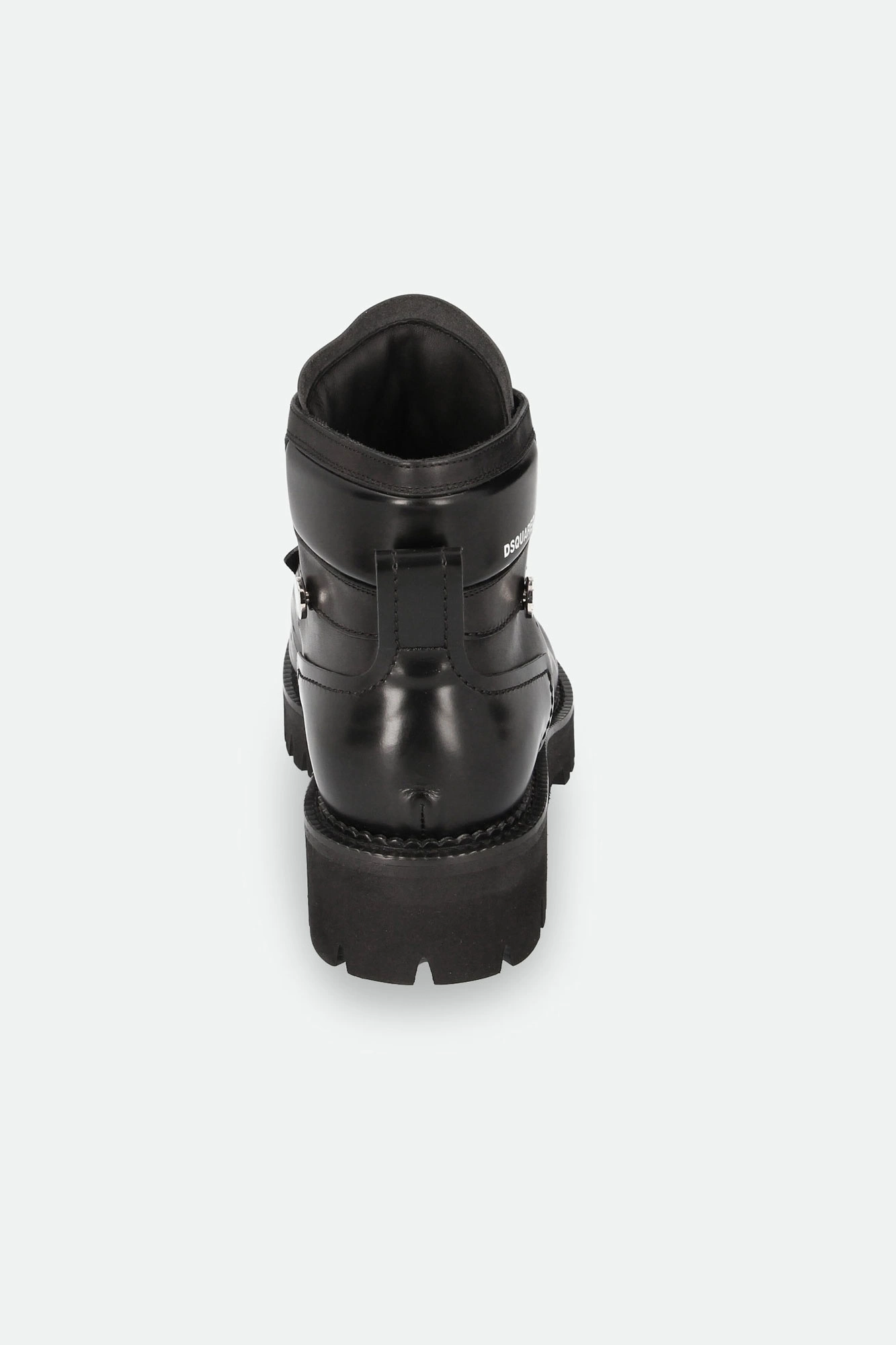 Trapery marki Dsquared2 w czarnym kolorze. Wykonane ze skóry naturalnej. Wiązane za pomocą sznurówek. u góry dodatkowe haczyki. Z boku, na cholewce biały, kontrastujący napis w postaci nazwy marki oraz sygnowany dżet. Z boków dziurkowania. Na noskach ozdobne przeszycia. Z tyłu uchwyty ułatwiające zakładanie. Całości dopełnia wysoka podeszwa.