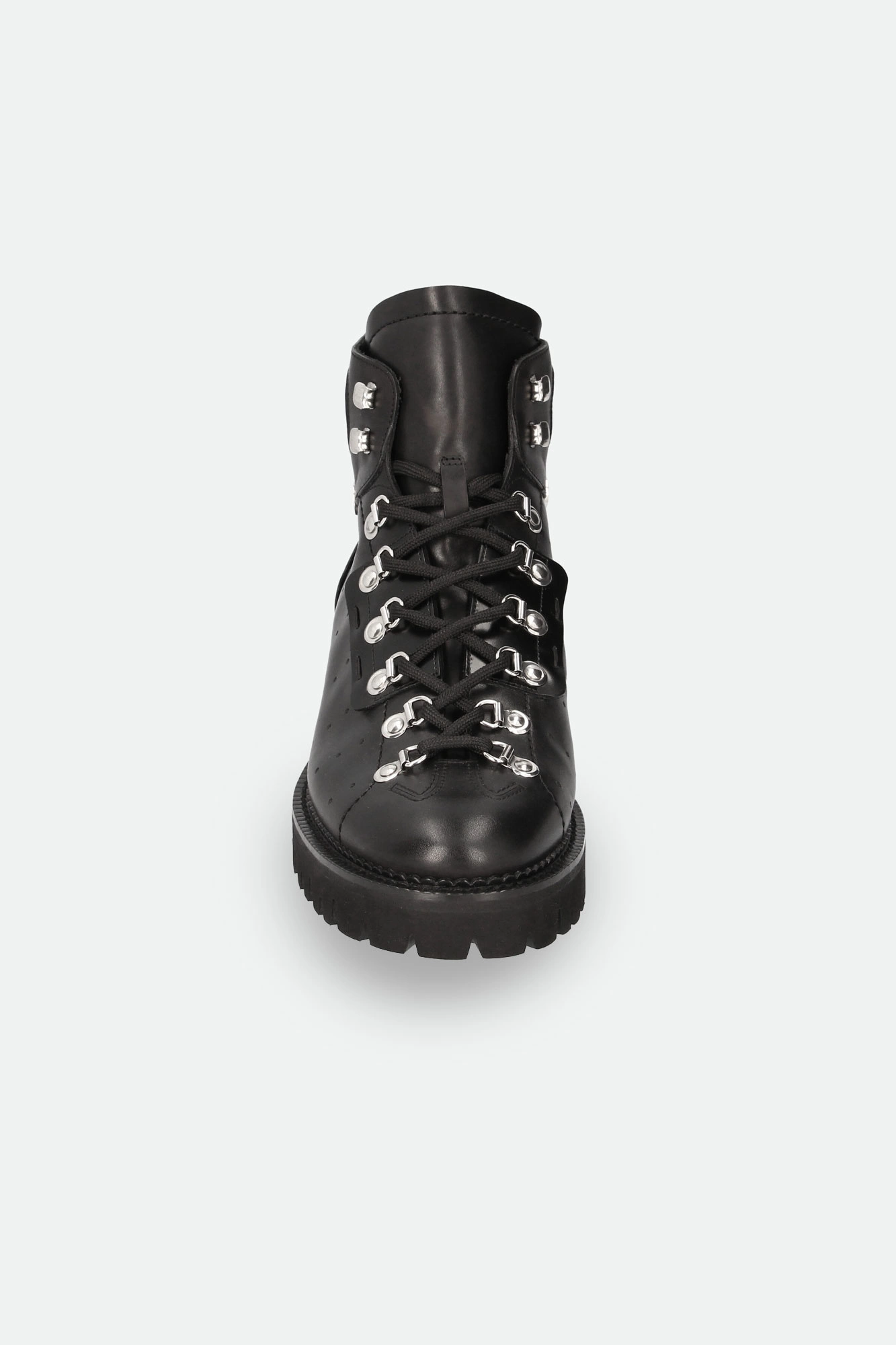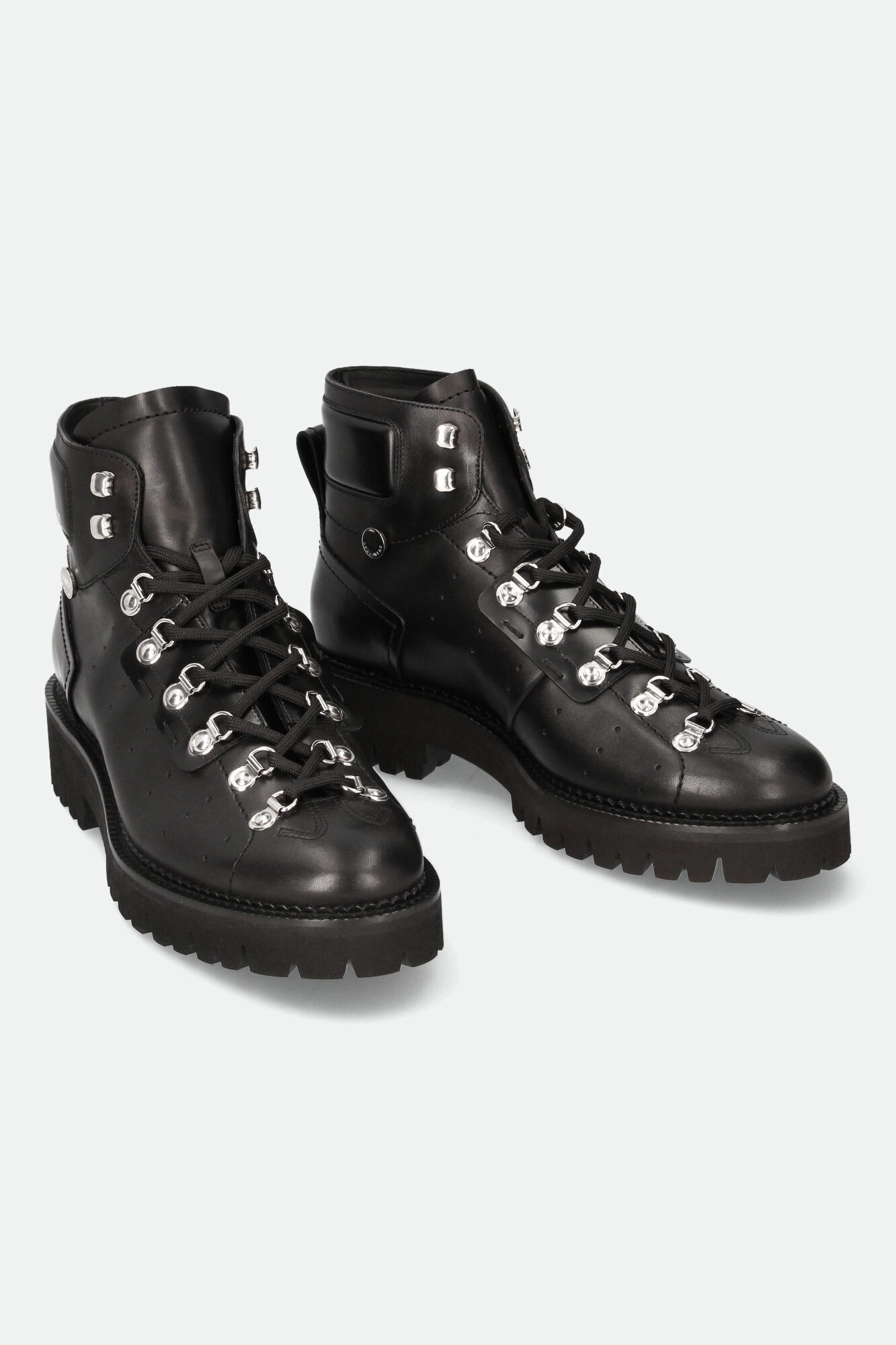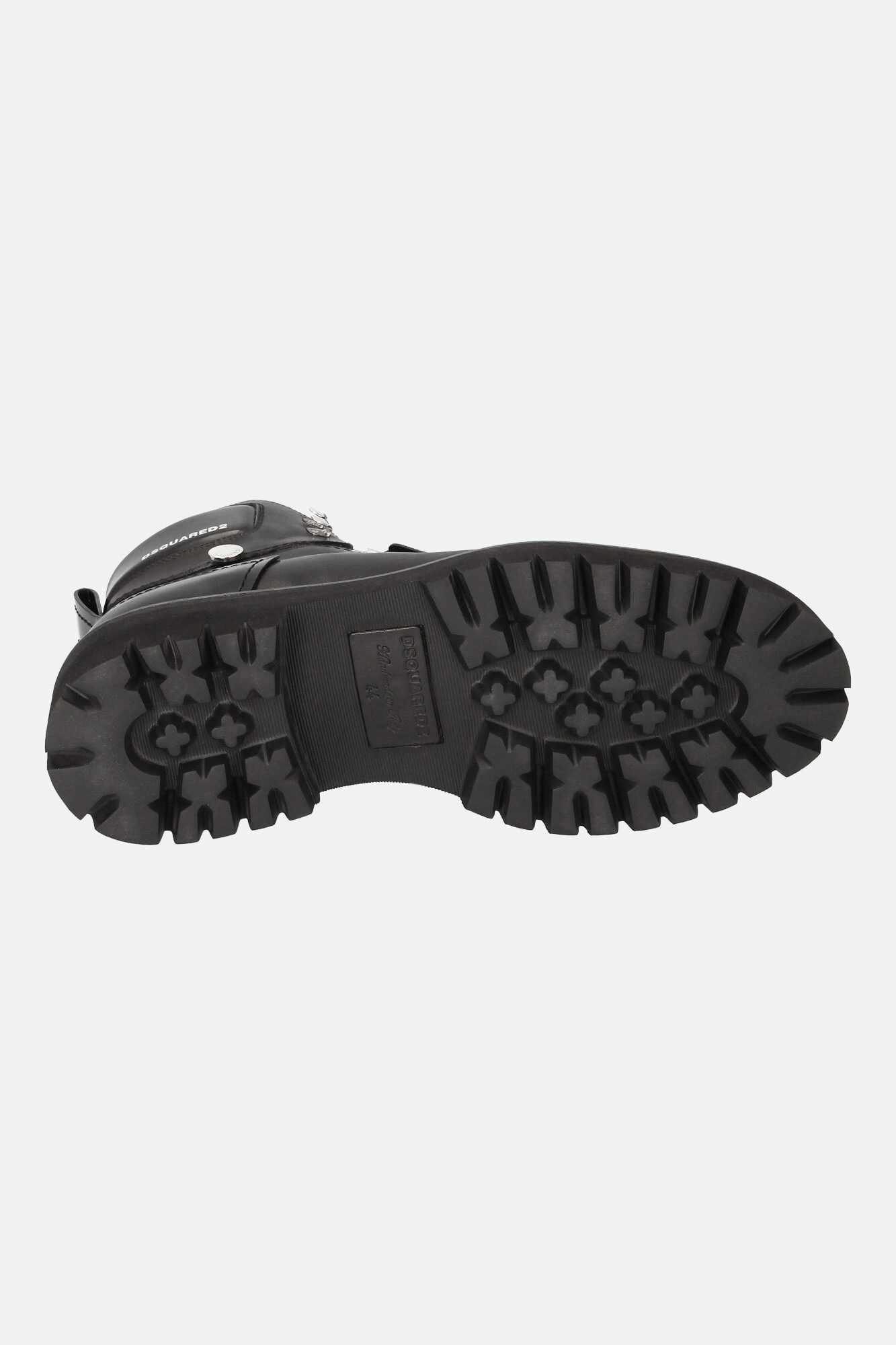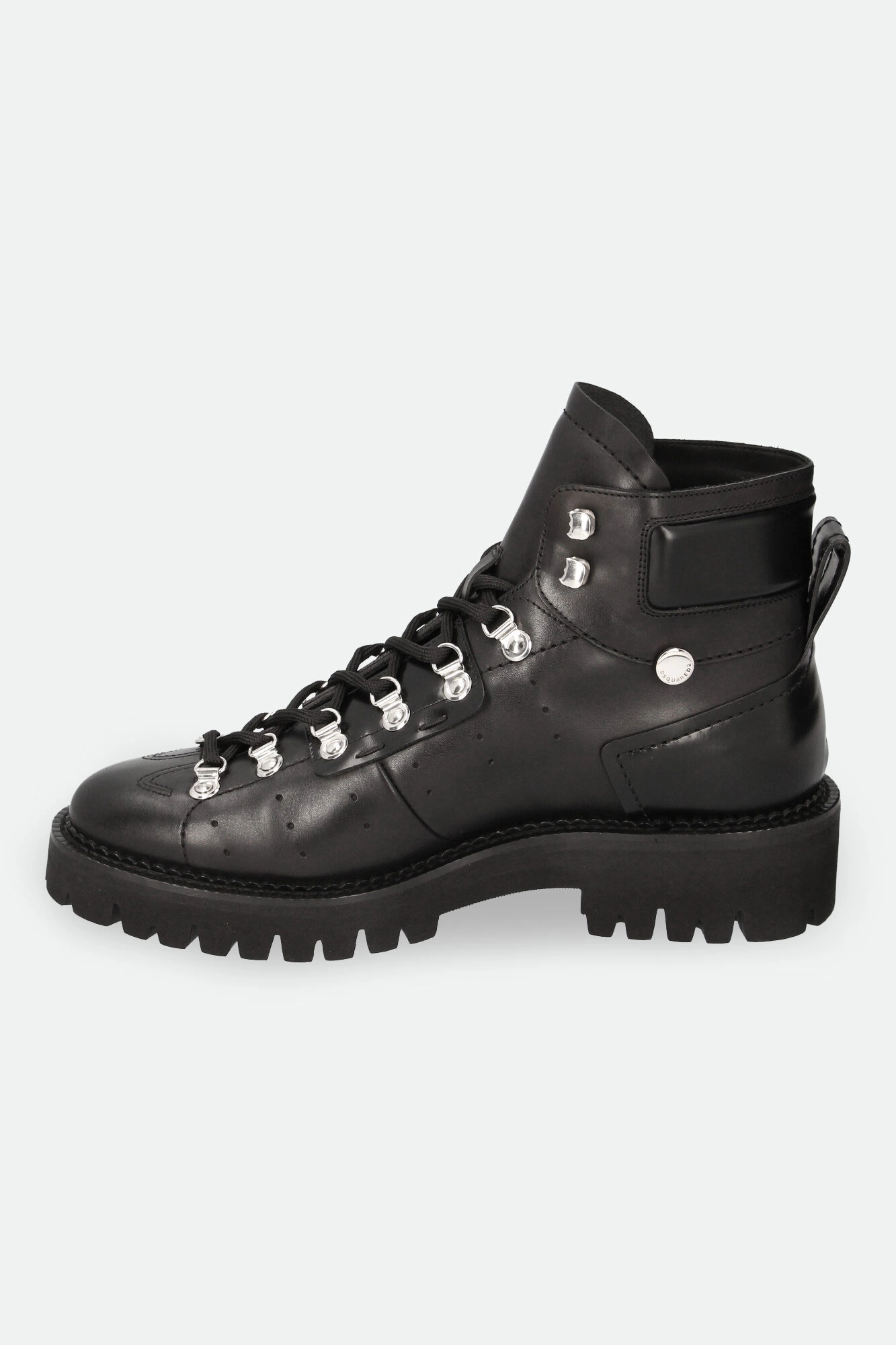 Trapery marki Dsquared2 w czarnym kolorze. Wykonane ze skóry naturalnej. Wiązane za pomocą sznurówek. u góry dodatkowe haczyki. Z boku, na cholewce biały, kontrastujący napis w postaci nazwy marki oraz sygnowany dżet. Z boków dziurkowania. Na noskach ozdobne przeszycia. Z tyłu uchwyty ułatwiające zakładanie. Całości dopełnia wysoka podeszwa.