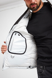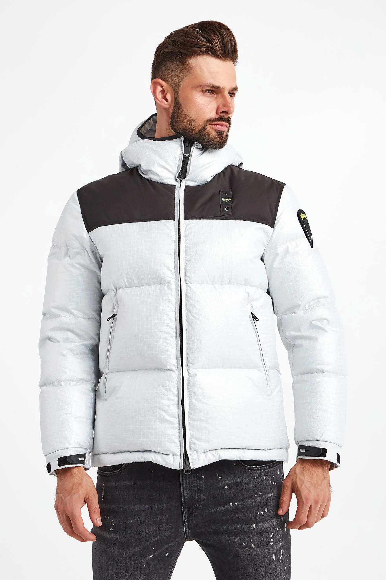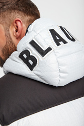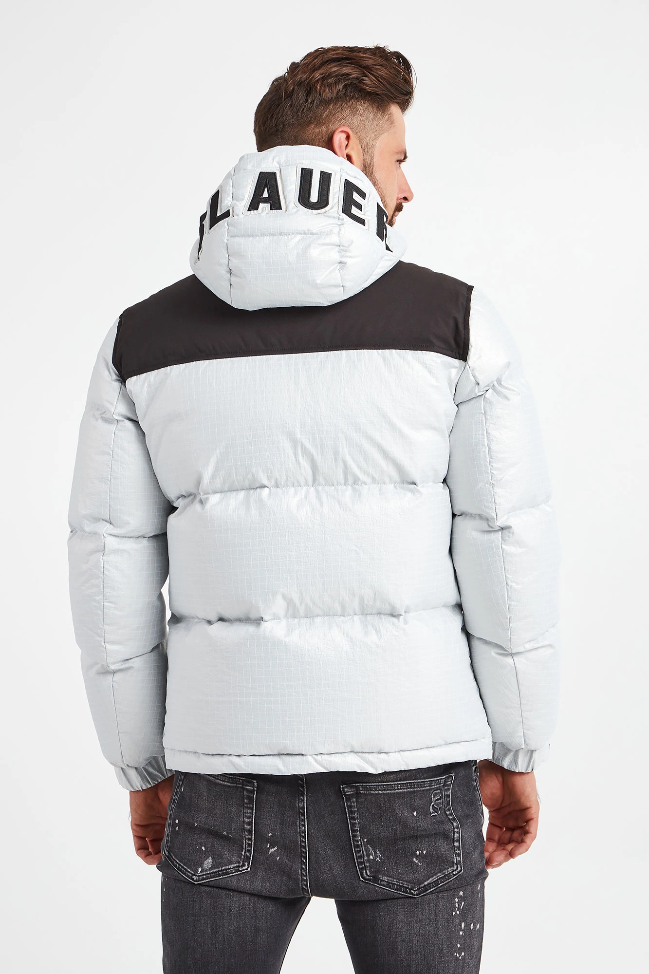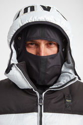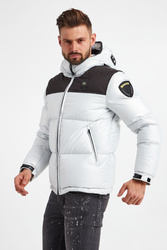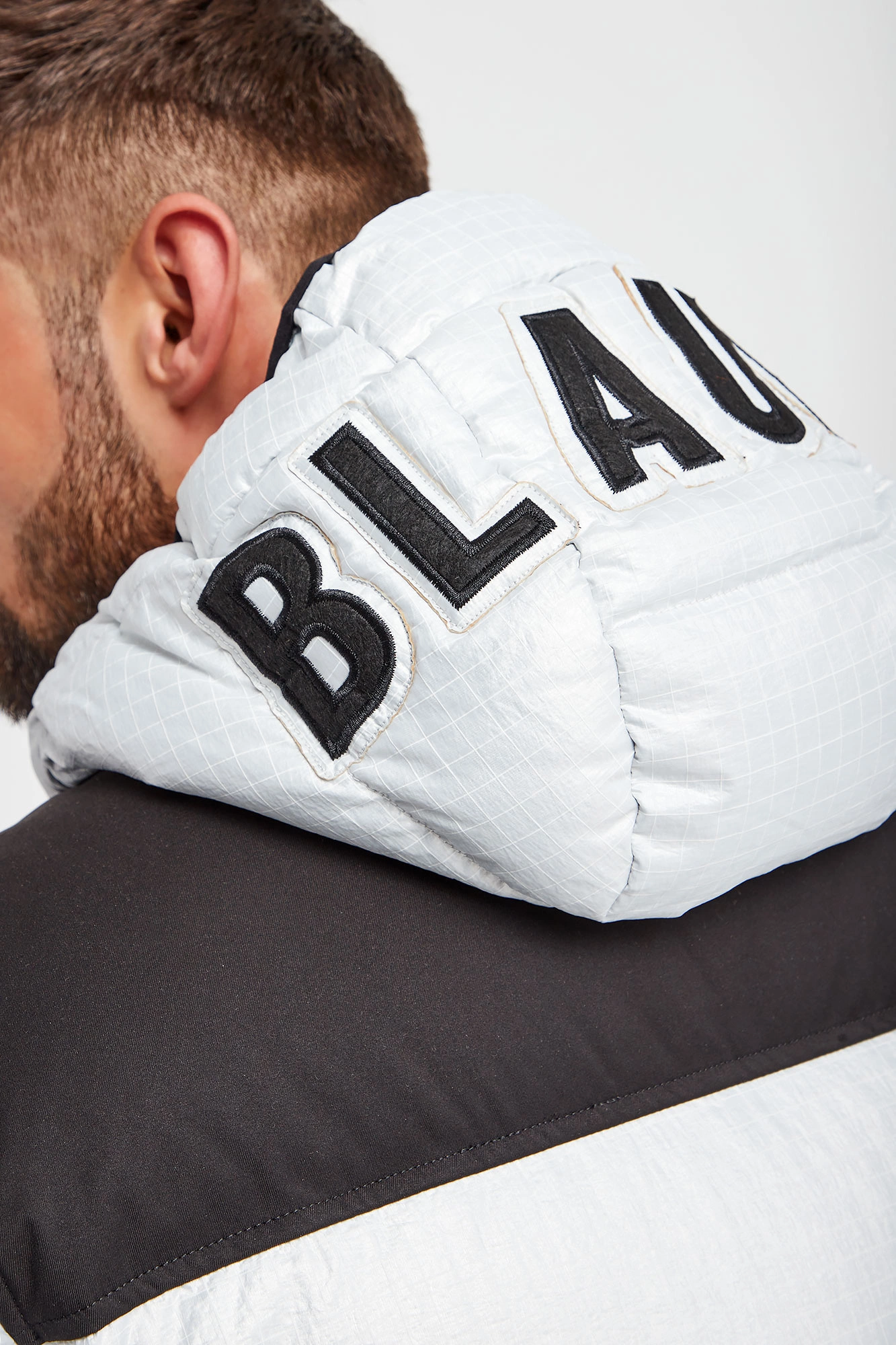 Pikowana kurtka z kapturem w czarno-białym kolorze. Zapinana na dwukierunkowy zamek z sygnowaną zawieszką. Na kapturze duży, czarny haft w postaci nazwy marki. Z przodu dwie zapinane kieszenie. Dół regulowany za pomocą troczków. Na lewym rękawie haftowana aplikacja z nazwą marki. Podszewka pikowana w białym kolorze. Wewnątrz dwie zapinane kieszenie. Wypełnienie z kaczego puchu i pierza. Lekka i ciepła.