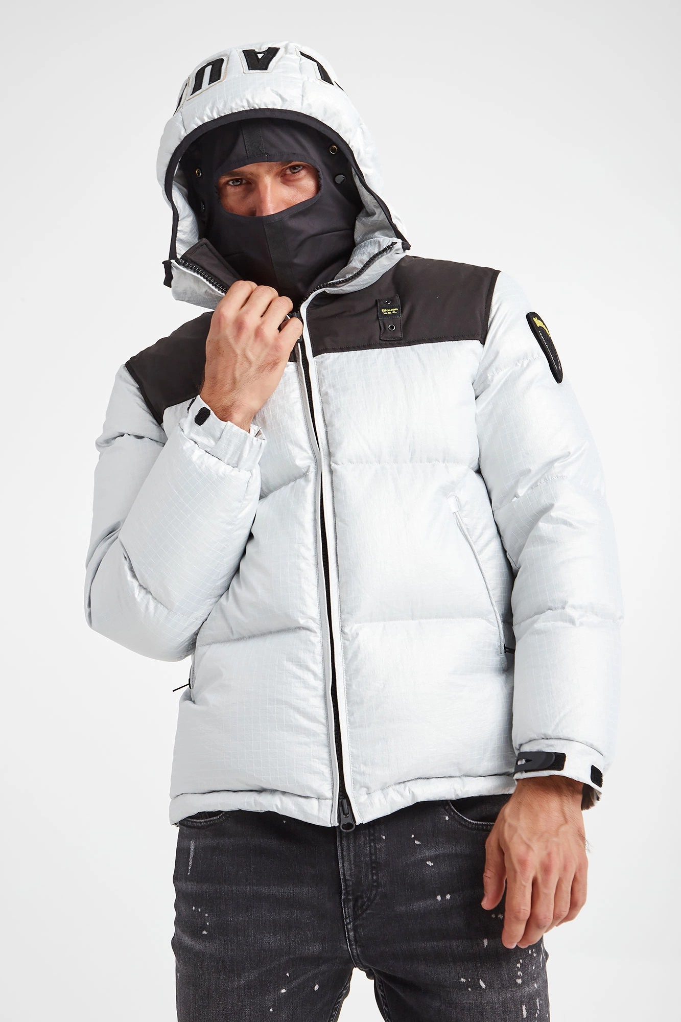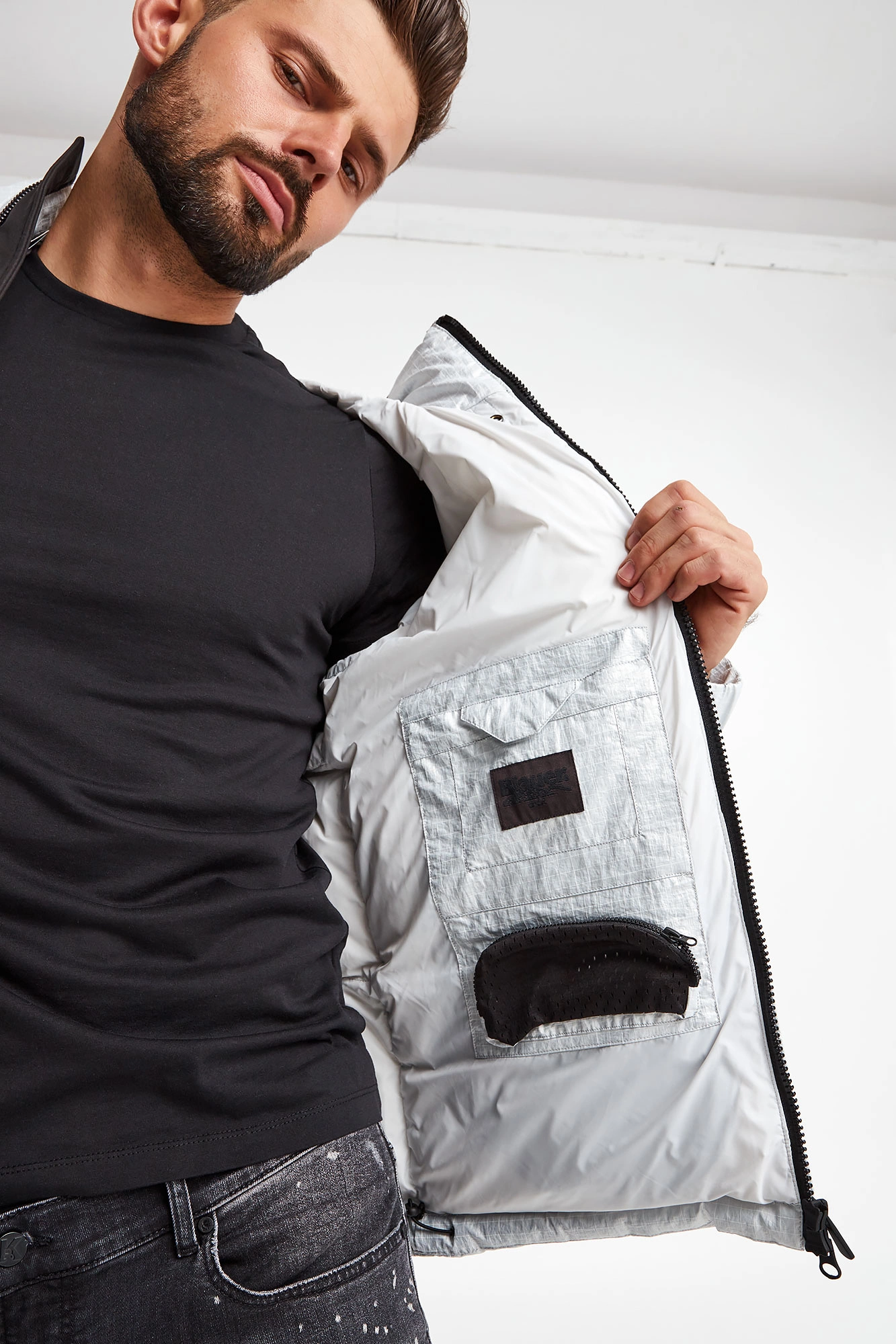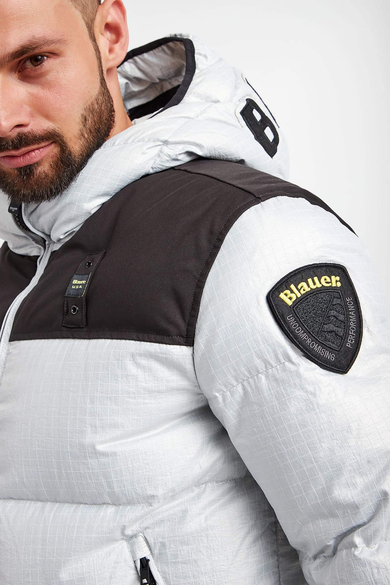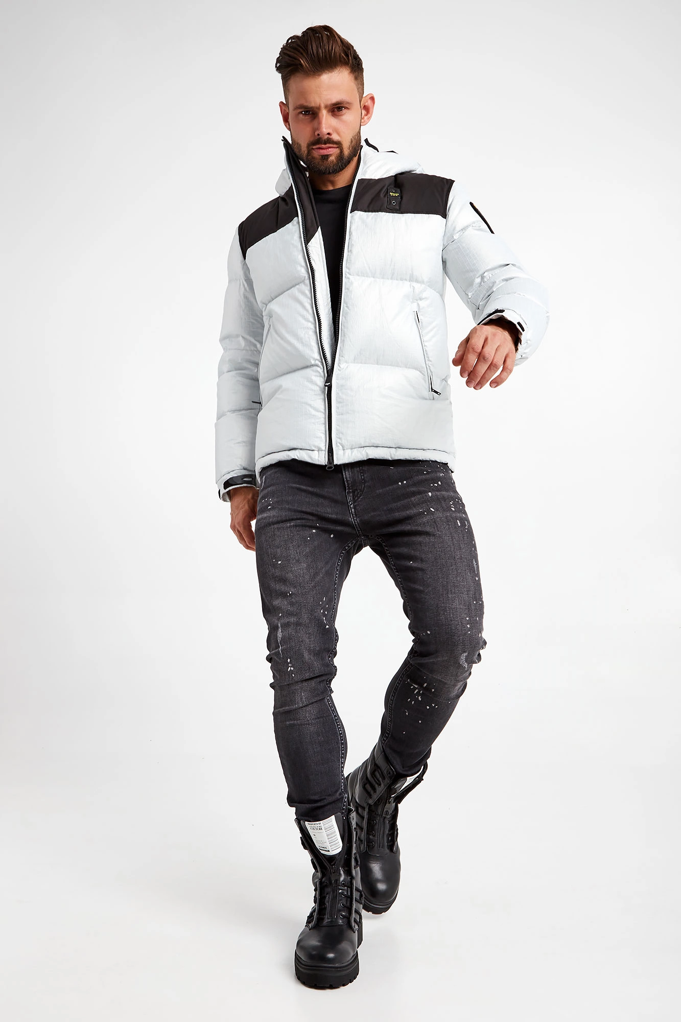 Pikowana kurtka z kapturem w czarno-białym kolorze. Zapinana na dwukierunkowy zamek z sygnowaną zawieszką. Na kapturze duży, czarny haft w postaci nazwy marki. Z przodu dwie zapinane kieszenie. Dół regulowany za pomocą troczków. Na lewym rękawie haftowana aplikacja z nazwą marki. Podszewka pikowana w białym kolorze. Wewnątrz dwie zapinane kieszenie. Wypełnienie z kaczego puchu i pierza. Lekka i ciepła.