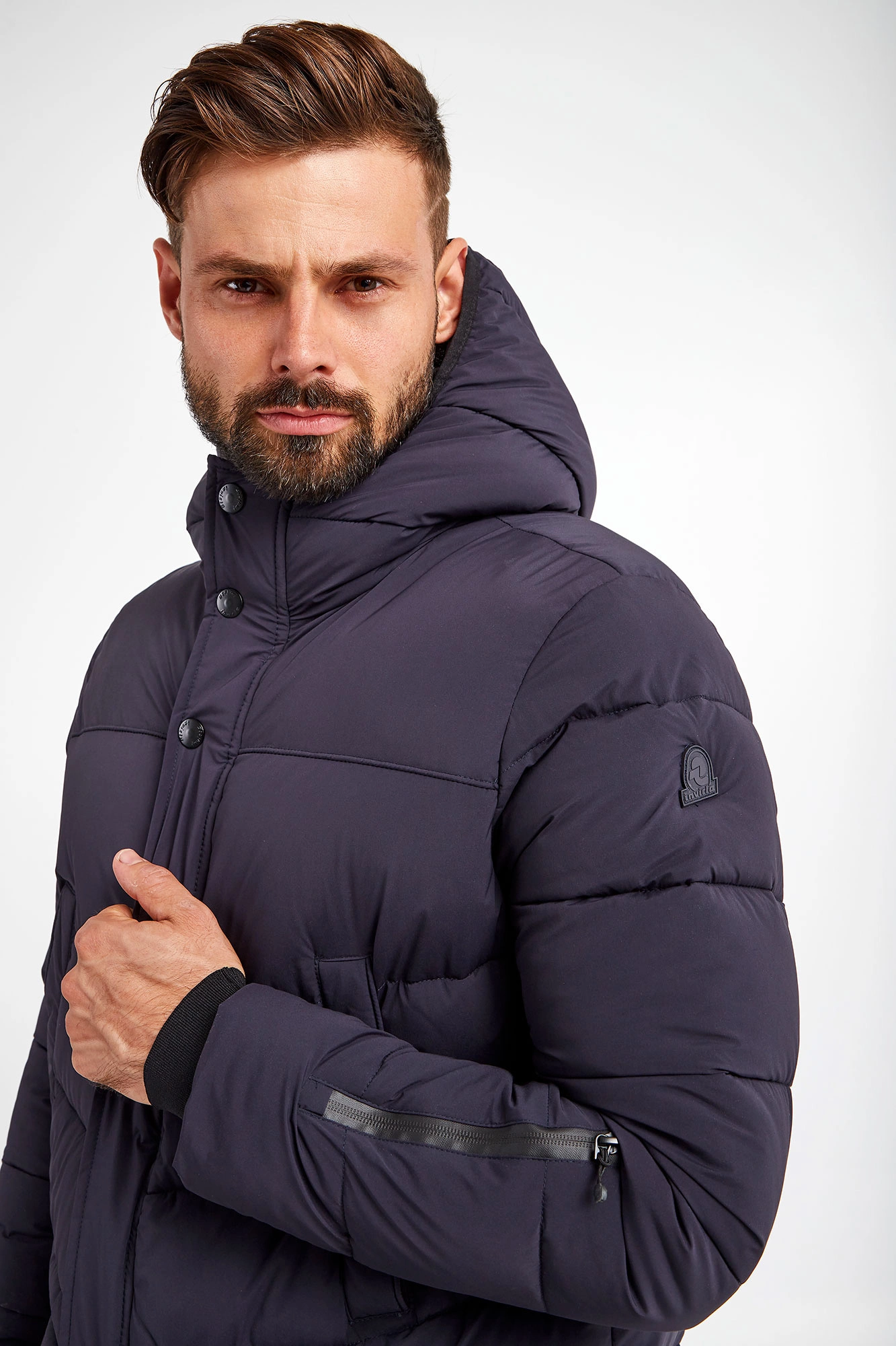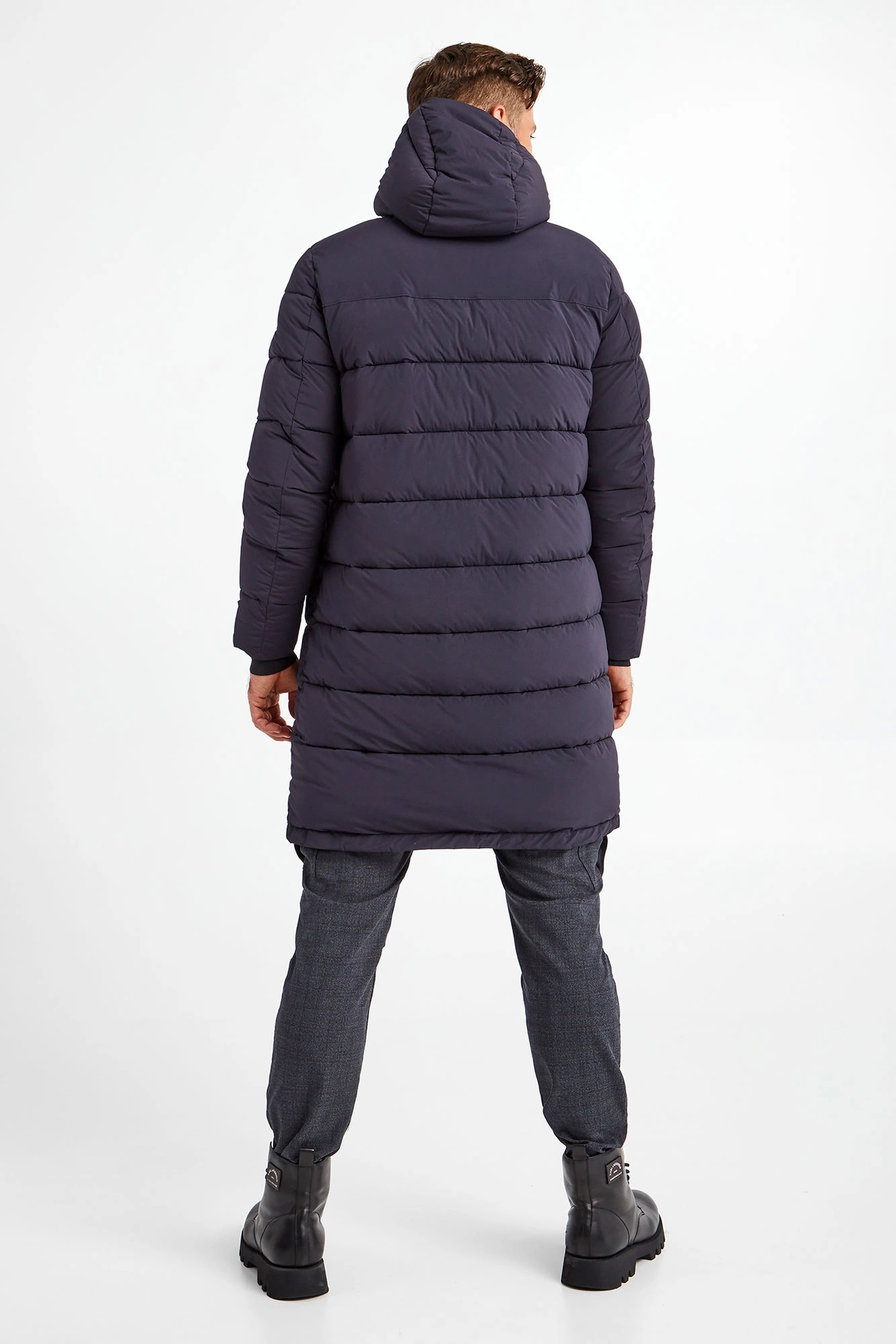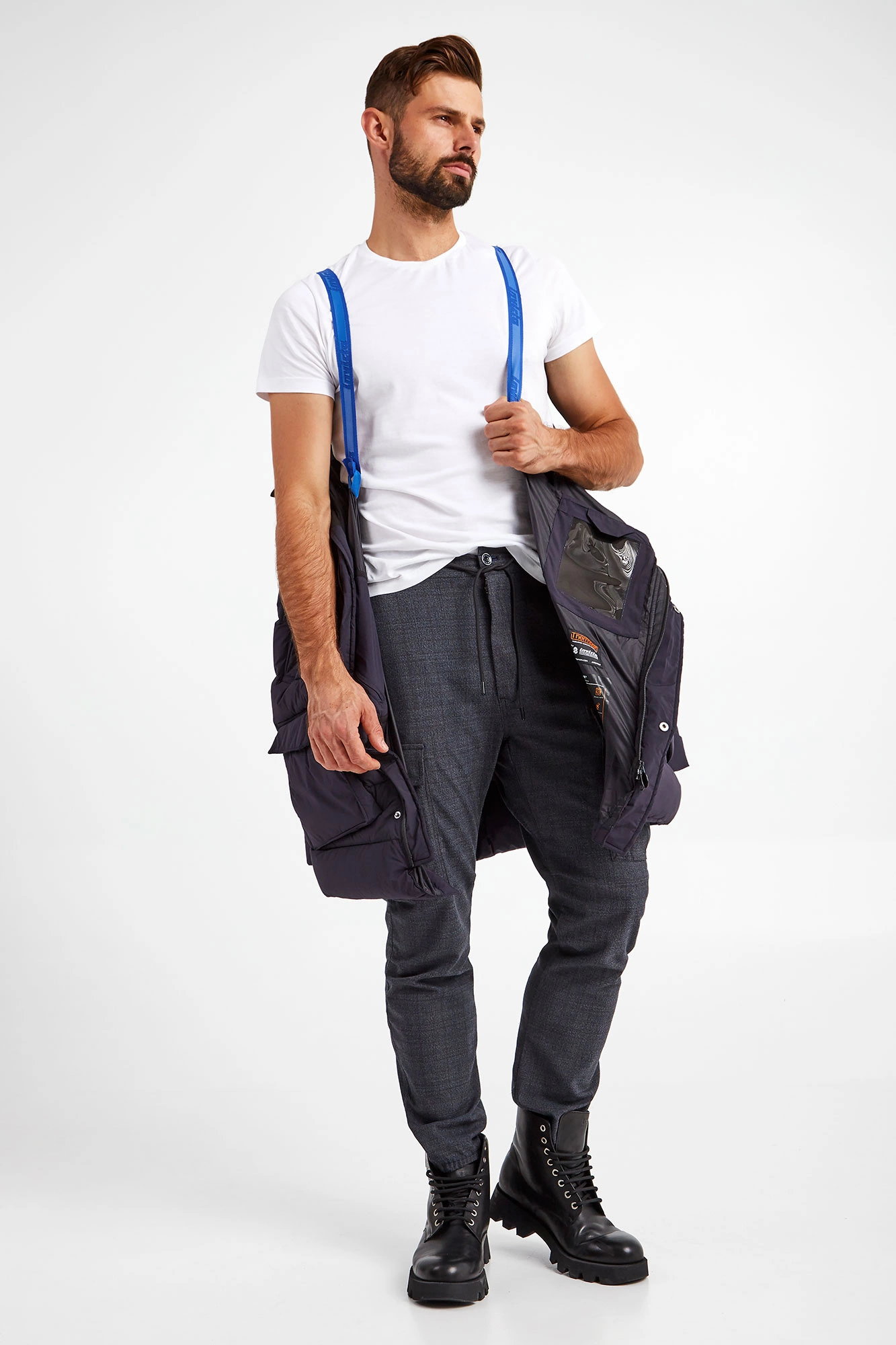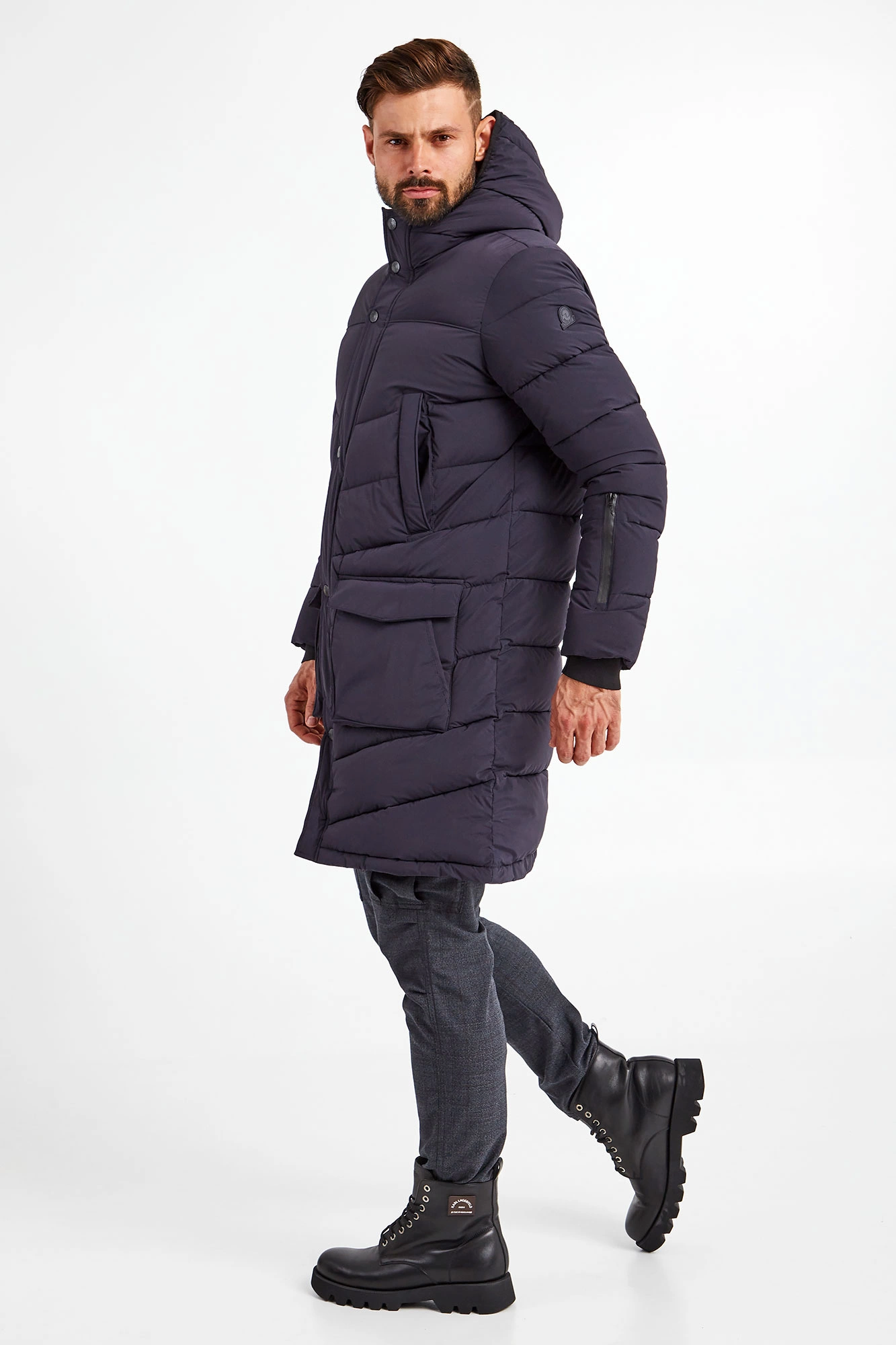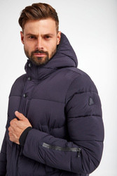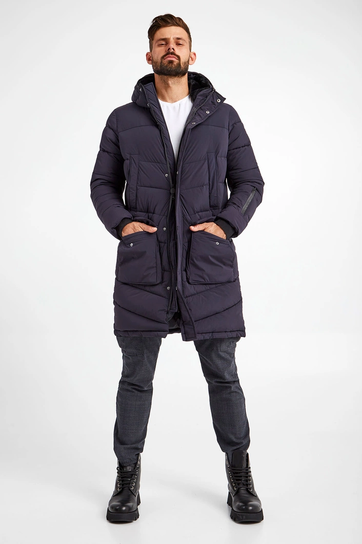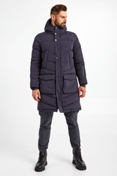 Pikowana kurtka marki Invicta w granatowym kolorze. Fason typu regular. Z kapturem, z futerkową, czarną wyściółką. Model z siedmioma kieszeniami. Długie rękawy wykończone elastycznym ściągaczem. Na jednym gumowa aplikacja z logo i nazwą marki. Zapinana na dwukierunkowy zamek błyskawiczny i sygnowane napy, pokryte materiałową tasiemką. Wewnątrz odpinane szelki i dodatkowe trzy kieszenie. Sztuczne wypełnienie.