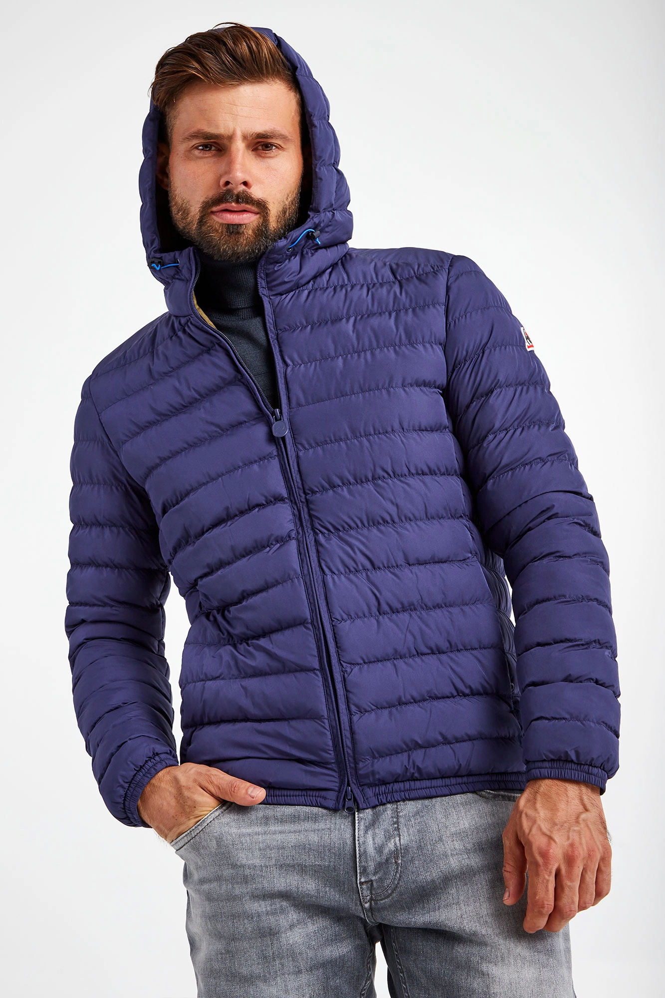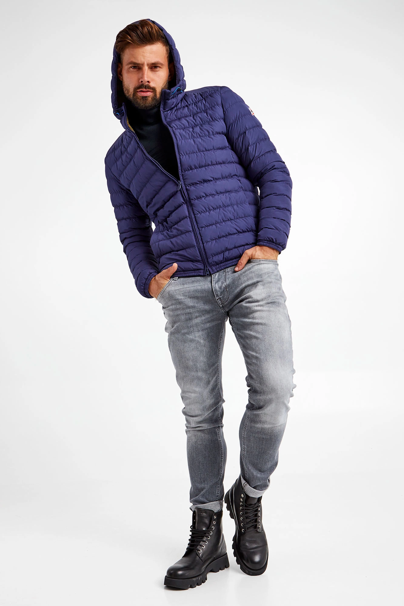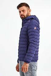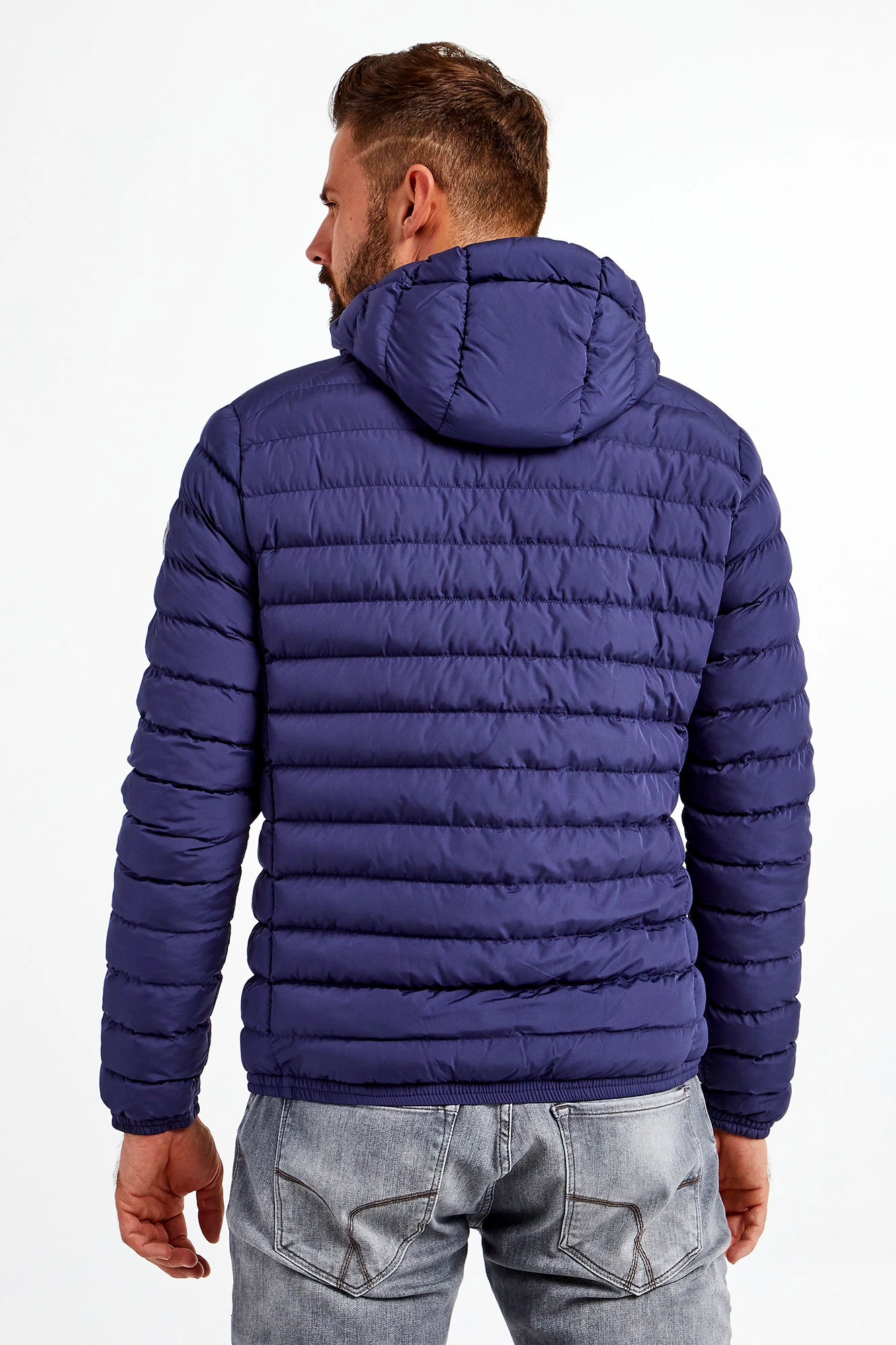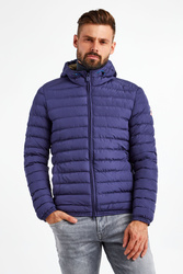 Pikowana kurtka marki Invicta w niebieskim kolorze. Z kapturem regulowanym za pomocą elastycznych troczków ze stoperem w kontrastowym, kobaltowym kolorze. Zapinana na dwukierunkowy zamek błyskawiczny w kolorze kurtki, pokryty materiałem. Długie rękawy i dół wykończone elastycznym ściągaczem. Wewnątrz szelki. Na rękawie gumowa aplikacja z logo i nazwa marki. Wyściółka w kolorze khaki. Wykonany z ekologicznego materiału, wspierającego zrównoważoną modę.
