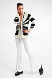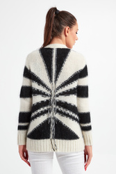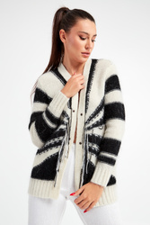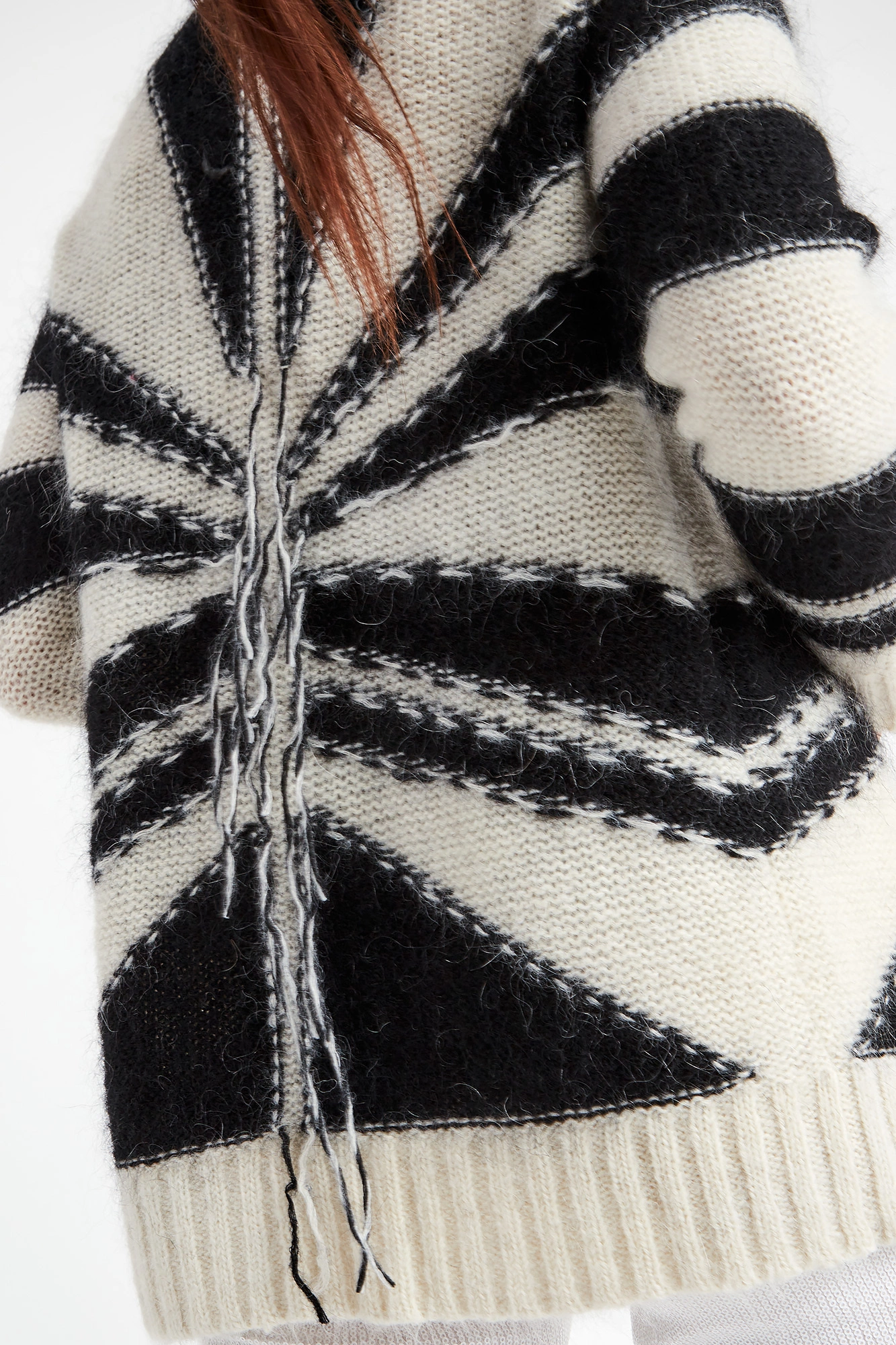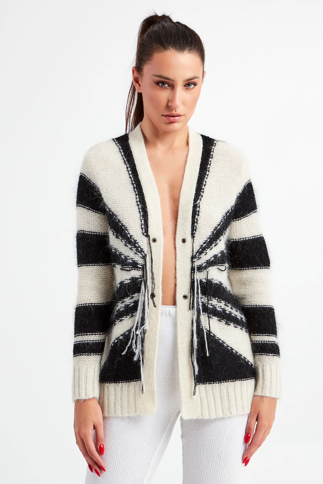 Kardigan marki John Richmond w kolorze ecru. Fason typu rekaxed. Na całości czarne wstawki i ozdobne frędzle. Niezapinany. Długie rękawy i dół zakończone ściągaczem. Wykonane z ciepłej, elastycznej mieszanki wełny i moheru.