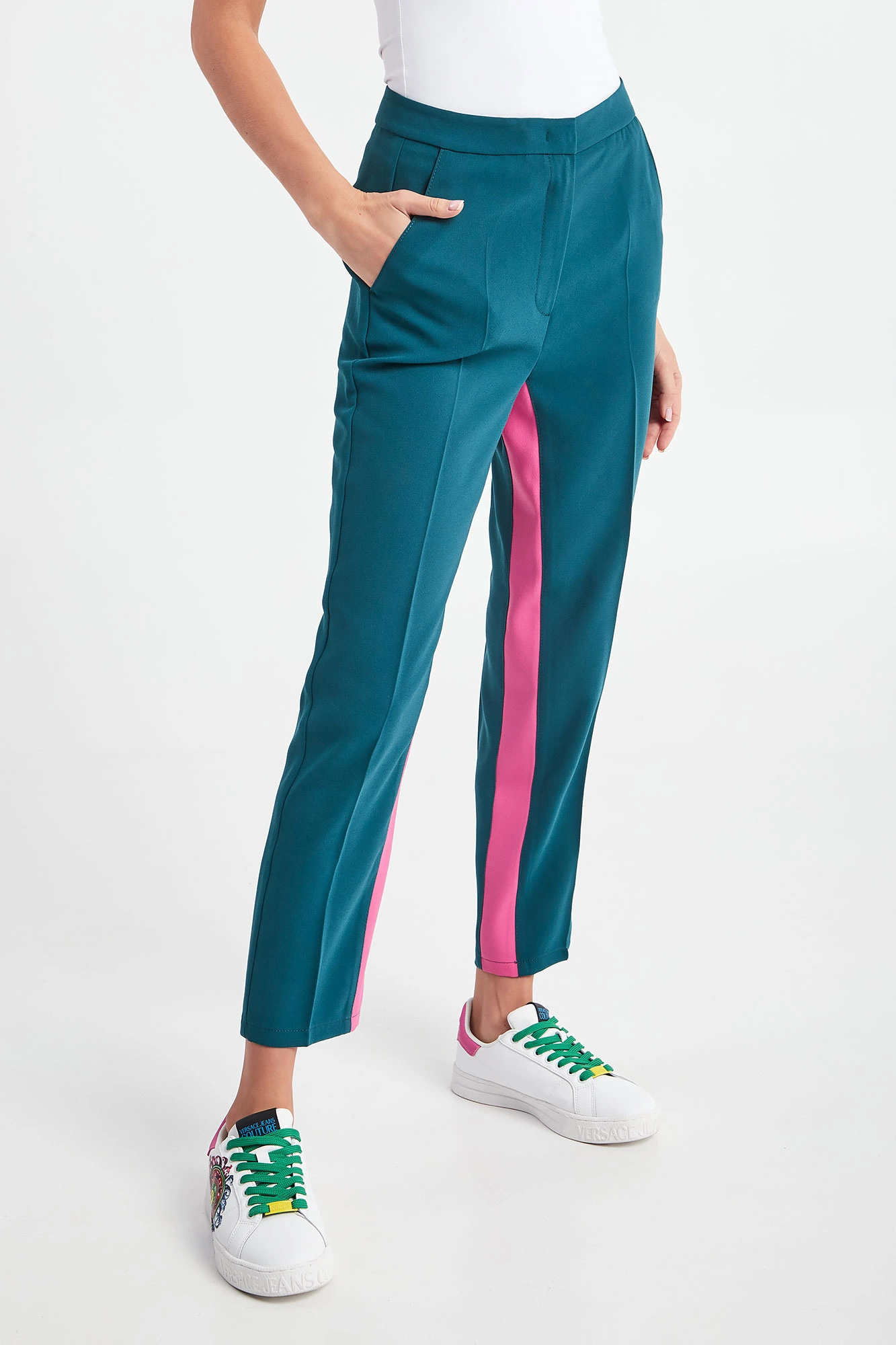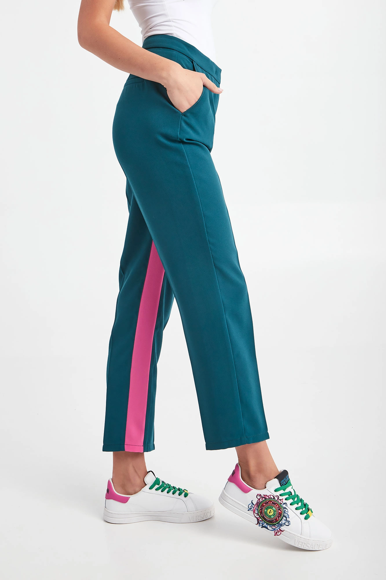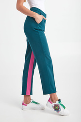Spodnie marki Ice Play w zielonym kolorze. Fason regular fit. Po bokach od wewnętrznej strony nogawek lampasy w kolorze różowym. Z zaprasowanym kantem. Zapinane na haftkę oraz zamek ukryty pod klapką. Dwie boczne, wpuszczane kieszenie.