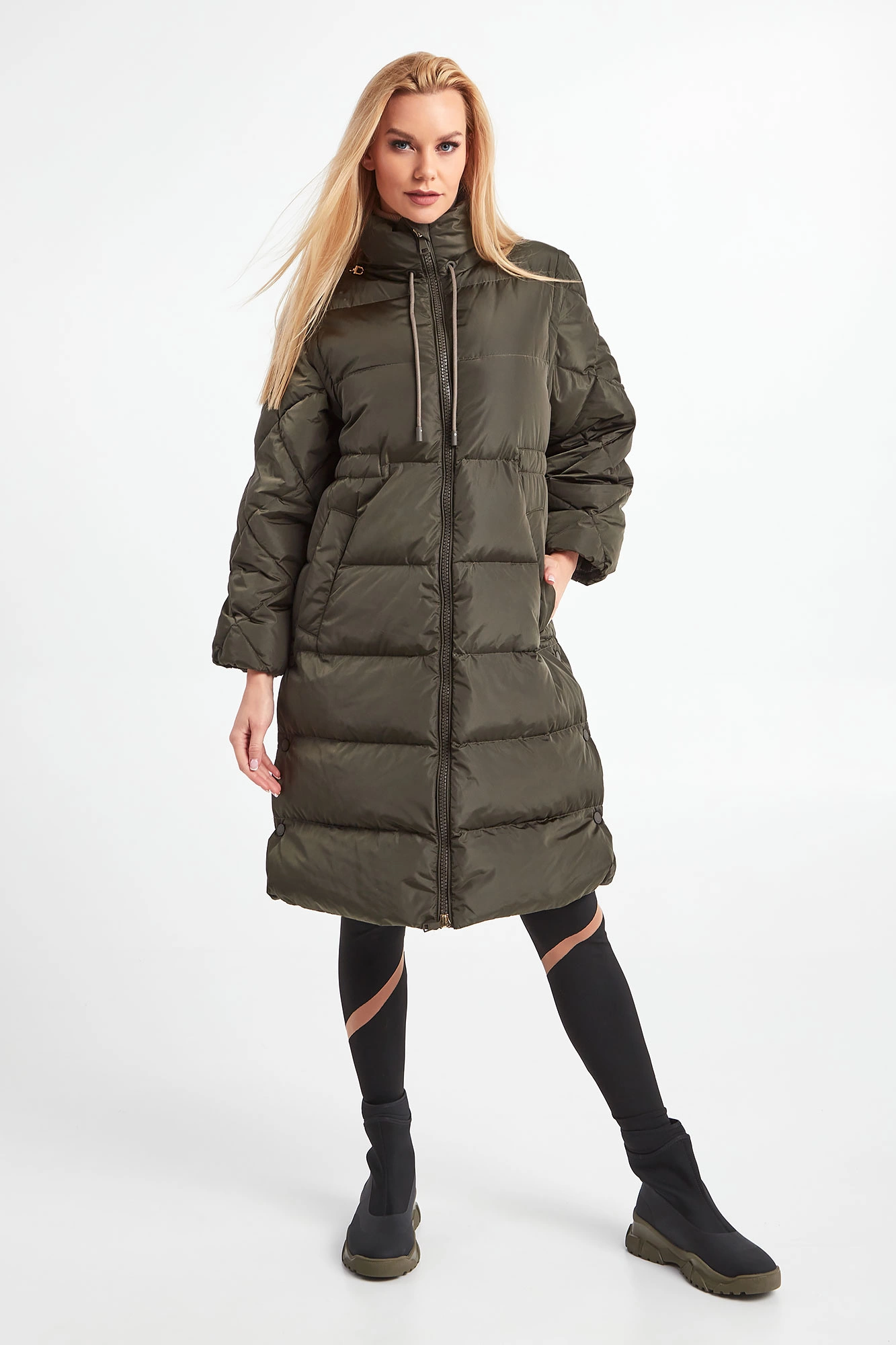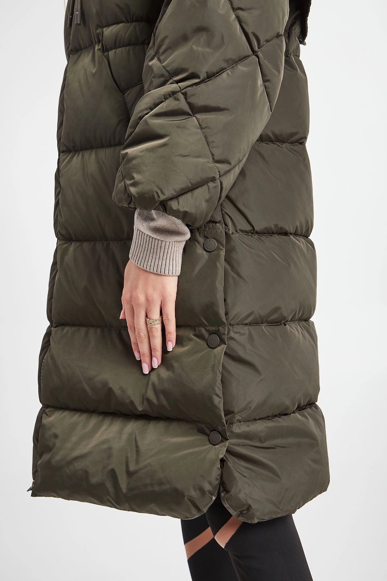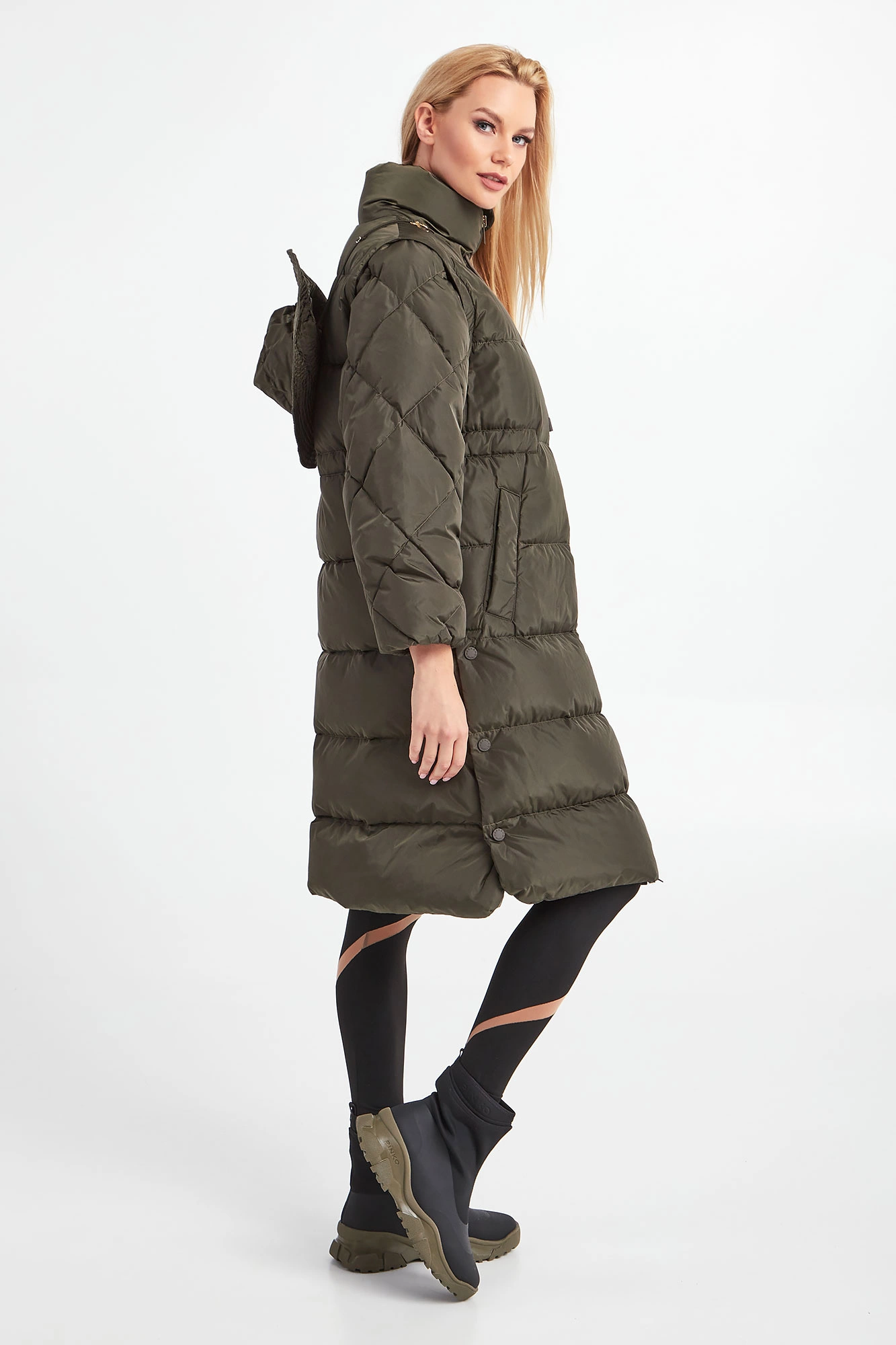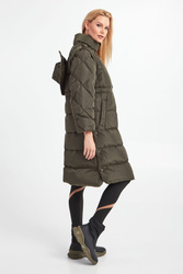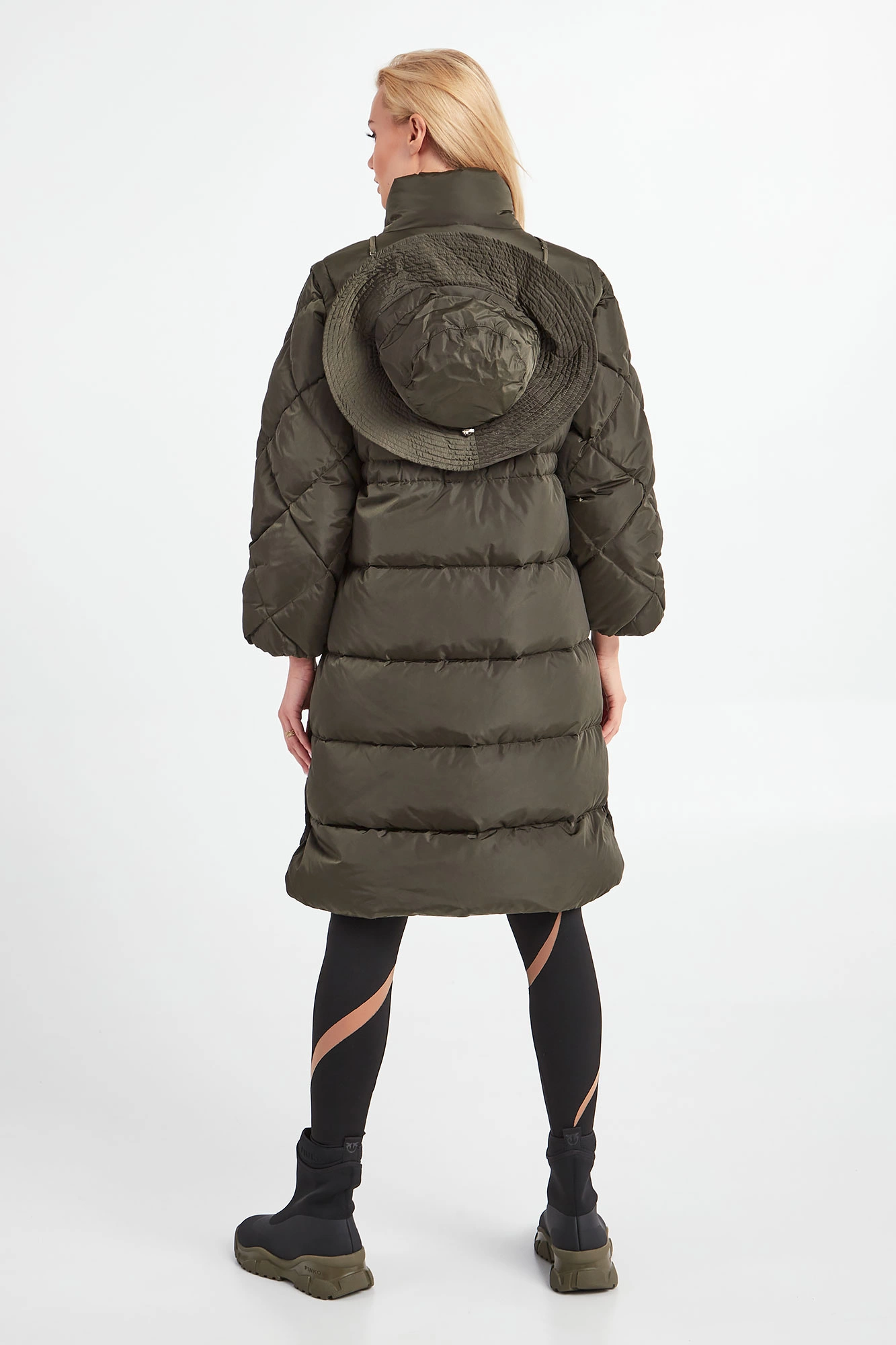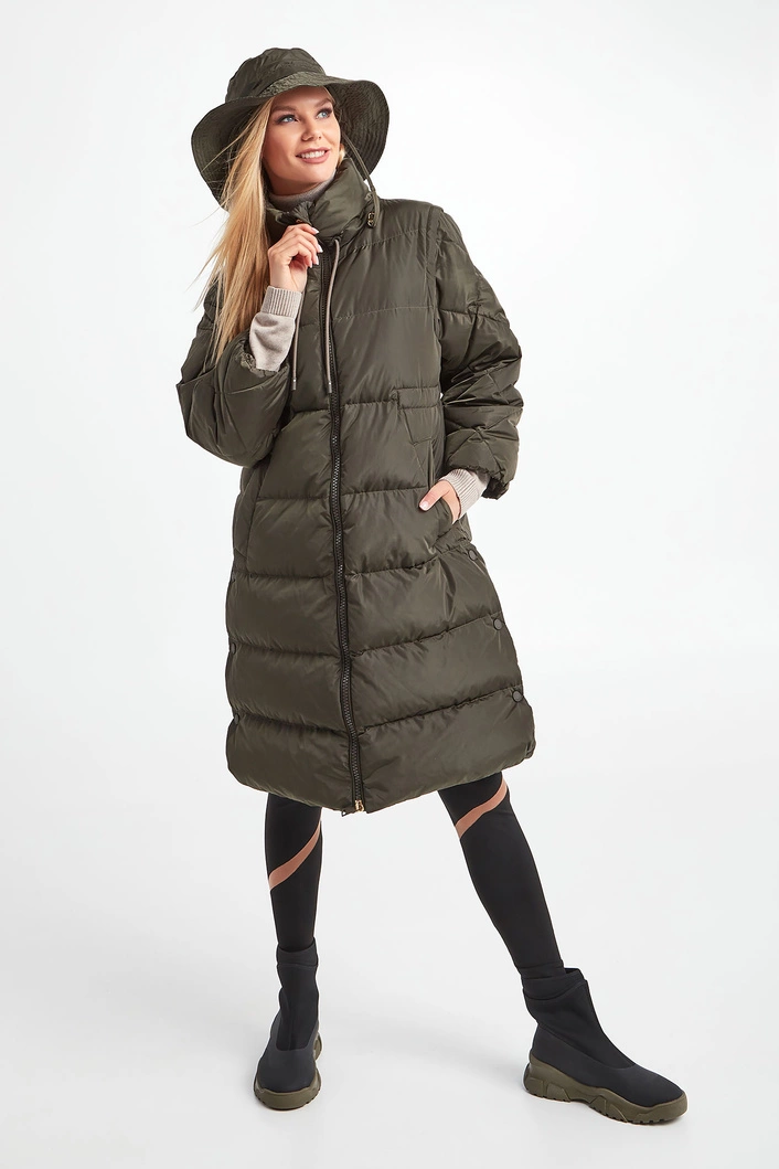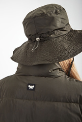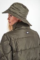 Płaszcz marki Weekend Max Mara w kolorze khaki. Modułowy model, 3w1. Całość pikowana. Zapinany na zamek błyskawiczny w kolorze kurtki. Ze stójką regulowaną z pomocą troczków. W zestawie przypinany kapeluszu w kolorze płaszcza. Model z dwoma zapinanymi na nap kieszeniami. Po bokach rozcięcia zapinane na sygnowane napy w kolorze kurtki. Na linii karku naszywka z logo marki. Możliwość noszenia jako, płaszcz, kamizelka i kapelusz.