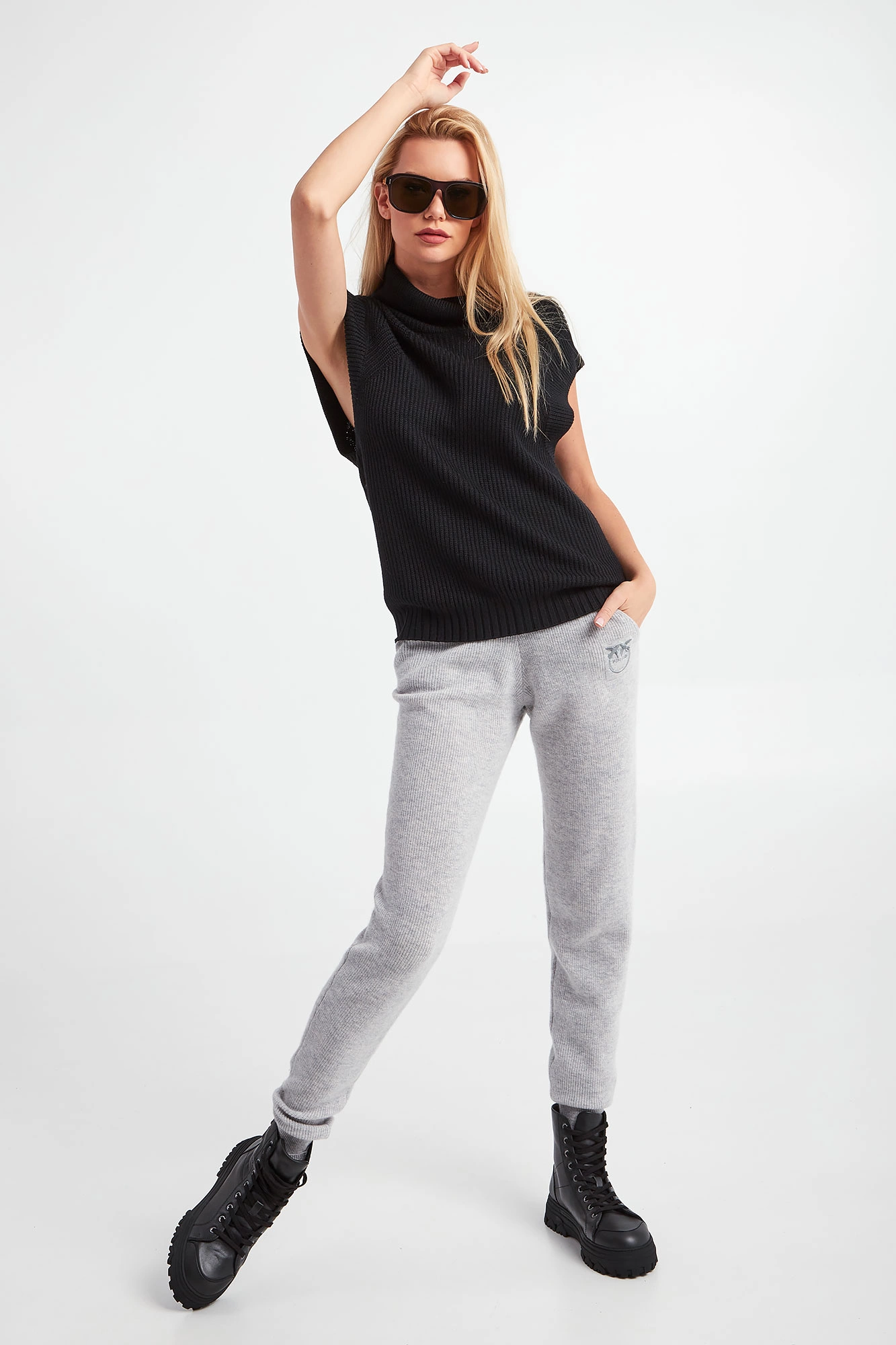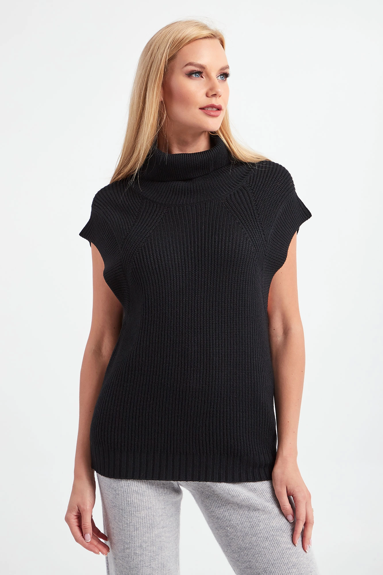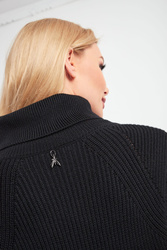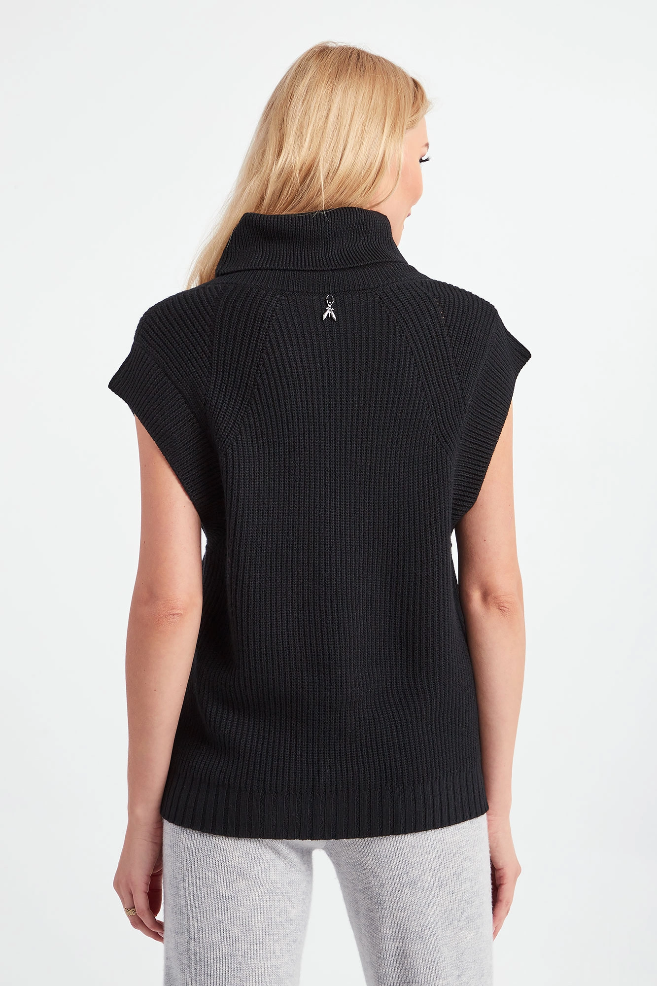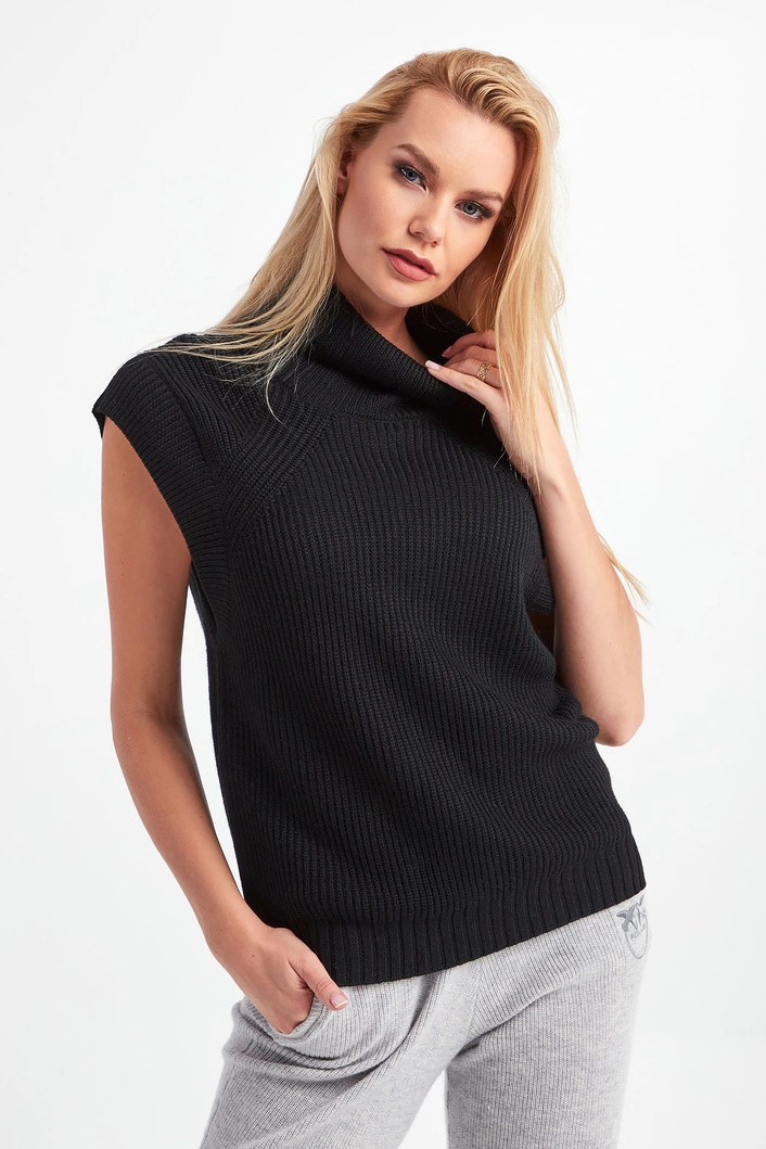 Golf bez rękawów marki Patrizia Pepe w czarnym kolorze. Fason nieco luźniejszy typu relaxed fit. Góra i dół wykończone prążkowanym ściągaczem. Przód i tył swetra gładki. Z tyłu przy dekolcie aplikacja w postaci logo marki. W większości wykonany z wełny.