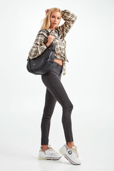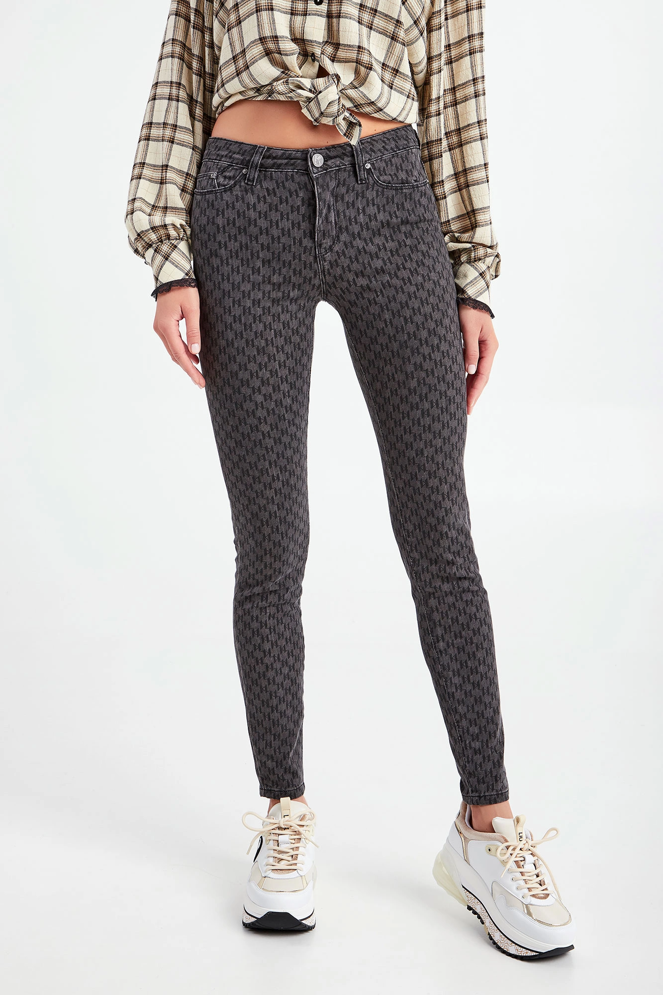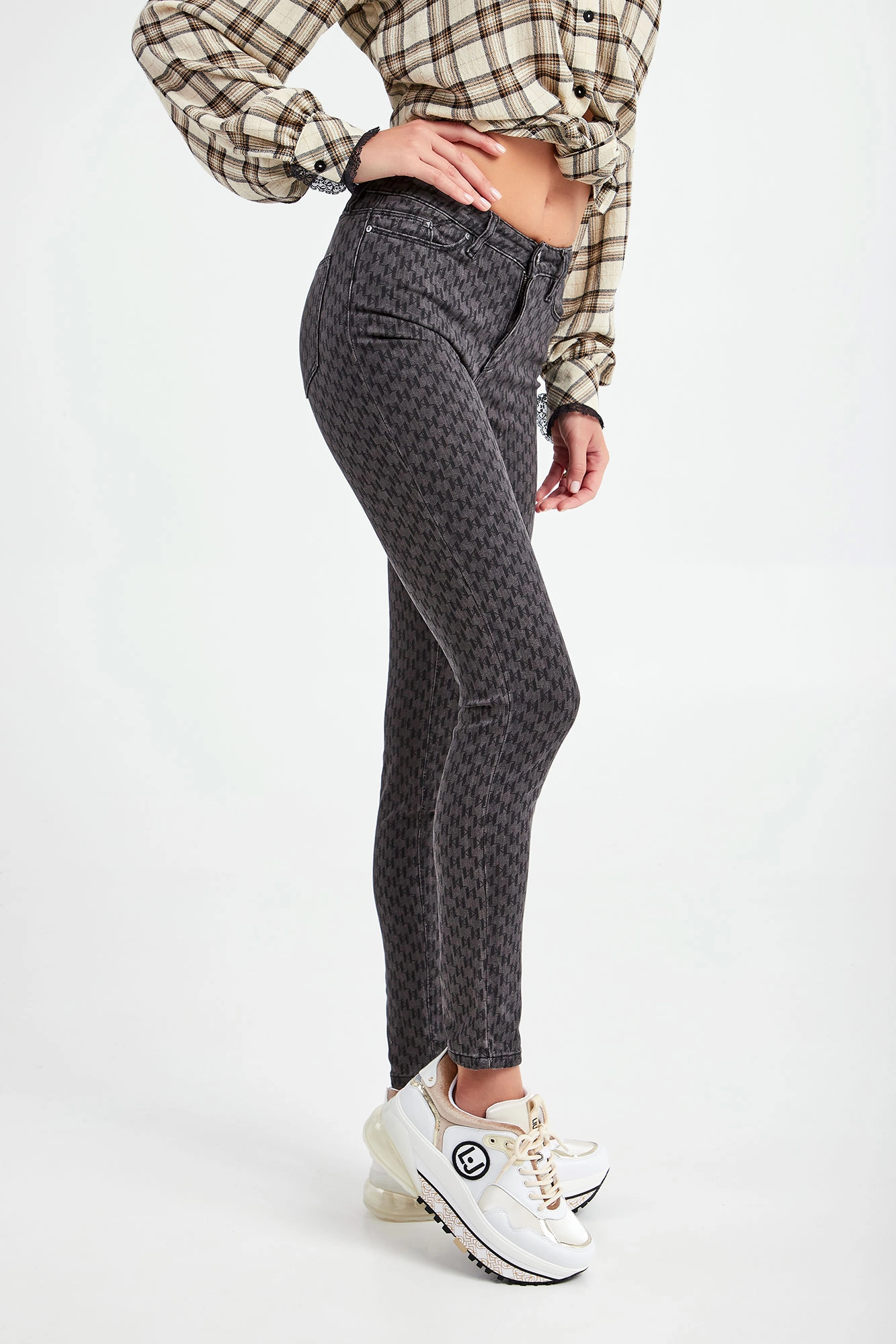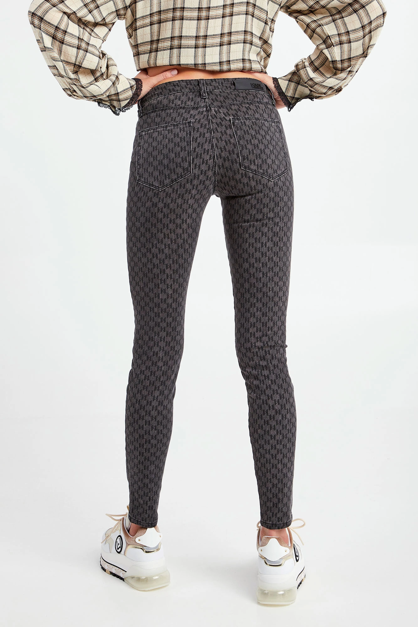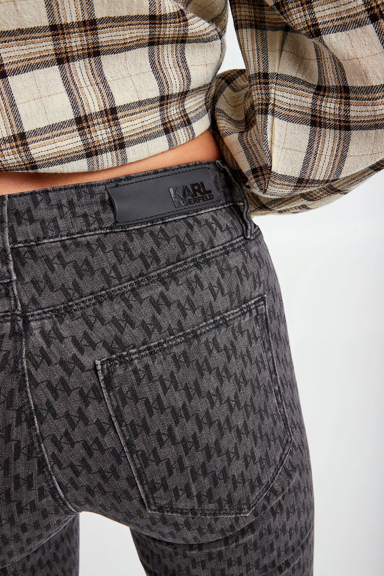 Jeans marki Karl Lagerfeld w szarym kolorze. Fason slim fit. Na całości wzór w postaci monogramu marki. Zapinane na zamek błyskawiczny i duży sygnowany guzik. W pasie szlufki. Model z pięcioma kieszeniami. Z tyłu skórzana naszywka z tłoczoną nazwą marki. Wykonane z elastycznej bawełny.