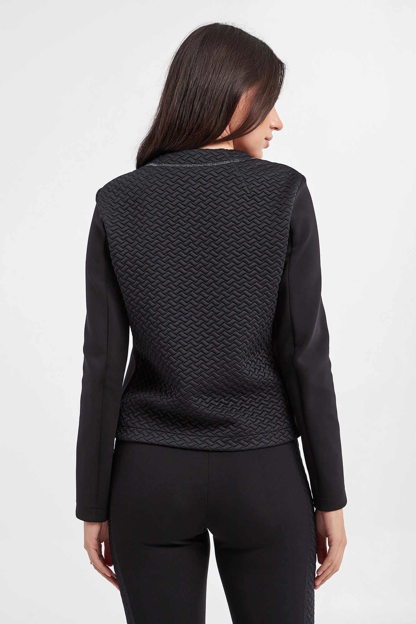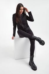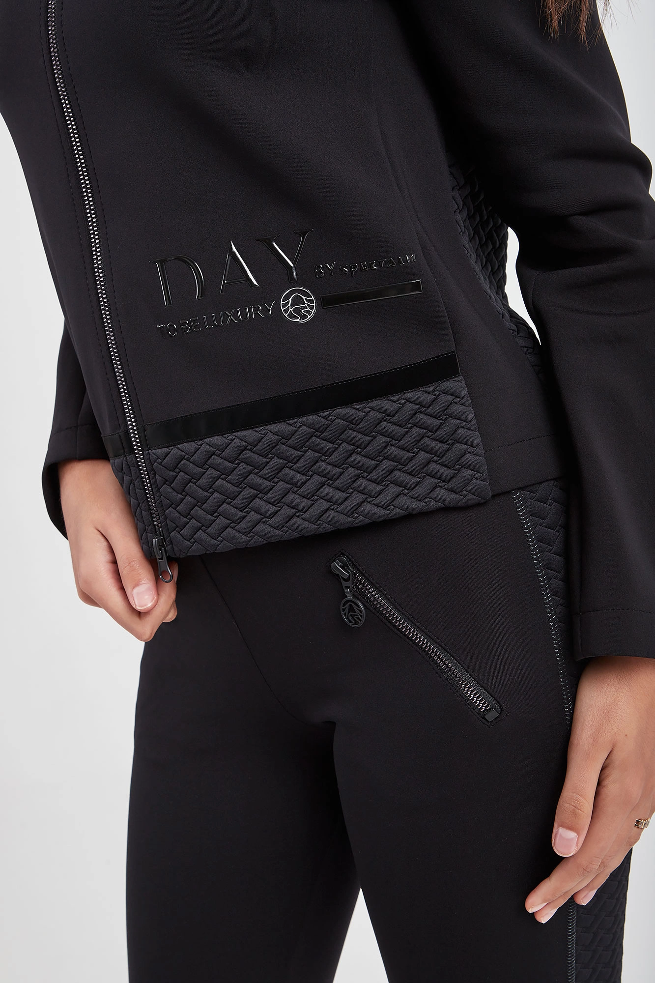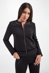 Bluza marki Sportalm w czarnym kolorze. Zapinana za pomocą dwustronnego zamka z sygnowaną zawieszką. Okrągły dekolt. Z boku połyskujący nadruk z logo. Dół i tył wykonany ze strukturalnej tkaniny. Rękawy zakończone lamówką. Bluza wykończona połyskującą nicią. Fason typu regular.