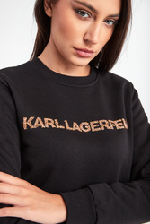 Bluza marki Karl Lagerfeld w czarnym kolorze. Fason typu regular. Okrągły dekolt typu o-neck, długie rękawy i dół wykończone elastycznym ściągaczem. Z przodu, wykonana z nieregularnych kształtem kryształków, nazwa marki w złotym kolorze. Na linii karku niewielki nadruk z nazwą marki w czarnym kolorze. Wykonana z elastycznej, miękkiej bawełny.