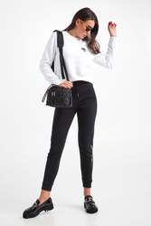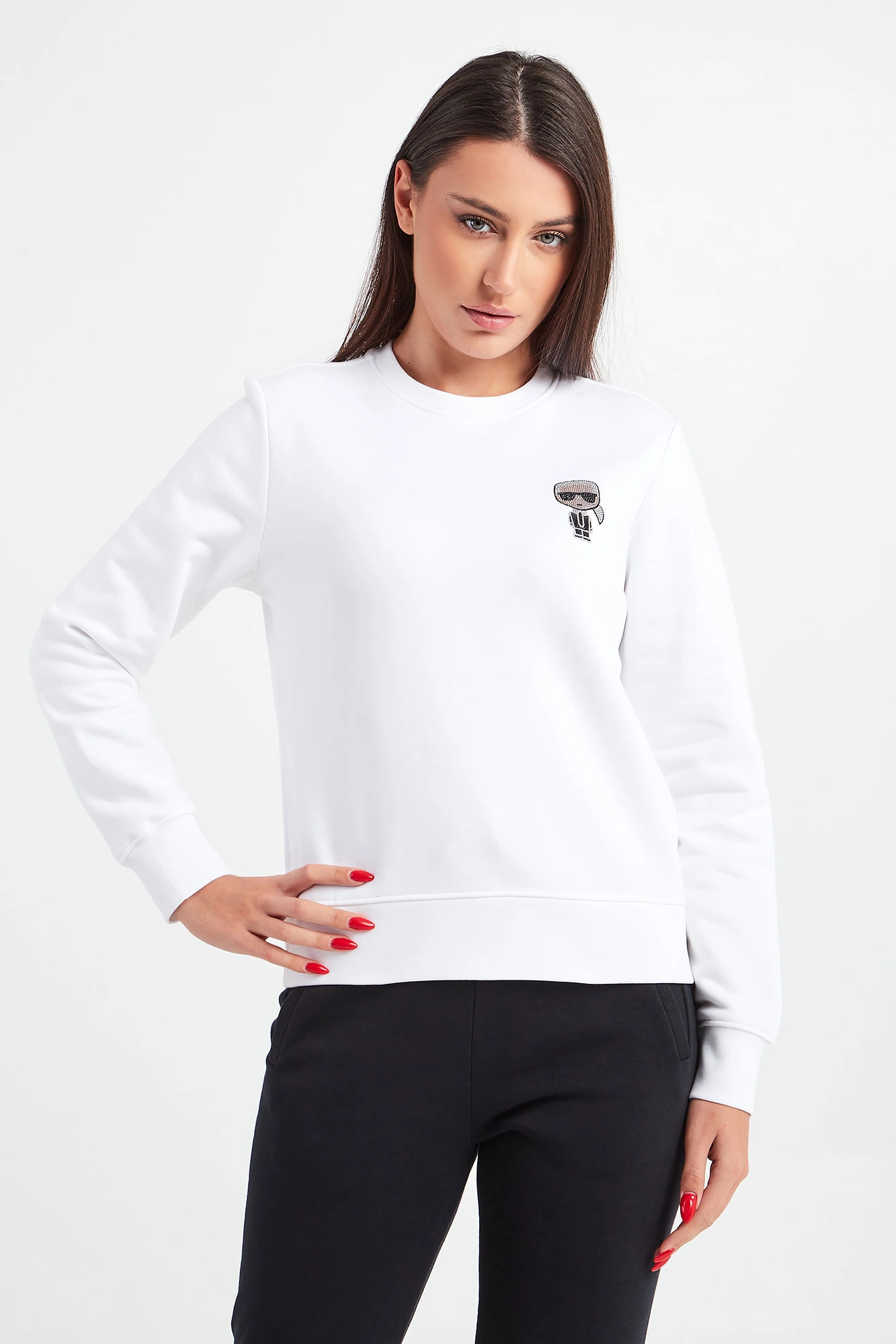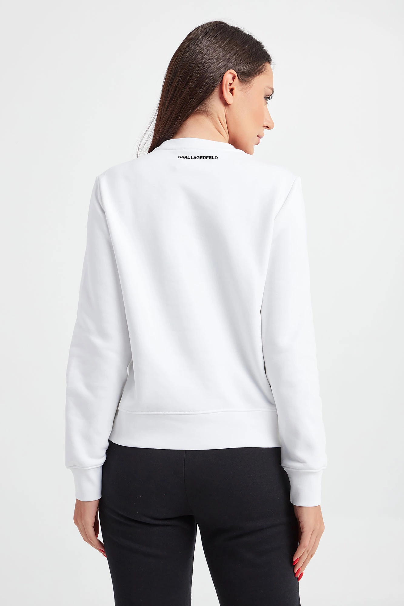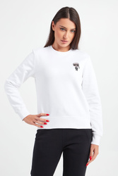 Bluza marki Karl Lagerfeld w białym kolorze. Fason typu regular. Okrągły dekolt typu o-neck, długie rękawy i dół wykończone elastycznym ściągaczem. Z przodu wykonana z kolorowych cyrkonii postać założyciela marki. Na linii karku niewielki nadruk z nazwą marki w kontrastowym czarnym kolorze. Bluza z linii Ikonik. Wykonana z elastycznej, miękkiej bawełny.
